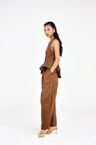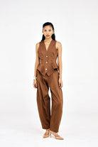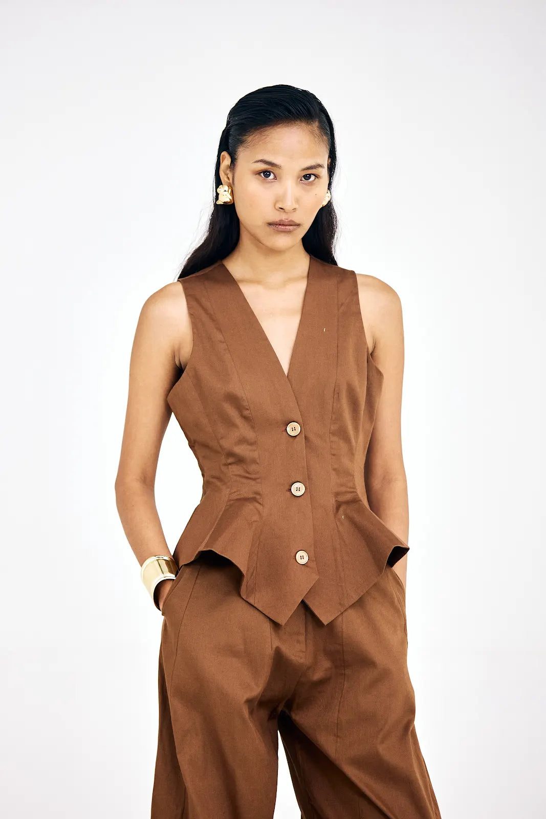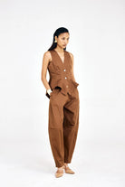 This mocha co-ord set features a button-down waistcoat paired with matching barrel pants, both crafted in cotton twill. The waistcoat is designed with a cinched waist and button detailing that accentuates a tailored, form-fitted look, while the pants offer a relaxed yet structured silhouette. A versatile addition to your wardrobe, this set is a must-have this fall-winter.
