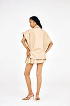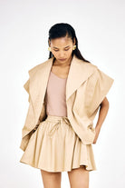 The Beige Co-ord Set features a short asymmetrical jacket crafted in cotton twill, paired with a matching mini skirt. The skirt has a relaxed fit with subtle waist detailing, creating a coordinated and modern look. Together, the set strikes the right balance between structure and ease, perfect for days you want to keep it polished yet playful.