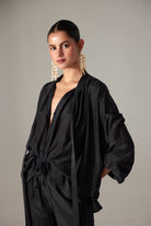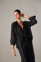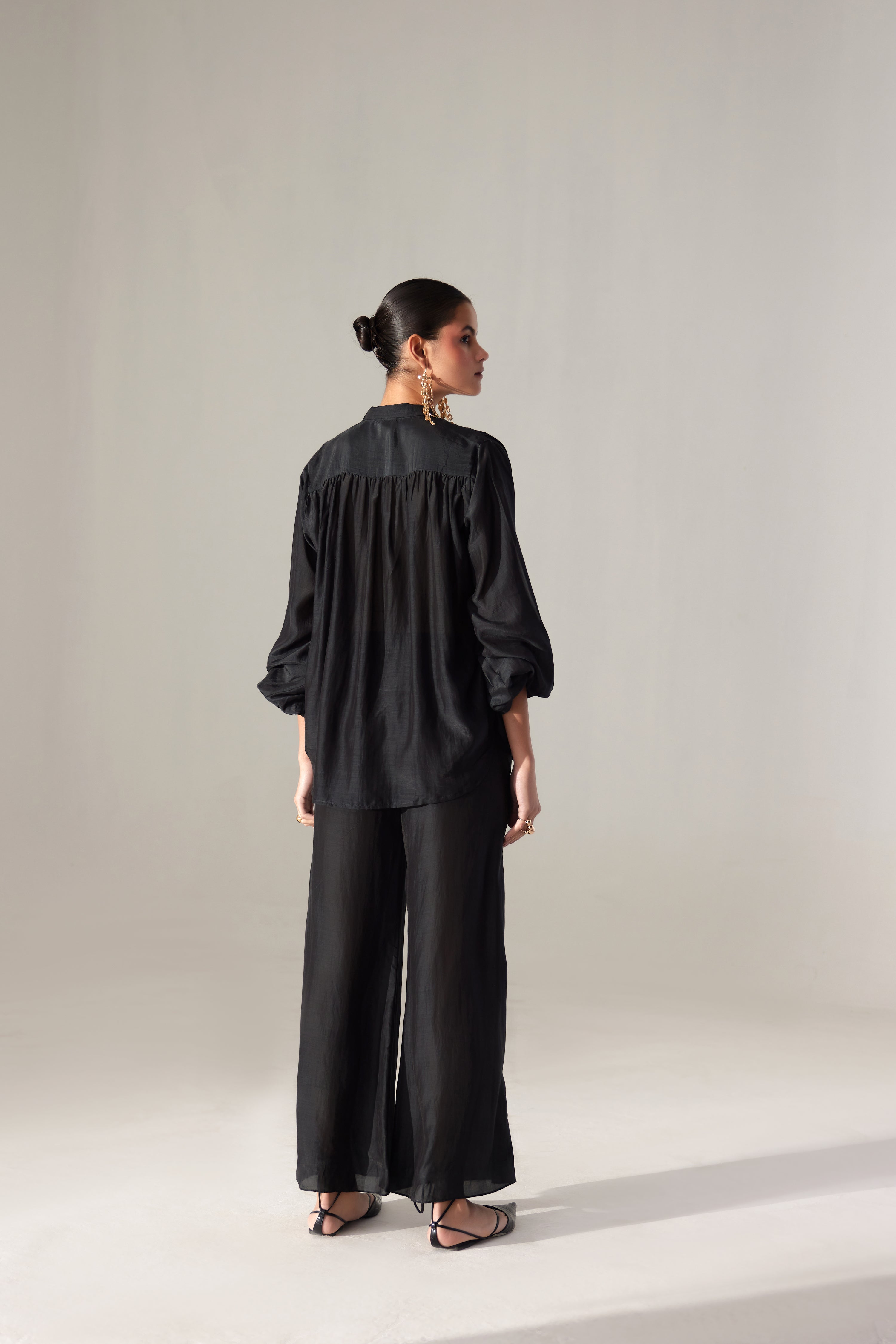 Introducing Nicole set, From everyday essentials to statement-makers.Relaxed fit Lisa long sleeve blouse a collar and gathering throughout.strap attached to collar for tie up elasticated sleeve cuffs with Alicia pant. Soft, lightweight, relaxed fit ,flared bottom made in cotton silk fabric The Pant have an elasticated waistband, drawstring tie ip in front and side pockets.