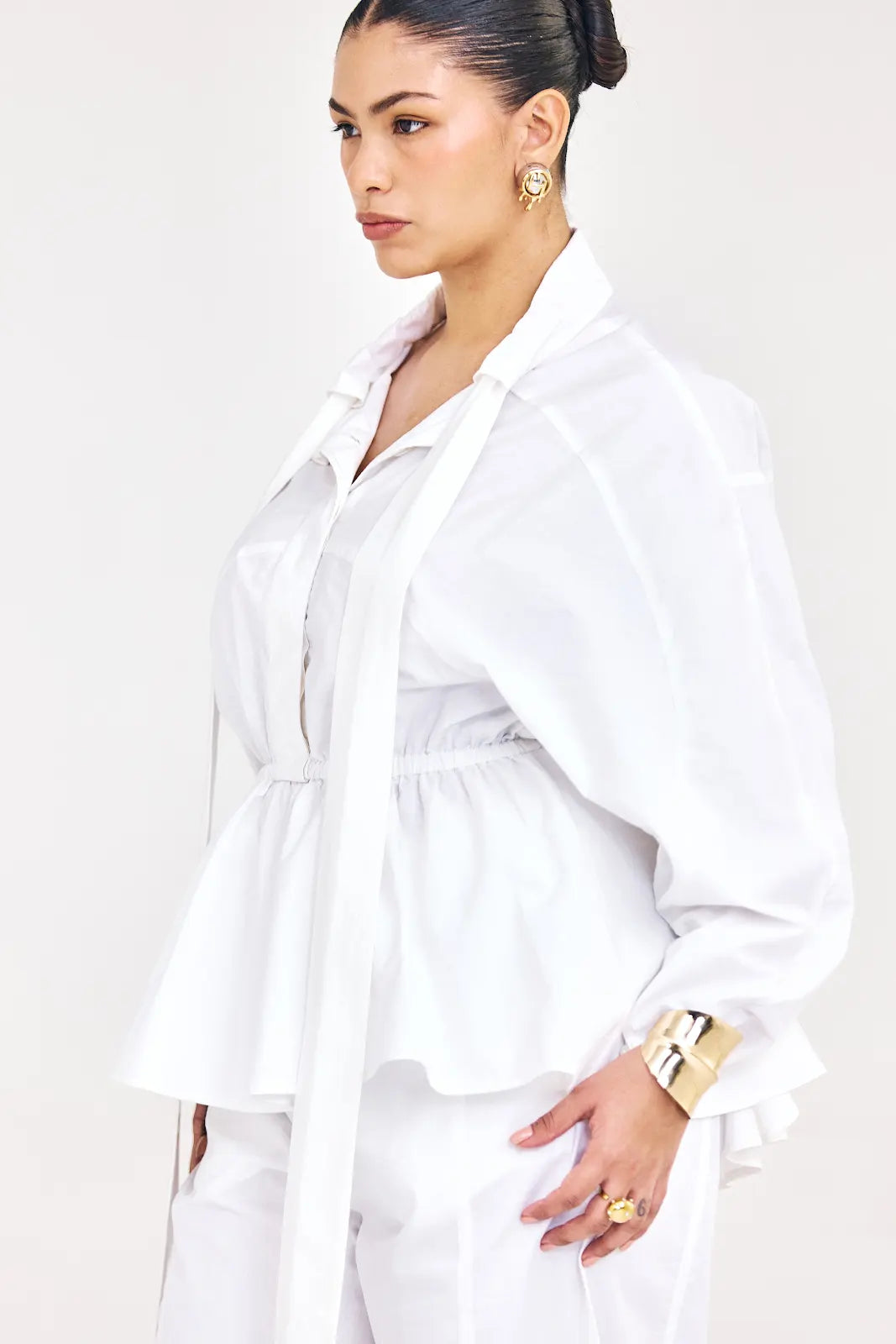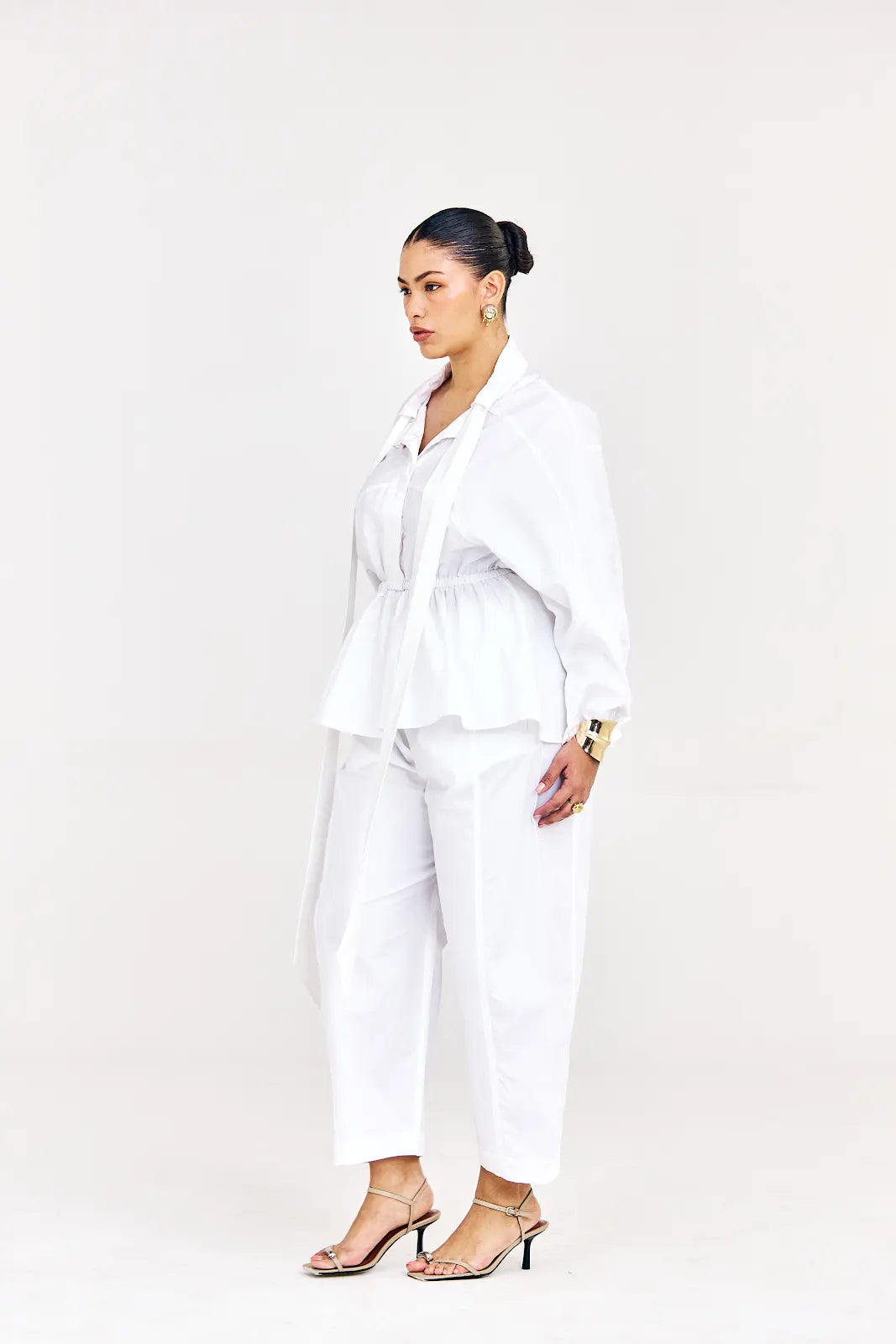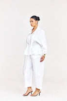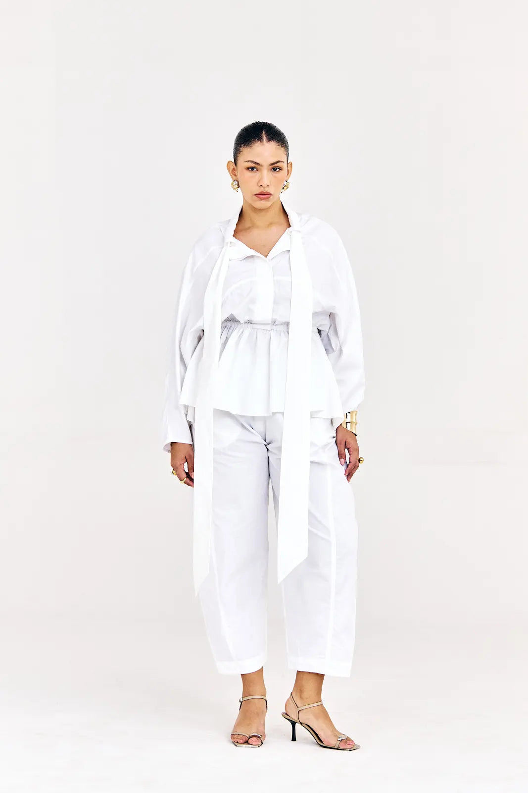 A modern take on classic tailoring, this set features a structured shirt with a deep neckline, soft draping, and a peplum-style back, Effortlessly sophisticated from every angle.