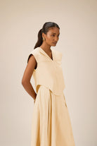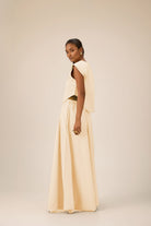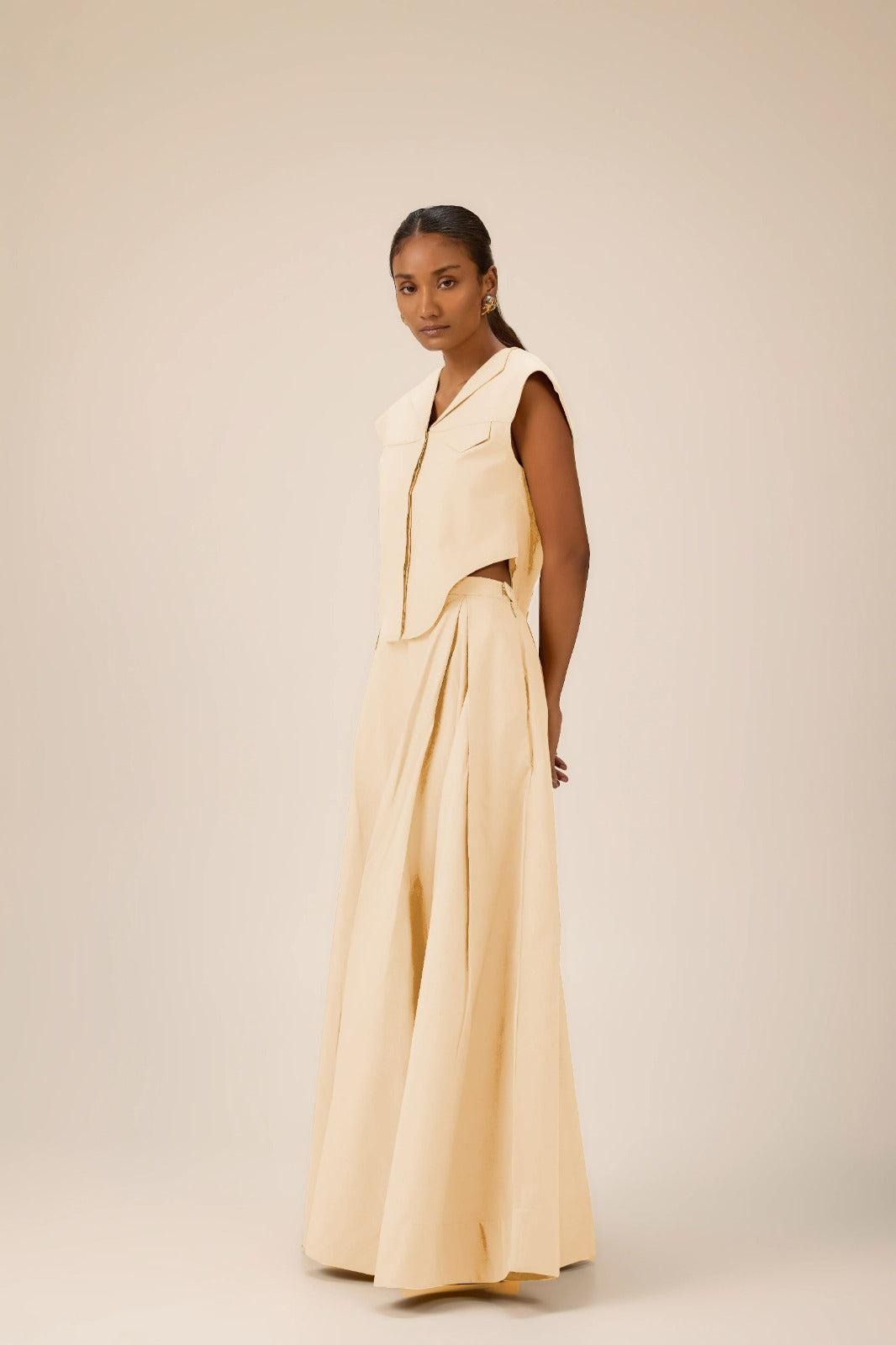 A structured vest pairs with a flowing maxi skirt, creating a balanced silhouette that is both refined and effortless, perfect for modern elegance with a touch of ease.