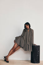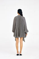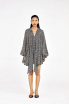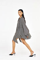 This relaxed, flowy dress features full bishop sleeves, a flattering V-neckline, and delicate tie-up detailing. Crafted in a lightweight fabric, its abstract print adds a modern, artistic touch, making it perfect for casual outings, brunches, or elevated daywear.