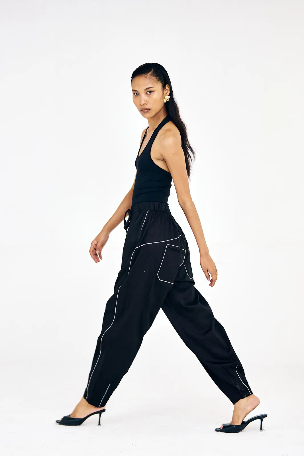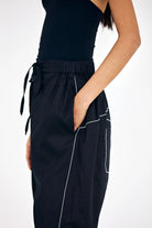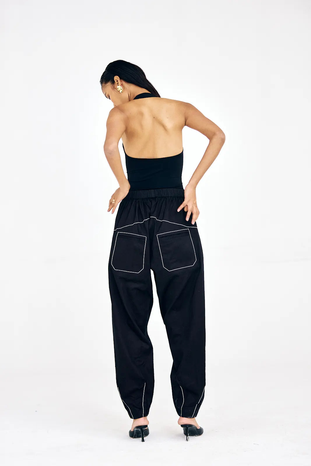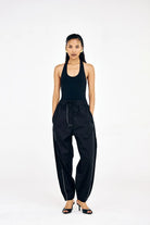 These black pants in cotton twill feature a relaxed fit with subtle topstitch detailing. Designed to balance comfort and structure, they’re a versatile wardrobe staple that can transition from relaxed days to elevated evenings.