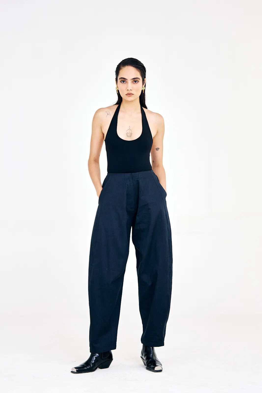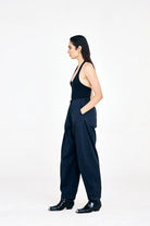 Crafted in cotton twill, these navy blue barrel pants feature a relaxed fit with functional side pockets for everyday ease. Designed for versatility, they pair well with simple tank tops or can be styled with the matching navy blue waistcoat for a coordinated look.