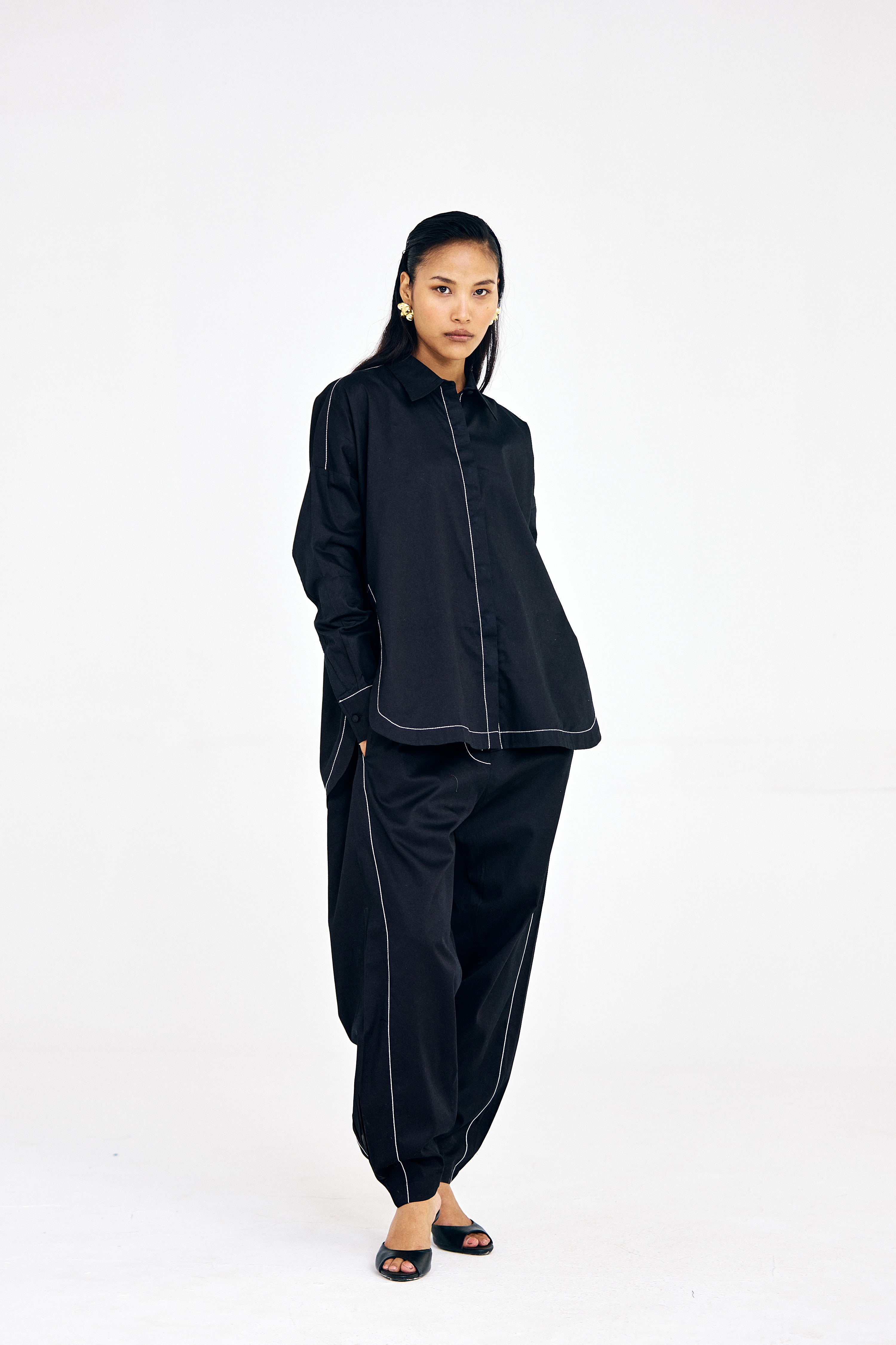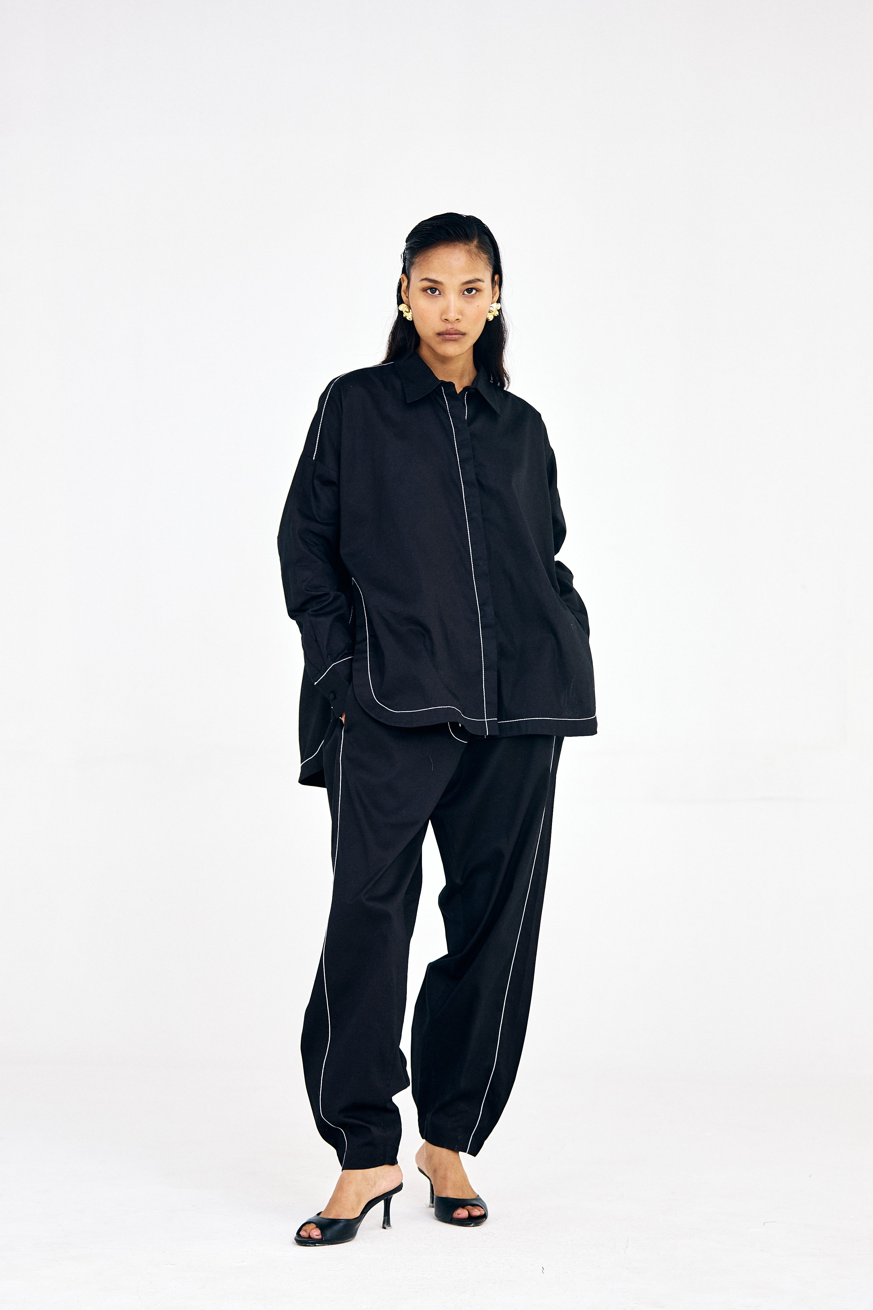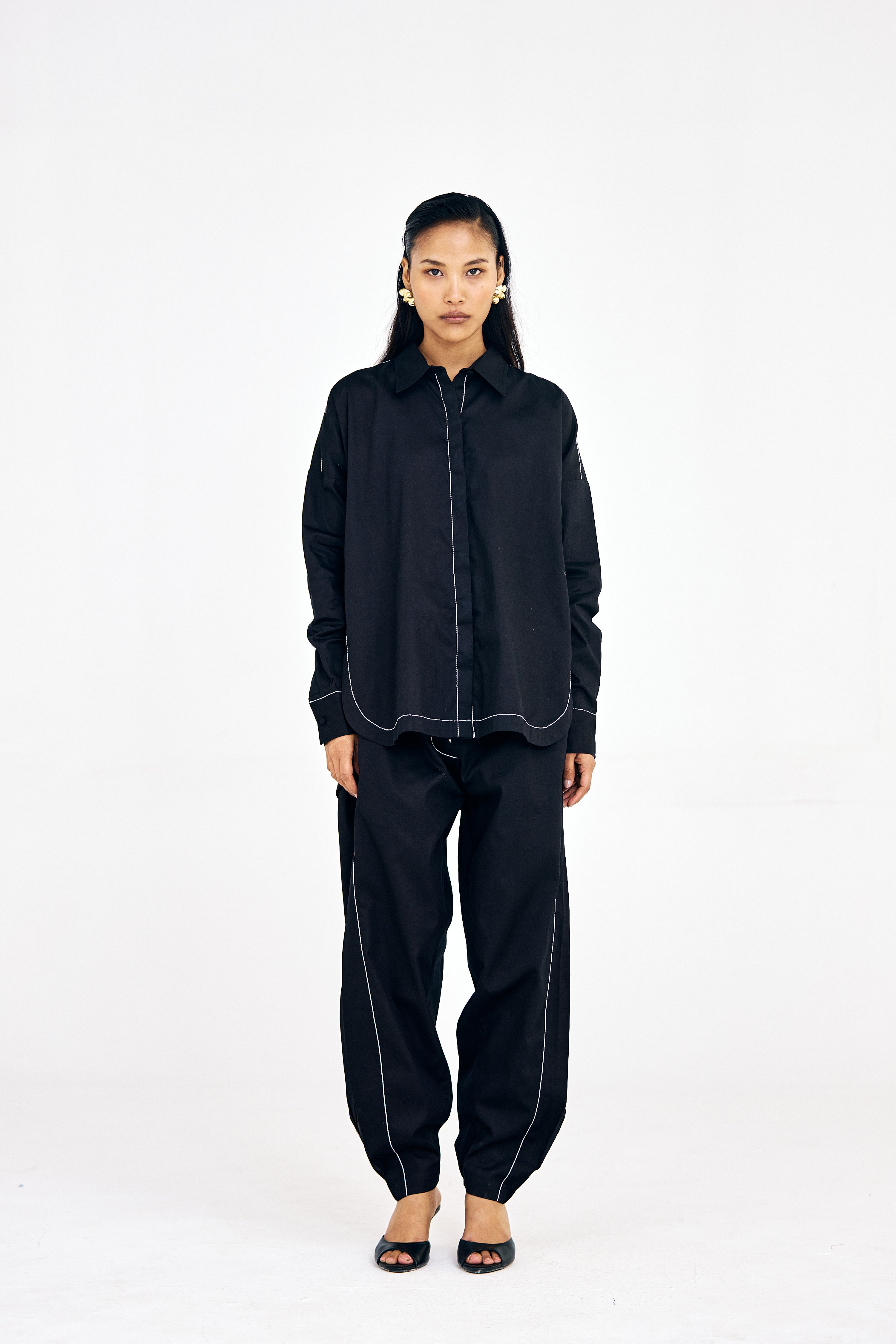 This full-sleeve black shirt features subtle topstitch detailing and a relaxed fit. An elevated take on the classic black shirt, it’s versatile enough to be dressed up or down, depending on the mood and ocassion.These black pants in cotton twill feature a relaxed fit with subtle topstitch detailing. Designed to balance comfort and structure, they’re a versatile wardrobe staple that can transition from relaxed days to elevated evenings.