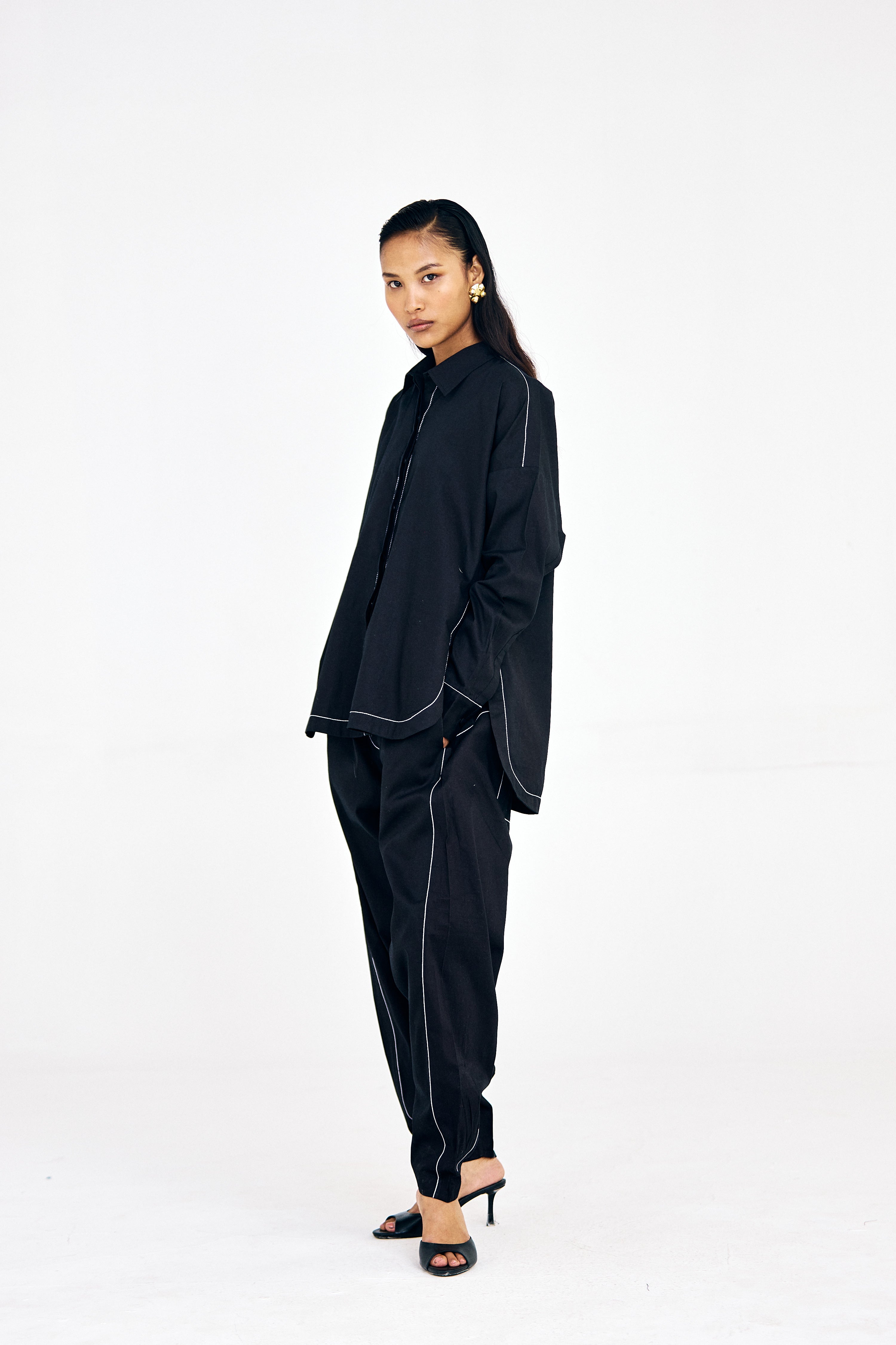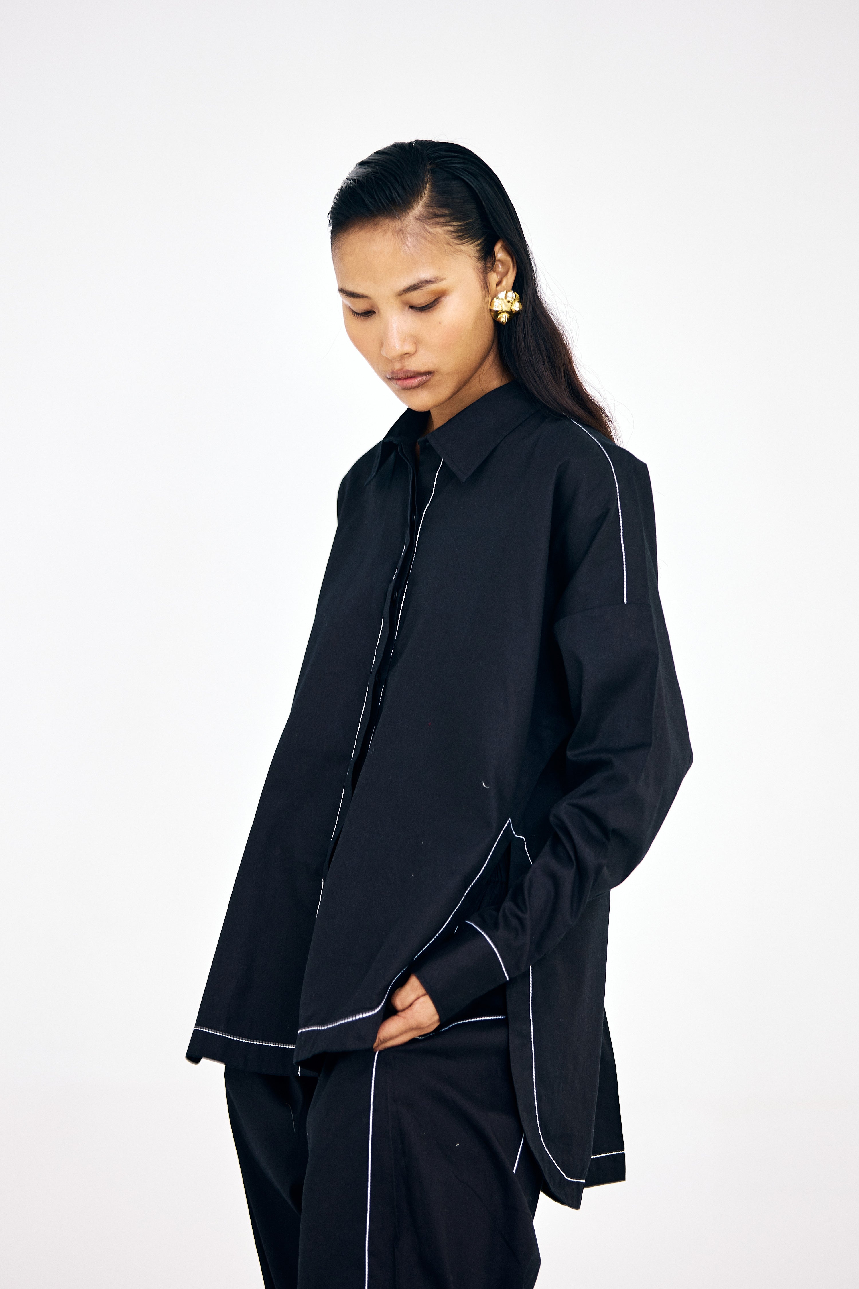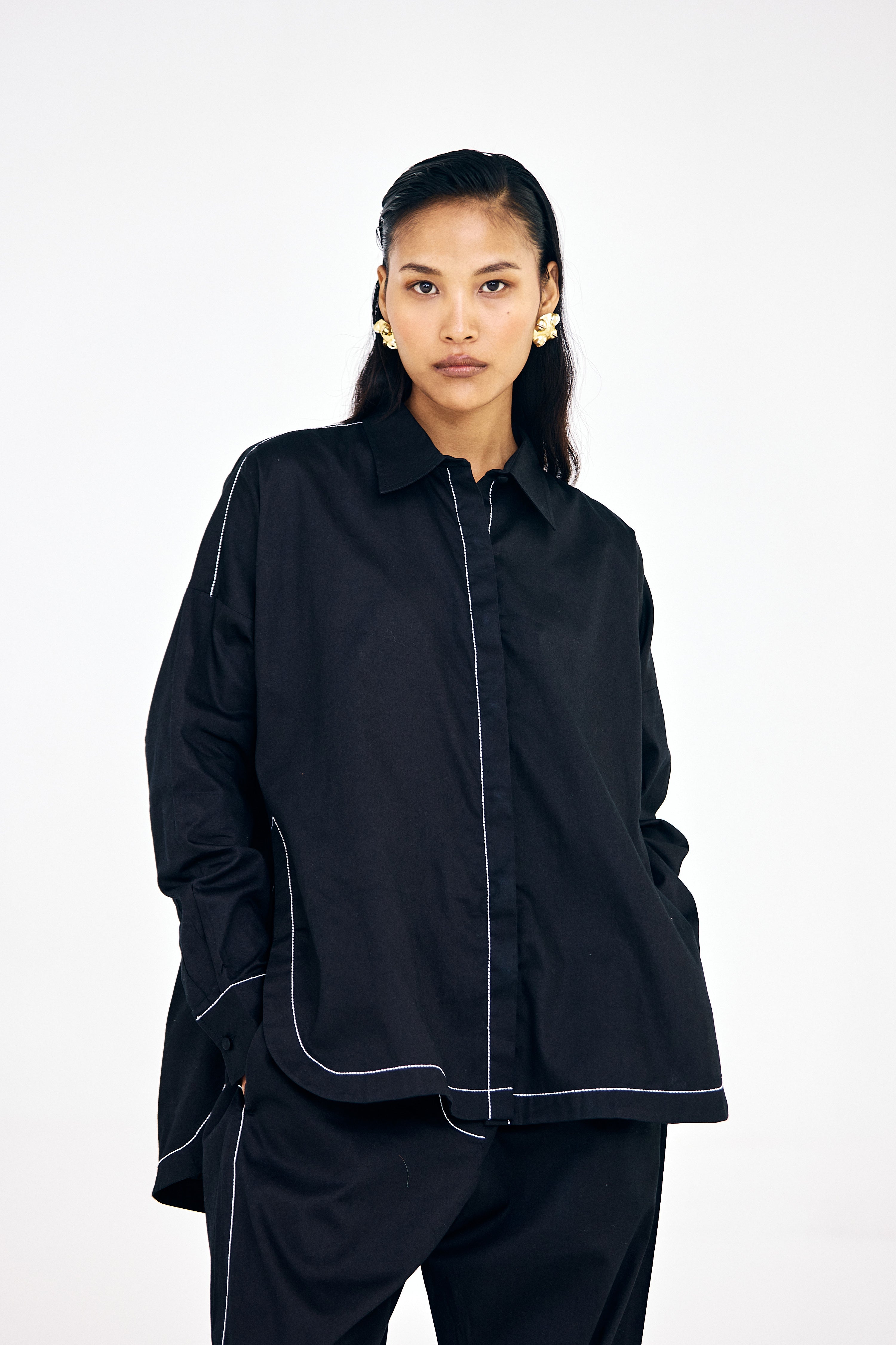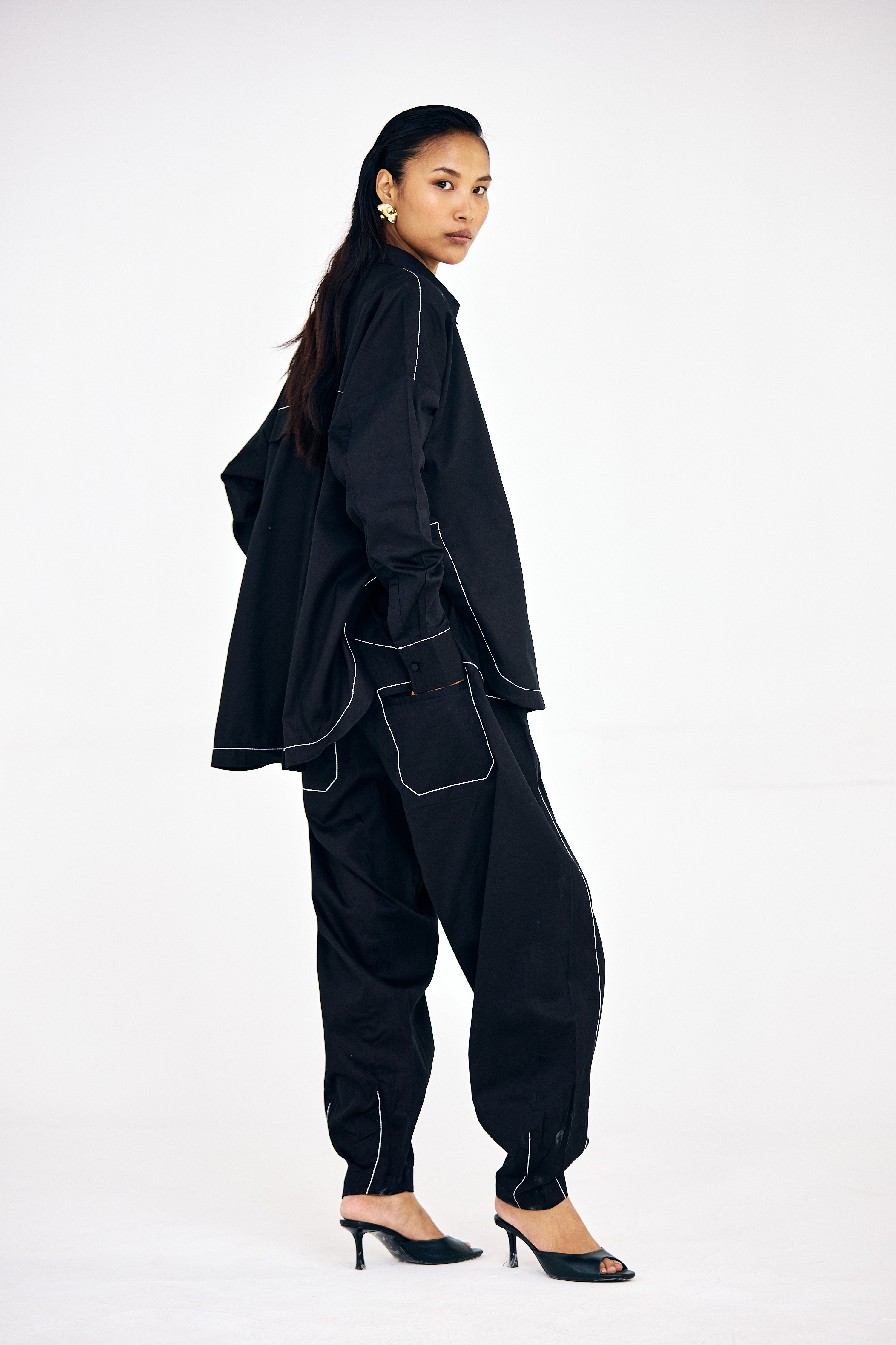 This full-sleeve black shirt features subtle topstitch detailing and a relaxed fit. An elevated take on the classic black shirt, it’s versatile enough to be dressed up or down, depending on the mood and ocassion.These black pants in cotton twill feature a relaxed fit with subtle topstitch detailing. Designed to balance comfort and structure, they’re a versatile wardrobe staple that can transition from relaxed days to elevated evenings.
