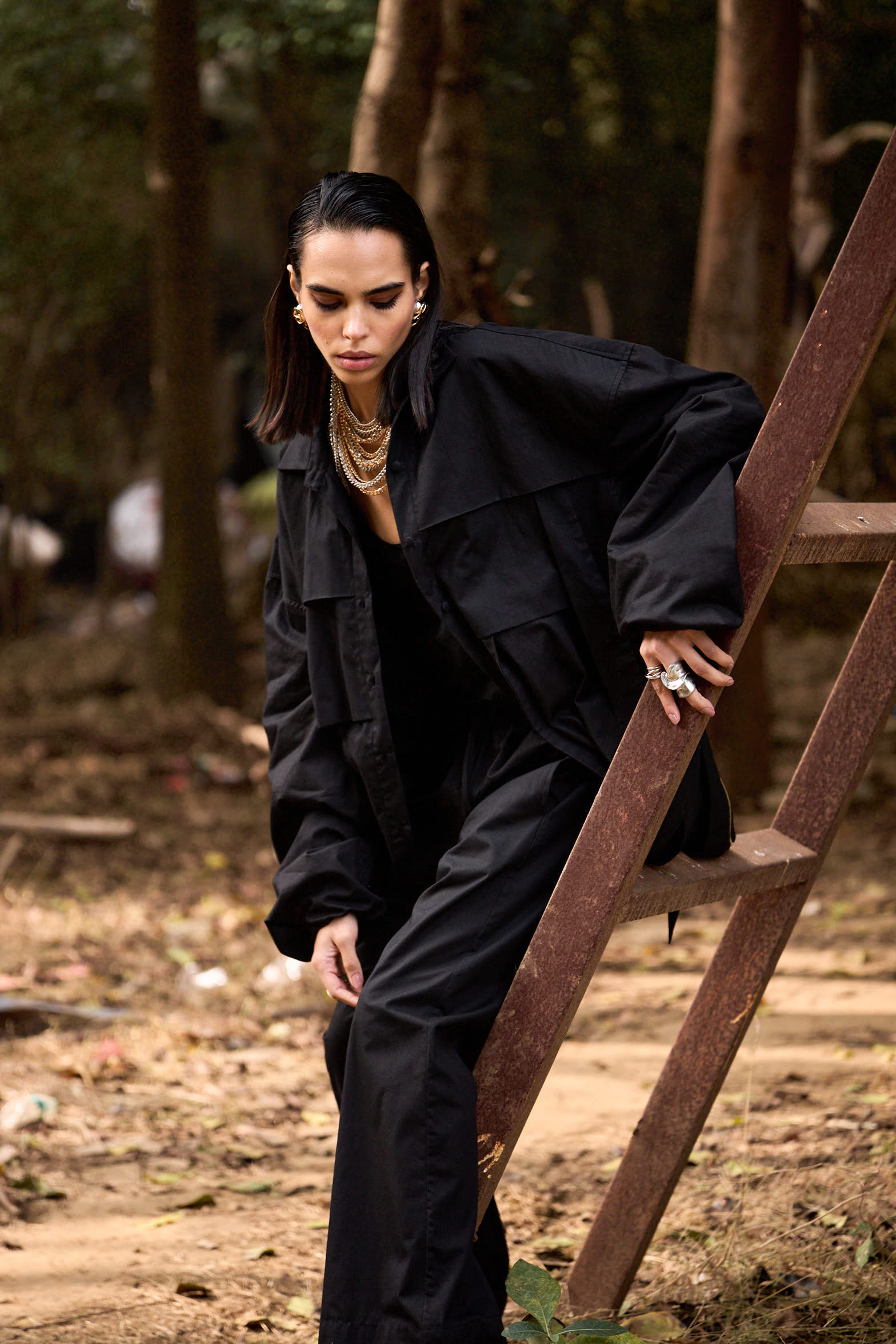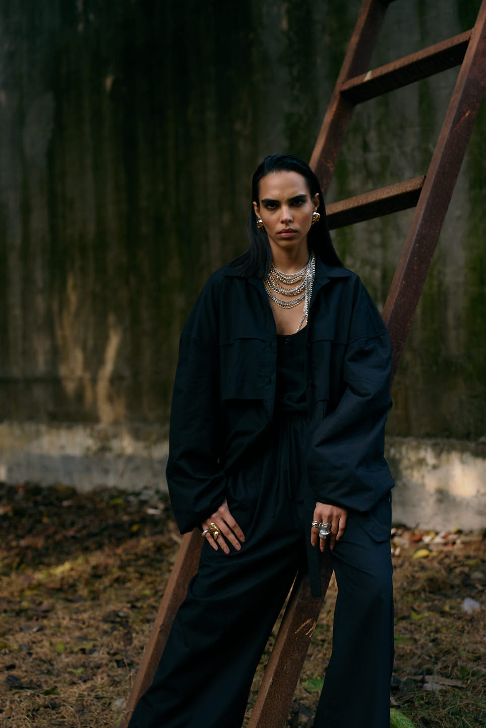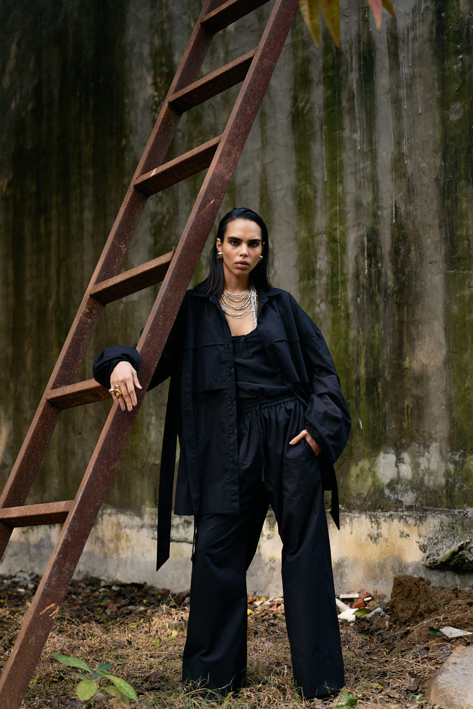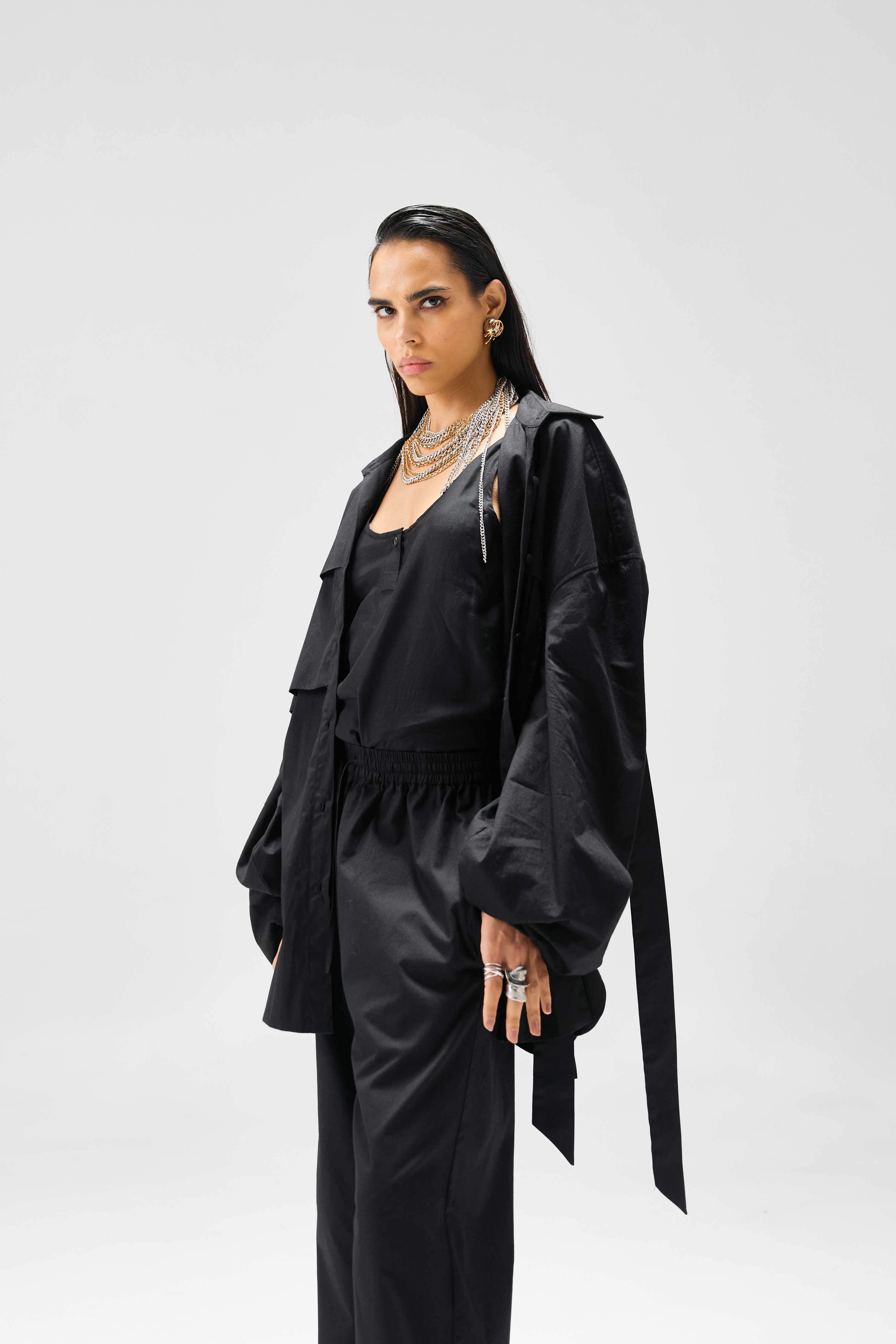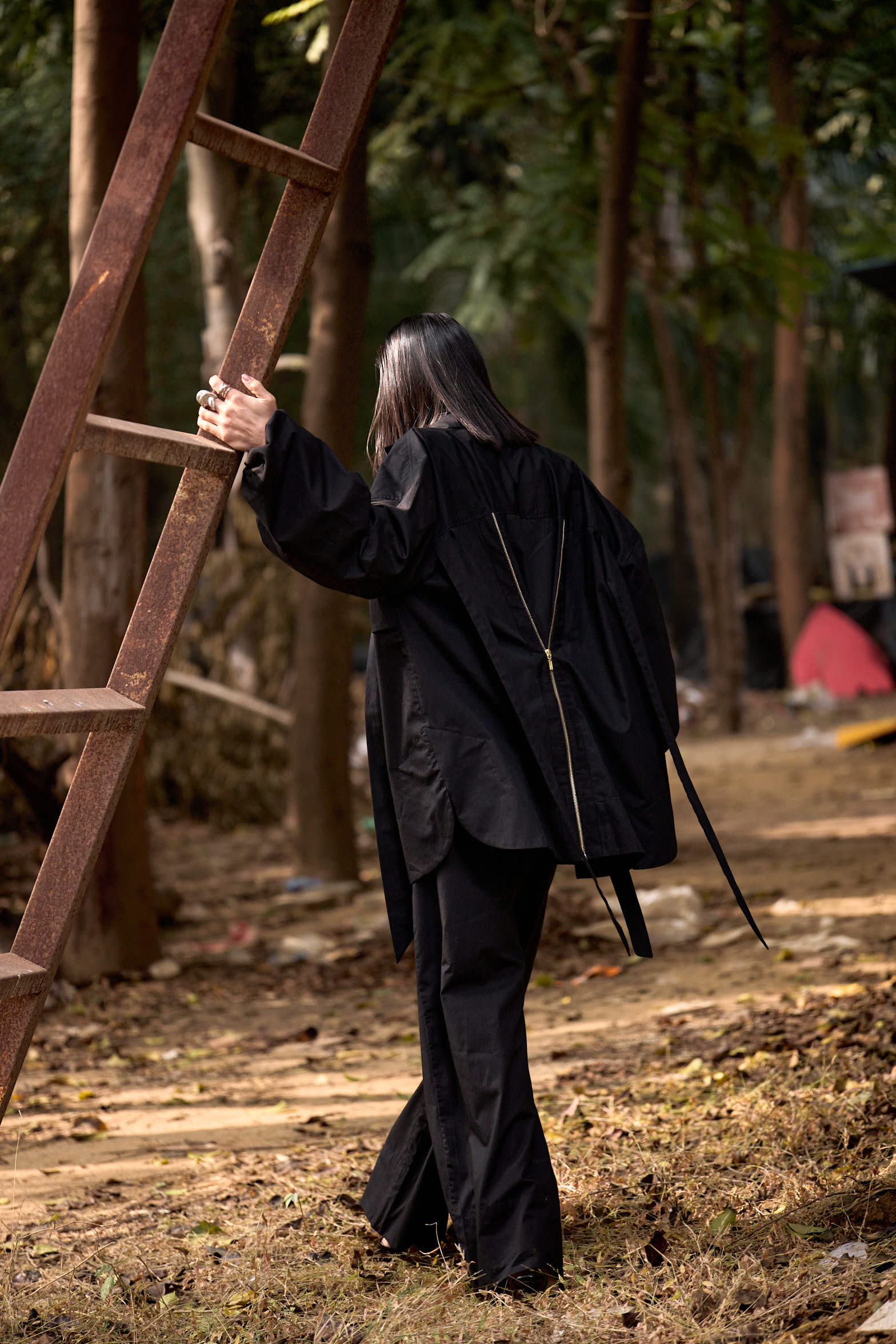 This coordinated set features an oversized jacket with a unique zipper detail at the back,paired with a sleek tank top and tailored drawstring pants, it offers a harmonious blend of structure and comfort, making it a standout choice for versatile styling.
