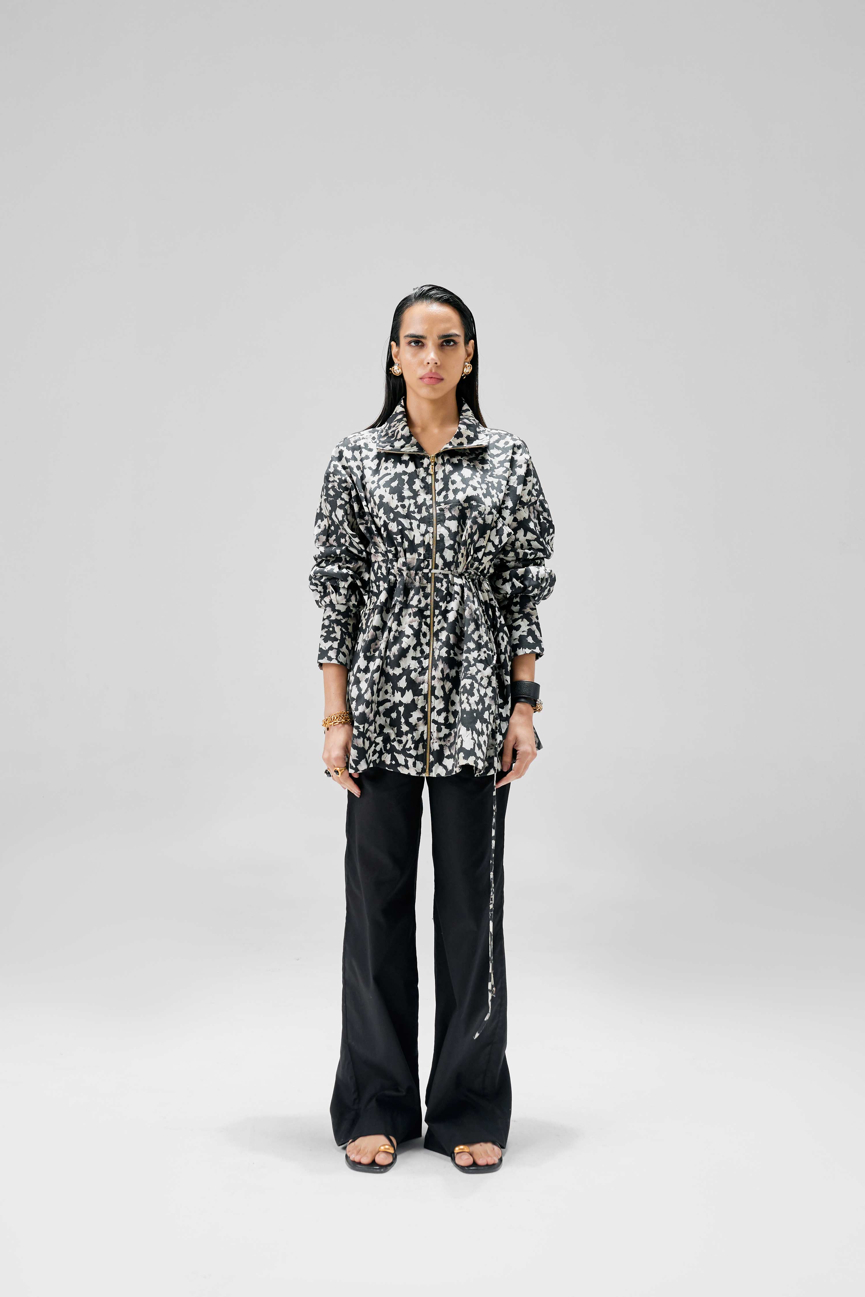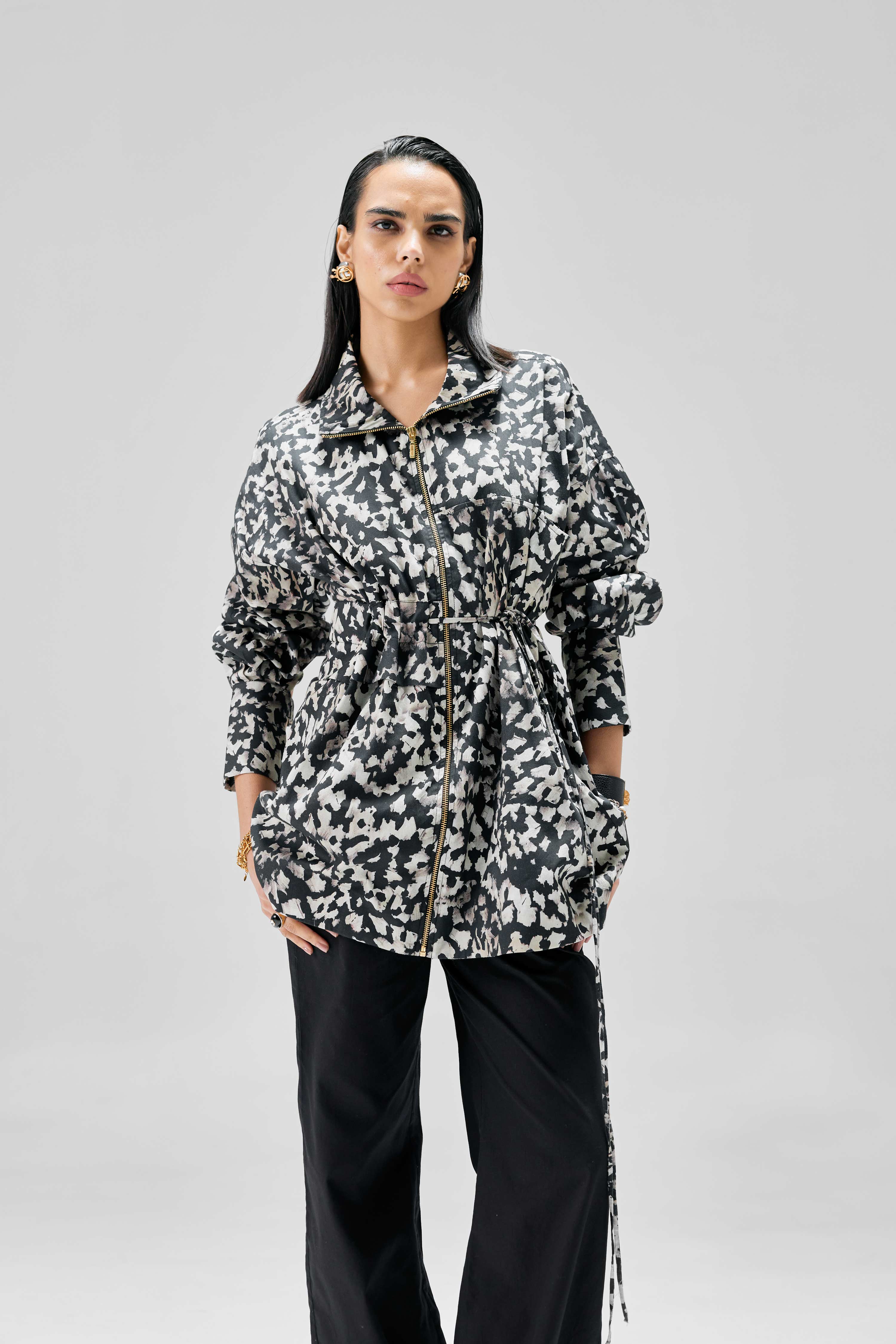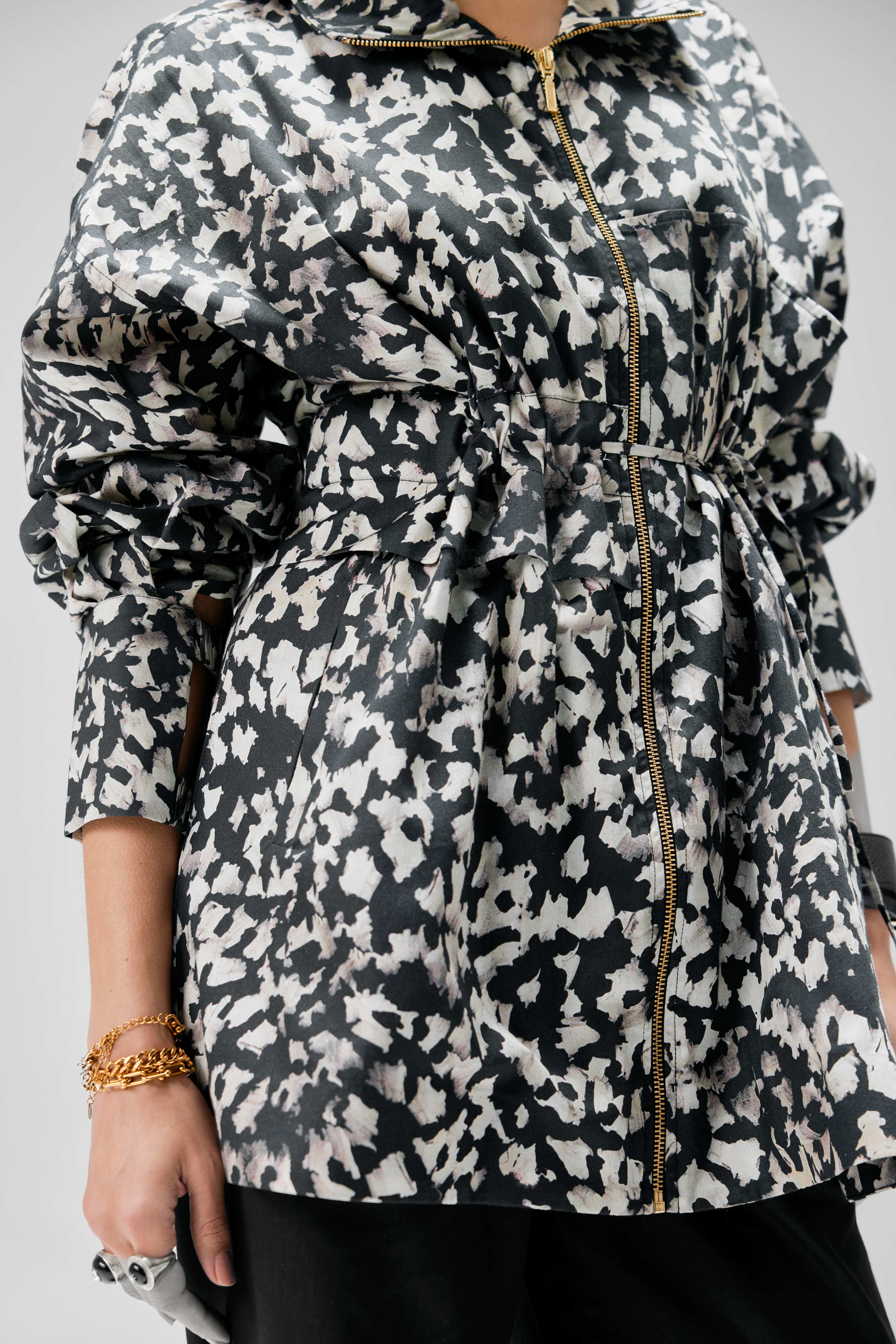 This drawstring jacket features a dynamic abstract black-and-white print. It has long sleeves with buttoned cuffs, a front zipper closure, and a cinched waist enhanced by an adjustable drawstring for a flattering fit. The lightweight fabric makes it perfect for layering, combining style and functionality for everyday wear.