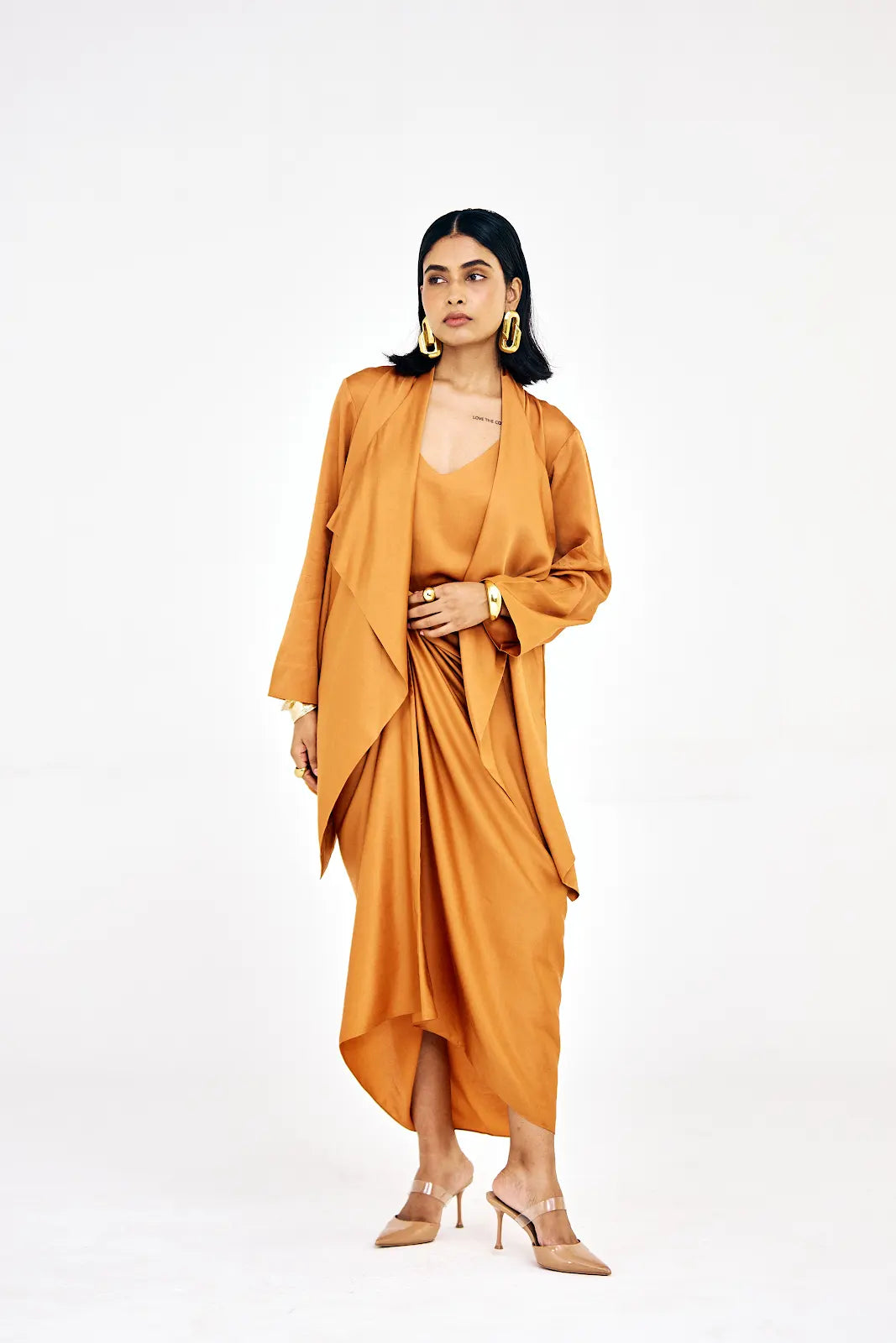 Elevate your style with Nouria's must-have Tieup Dress The bottom sarong skirt can be tied up in multiple ways that looks stunning on all versatile body silhouettes paired with Eka Short waterfall Jacket over it to complete the look. This jacket serves as the perfect complement to its matching dress, creating an ensemble that's ideal for a perfect special occasion.