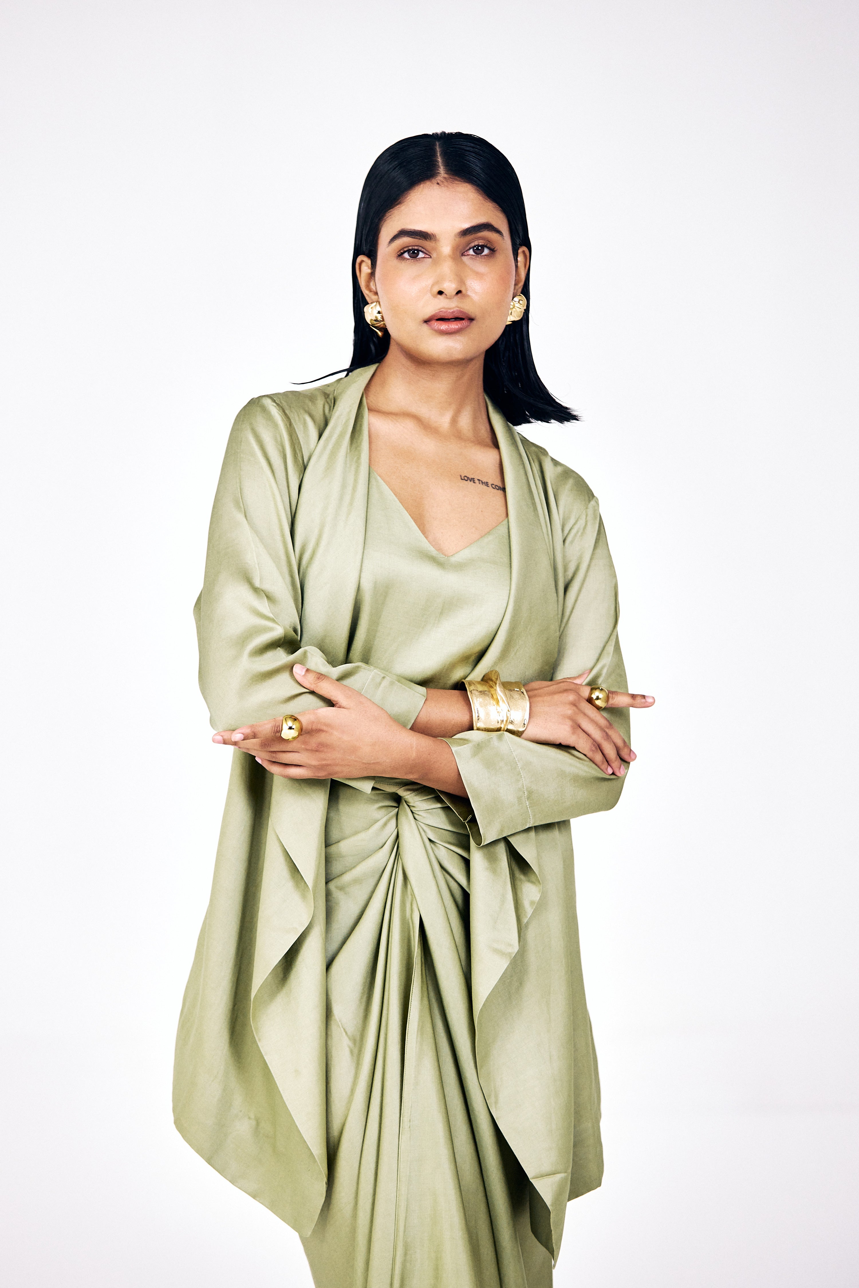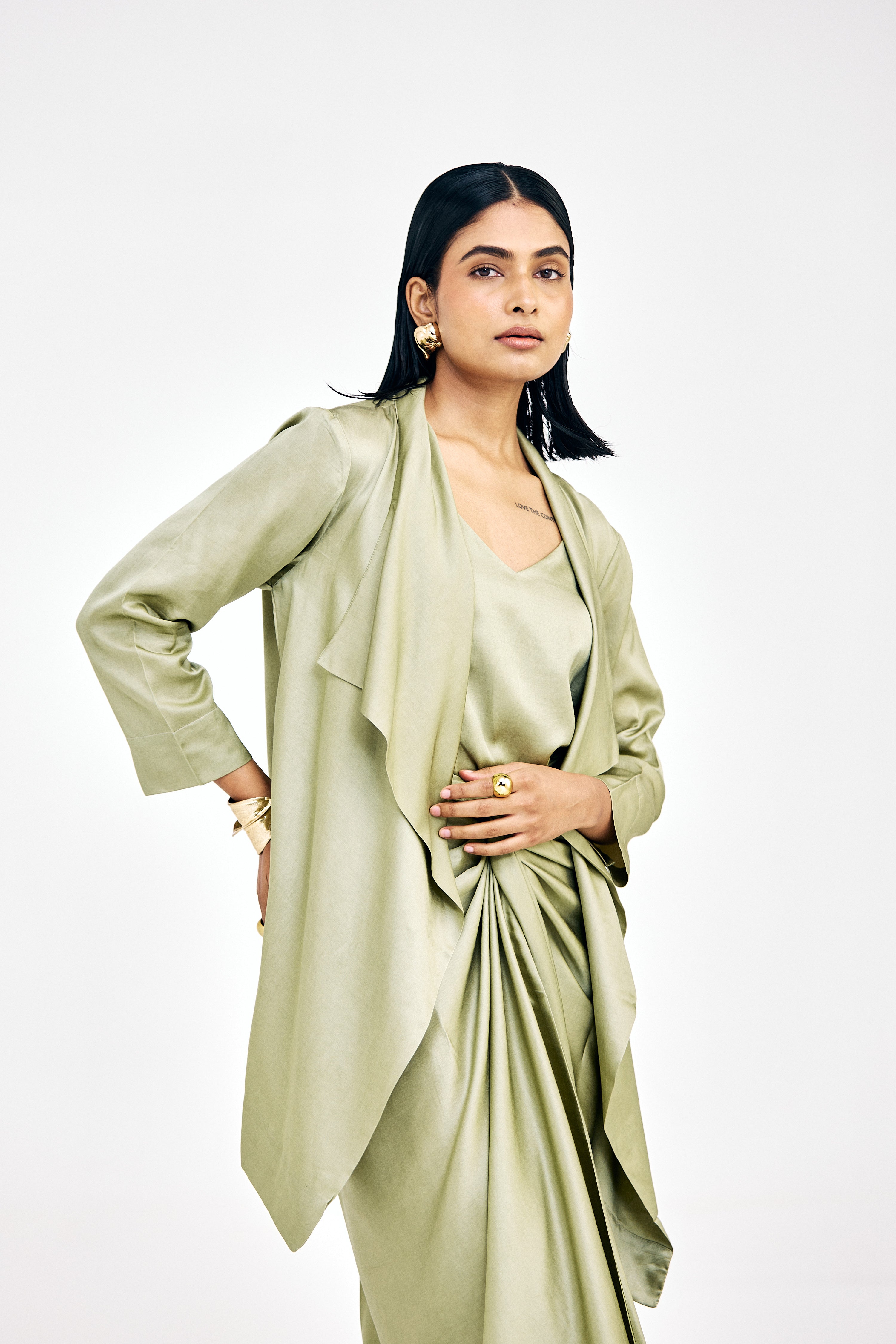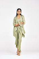 Elevate your style with Nouria's must-have Tieup Dress The bottom sarong skirt can be tied up in multiple ways that looks stunning on all versatile body silhouettes paired with Eka Short waterfall Jacket over it to complete the look. This jacket serves as the perfect complement to its matching dress, creating an ensemble that's ideal for a perfect special occasion.