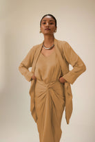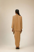Elevate your style with Nouria's must-have eka co-ord set. The bottom sarong skirt can be tied up in multiple ways that looks stunning on all versatile body silhouettes paired with Eka Short waterfall Jacket over it to complete the look. This jacket serves as the perfect complement to its matching dress, creating an ensemble that's ideal for a perfect special occasion.