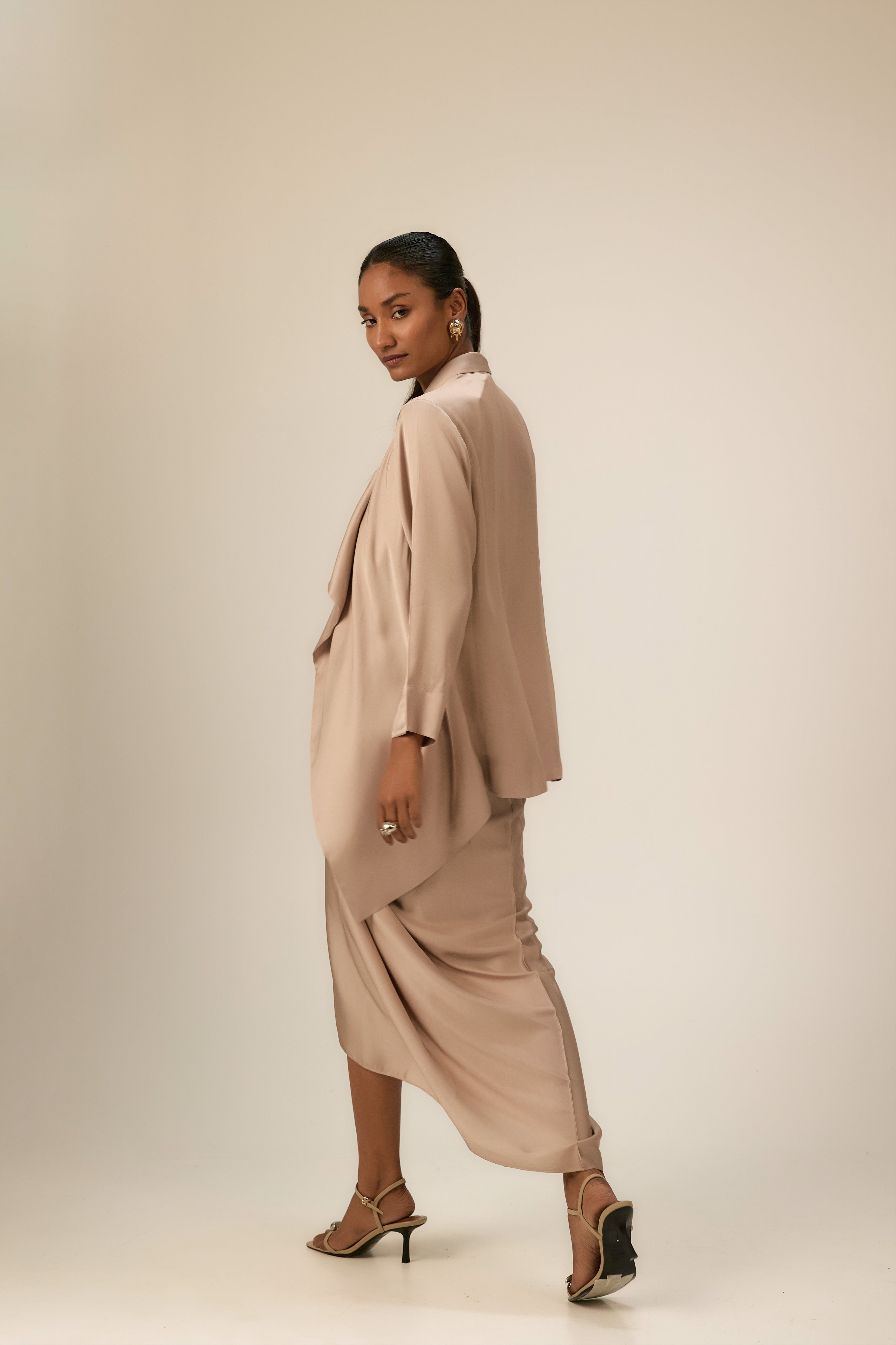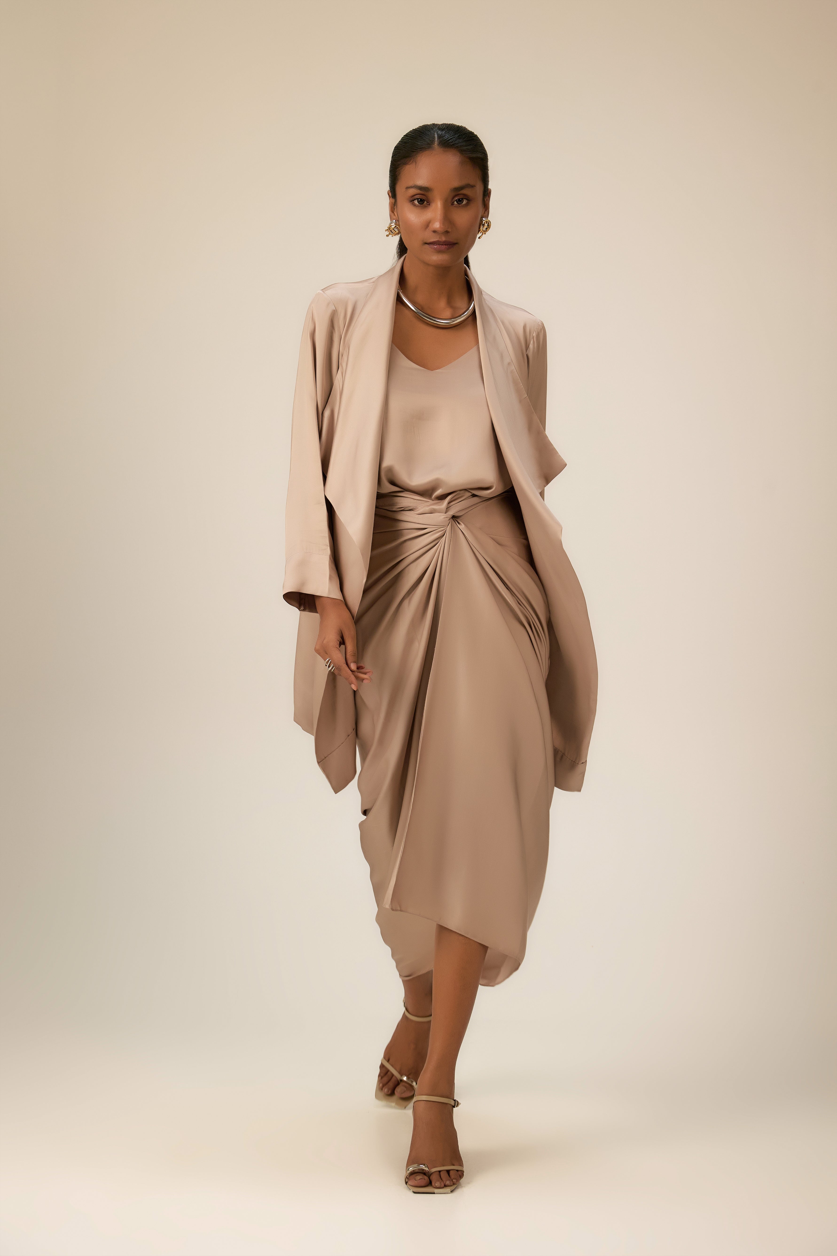 Elevate your style with Nouria's must-have eka co-ord set. The bottom sarong skirt can be tied up in multiple ways that looks stunning on all versatile body silhouettes paired with Eka Short waterfall Jacket over it to complete the look. This jacket serves as the perfect complement to its matching dress, creating an ensemble that's ideal for a perfect special occasion.
