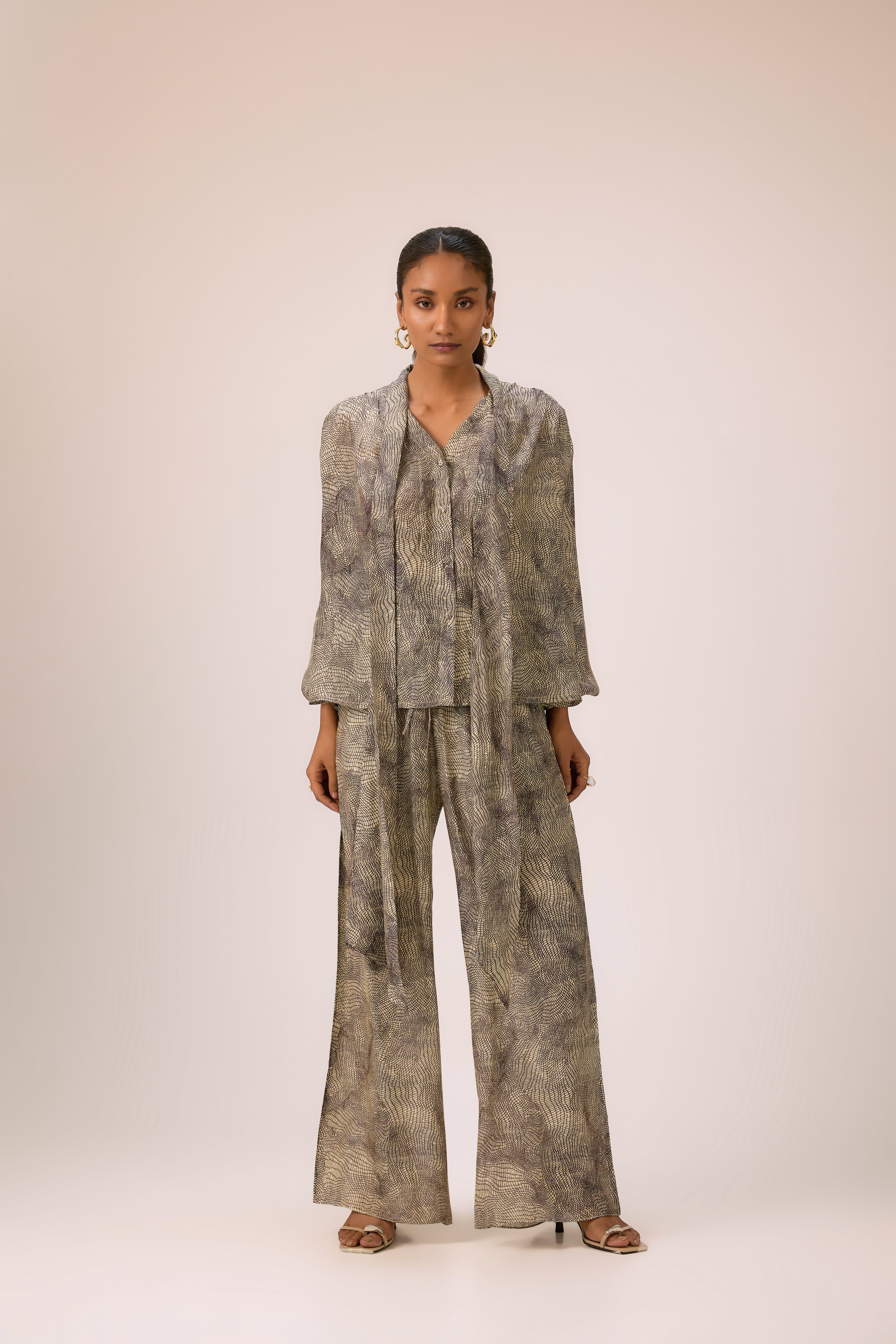 A perfect blend of femininity and ease, this set includes a bow-tie blouse with soft detailing and relaxed drawstring pants, making it ideal for both casual and elevated styling.