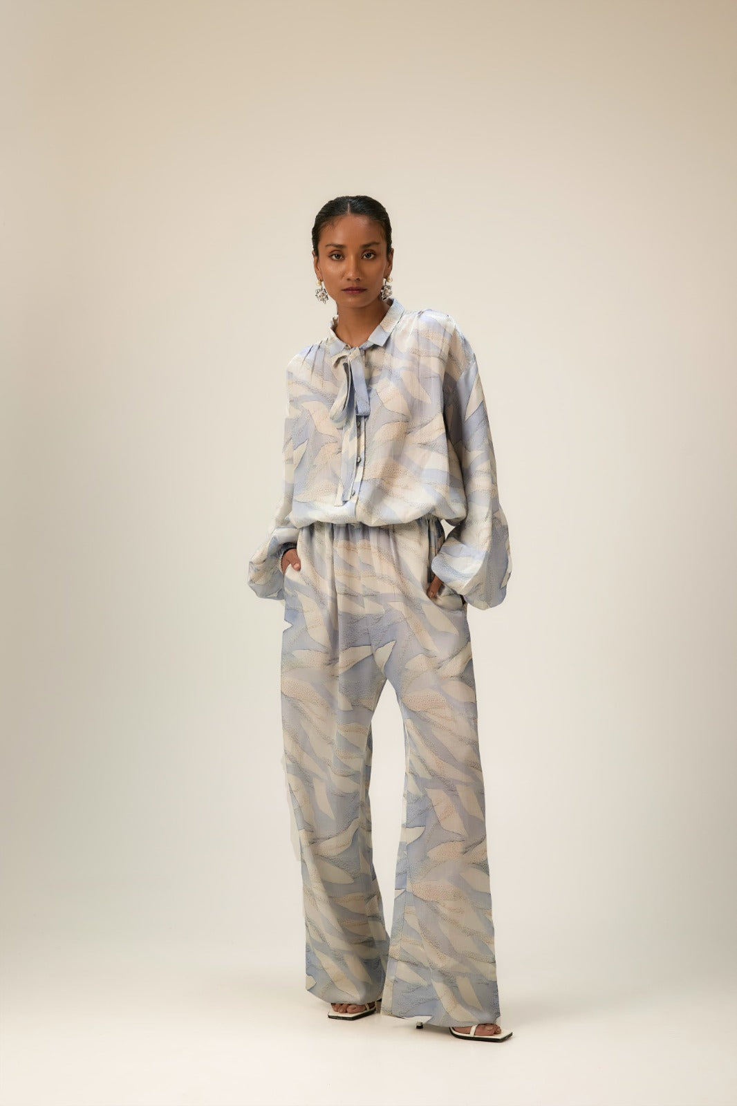 This elegant jumpsuit features a relaxed button-down top, billowy sleeves, and wide-leg pants. The soft abstract print and cinched waist create a fluid silhouette, perfect for resort wear or effortless daytime styling.
