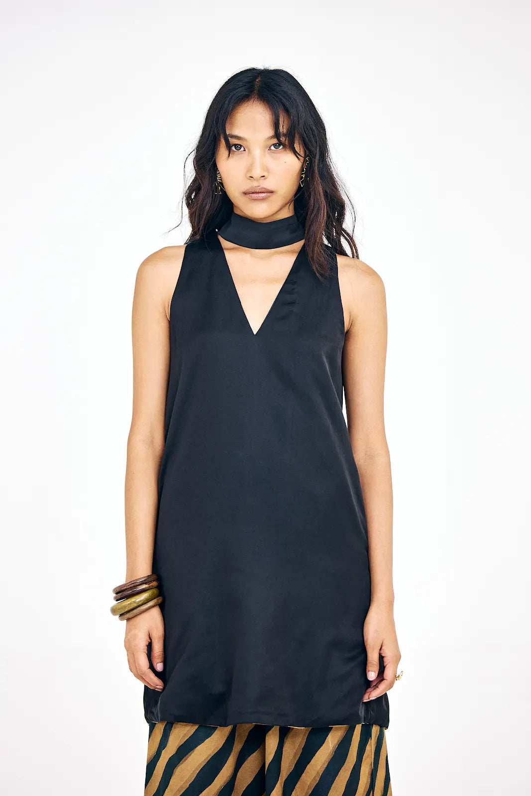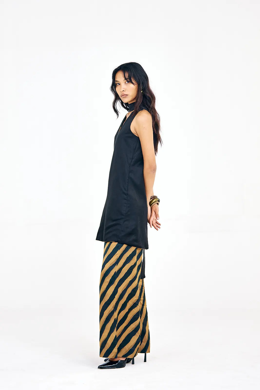 The Emerge Co-ord set is crafted in soft cotton satin and features a black mini V-neck shift dress paired with relaxed-fit chevron print pants in shades of brown and black. With its wide-legged silhouette and subtle sheen, the set blends structure with fluidity, perfect for transitional dressing that takes you from day to night.