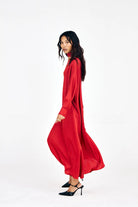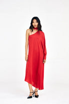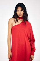 This one-shoulder dress is crafted in cotton satin and features an asymmetrical silhouette with one full sleeve and a necktie detail at the neckline. Designed in a rich red hue, it’s perfect for evening occasions. Style it with minimal gold accessories and heels for a polished look.