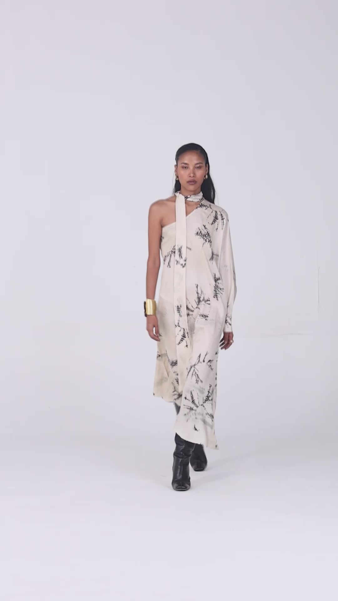 This one-shoulder dress is crafted in cotton satin and features an asymmetrical silhouette with one full sleeve and a necktie detail. Designed in an ivory palette with subtle print detailing, it’s a versatile piece that transitions effortlessly from day to evening.