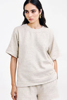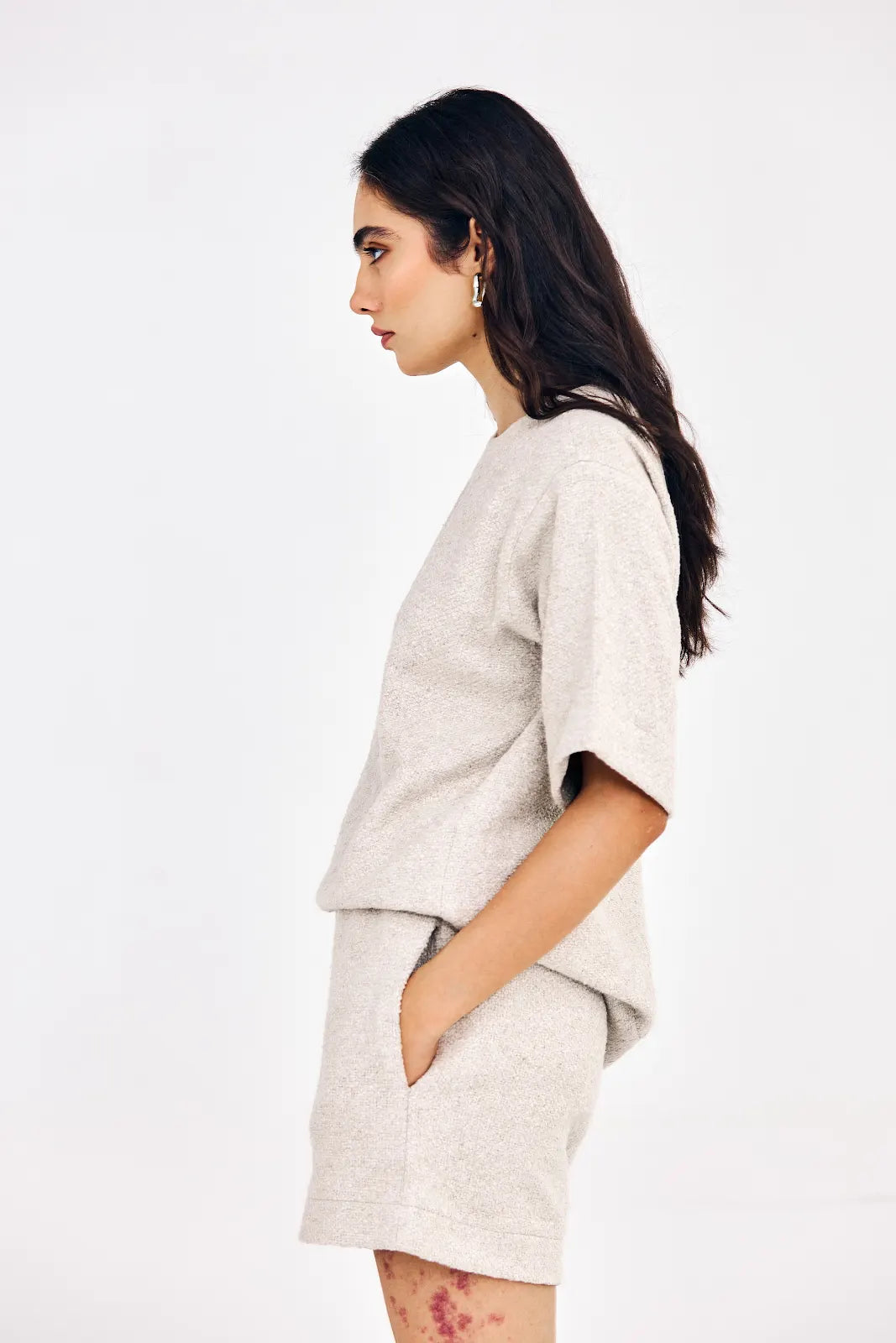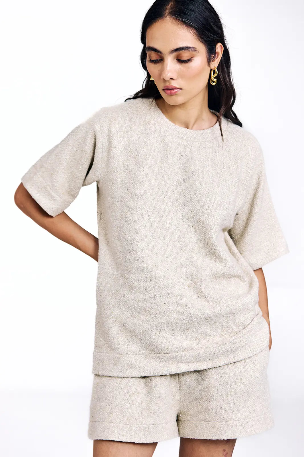 This relaxed loose-fit cotton jacquard t-shirt featuring an effortlessly casual look. Soft, breathable, and comfortable, it’s perfect for laid-back days, weekend outings, or casual dates. A simple yet elevated take on the classic shorts-and-t-shirt combination.