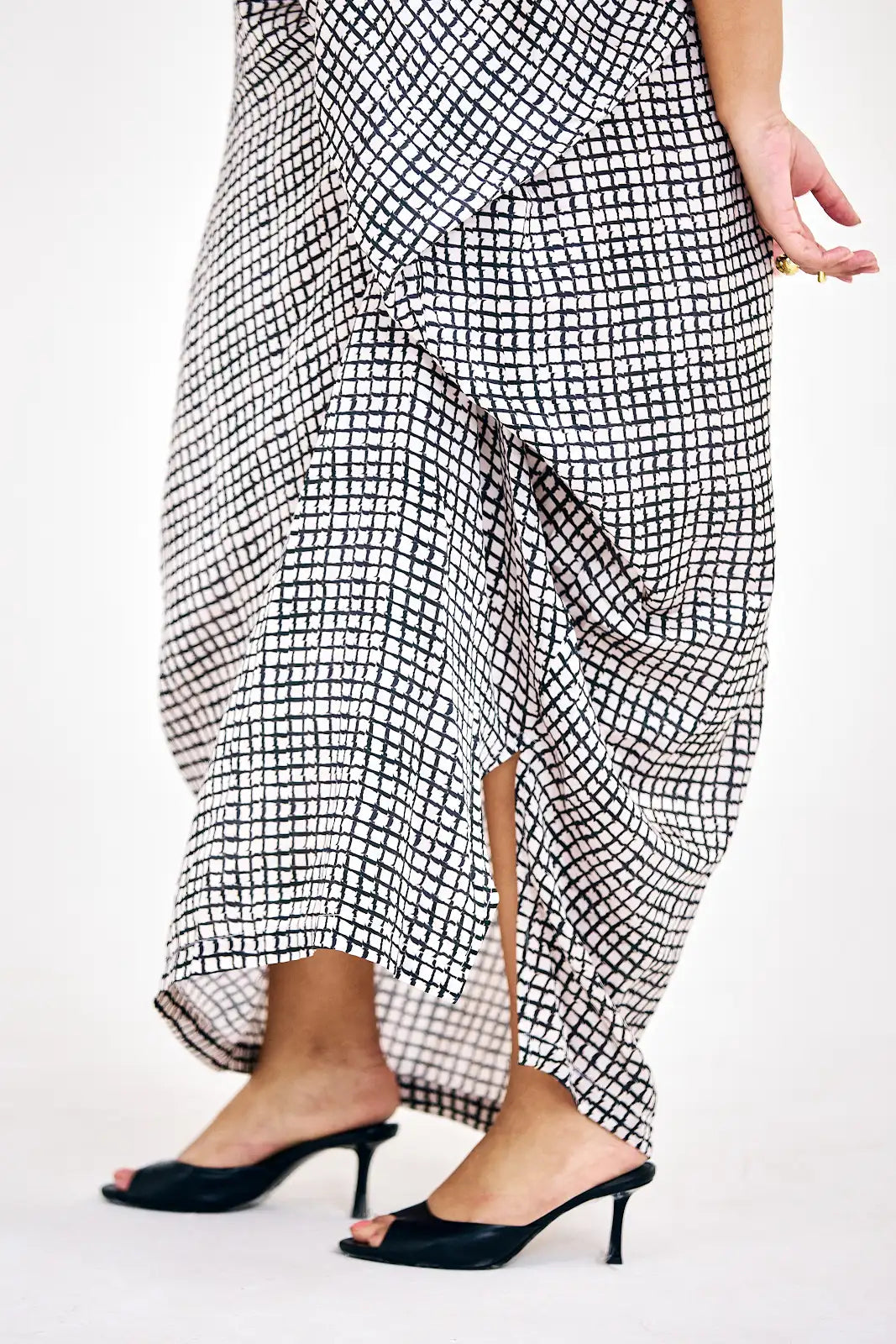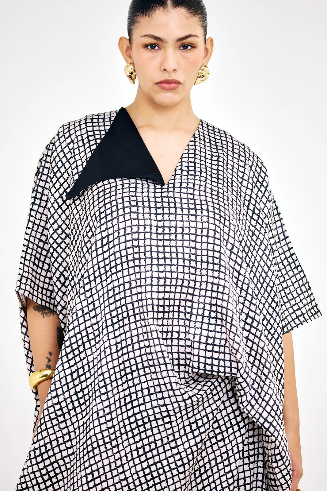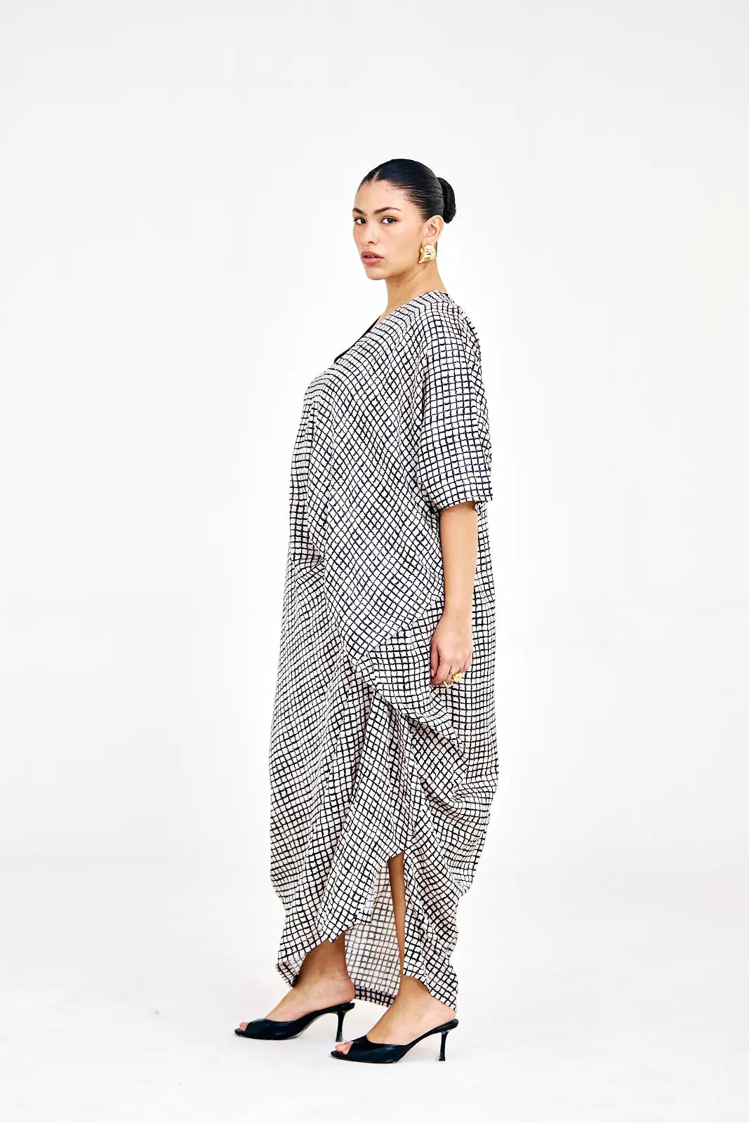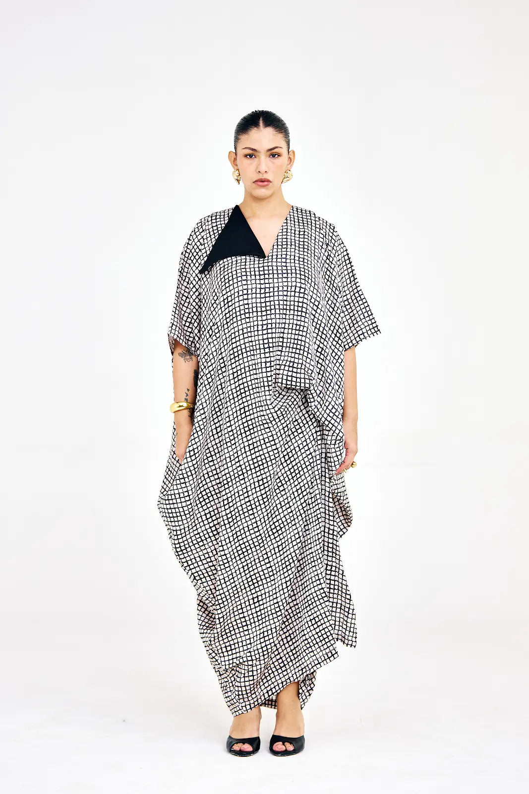 A light, fluid kaftan featuring unique cowl details that add graceful movement and a contemporary twist to its timeless silhouette.
