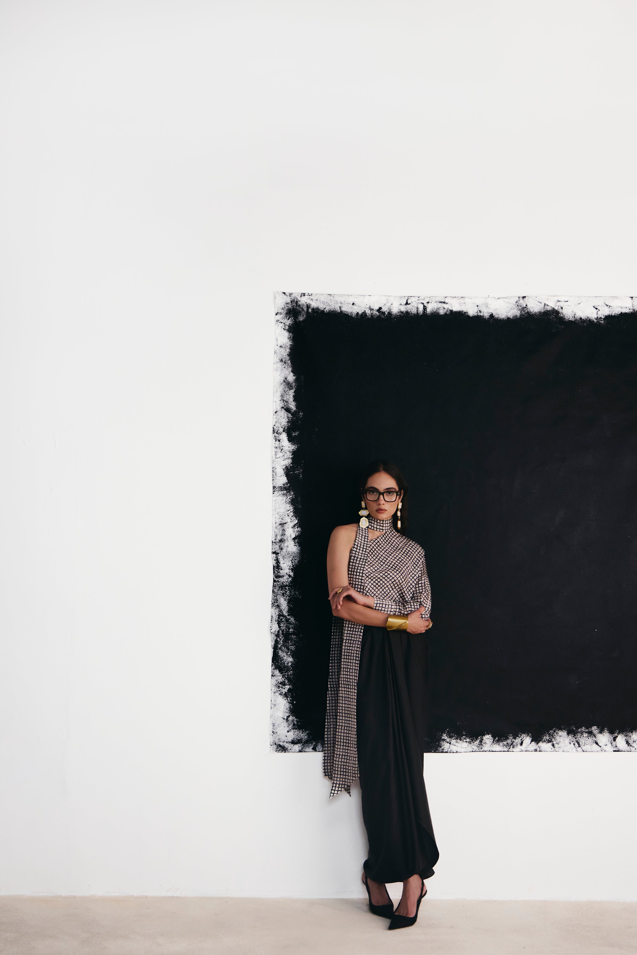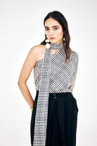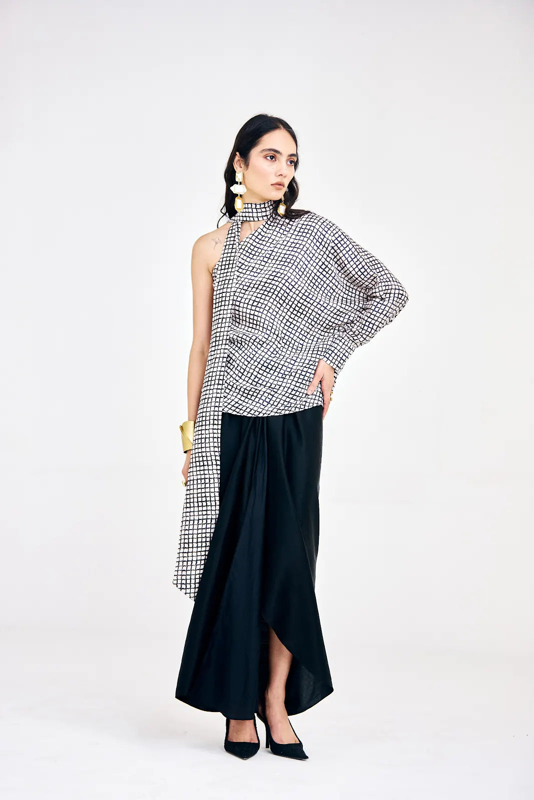 This abstract black-and-white striped one-shoulder top with necktie detailing comes as a co-ord set with a relaxed, draped black skirt. Wear it together for a coordinated look, or mix and match the pieces separately.Pair the top with other bottoms or the skirt with a different top for everyday styling.