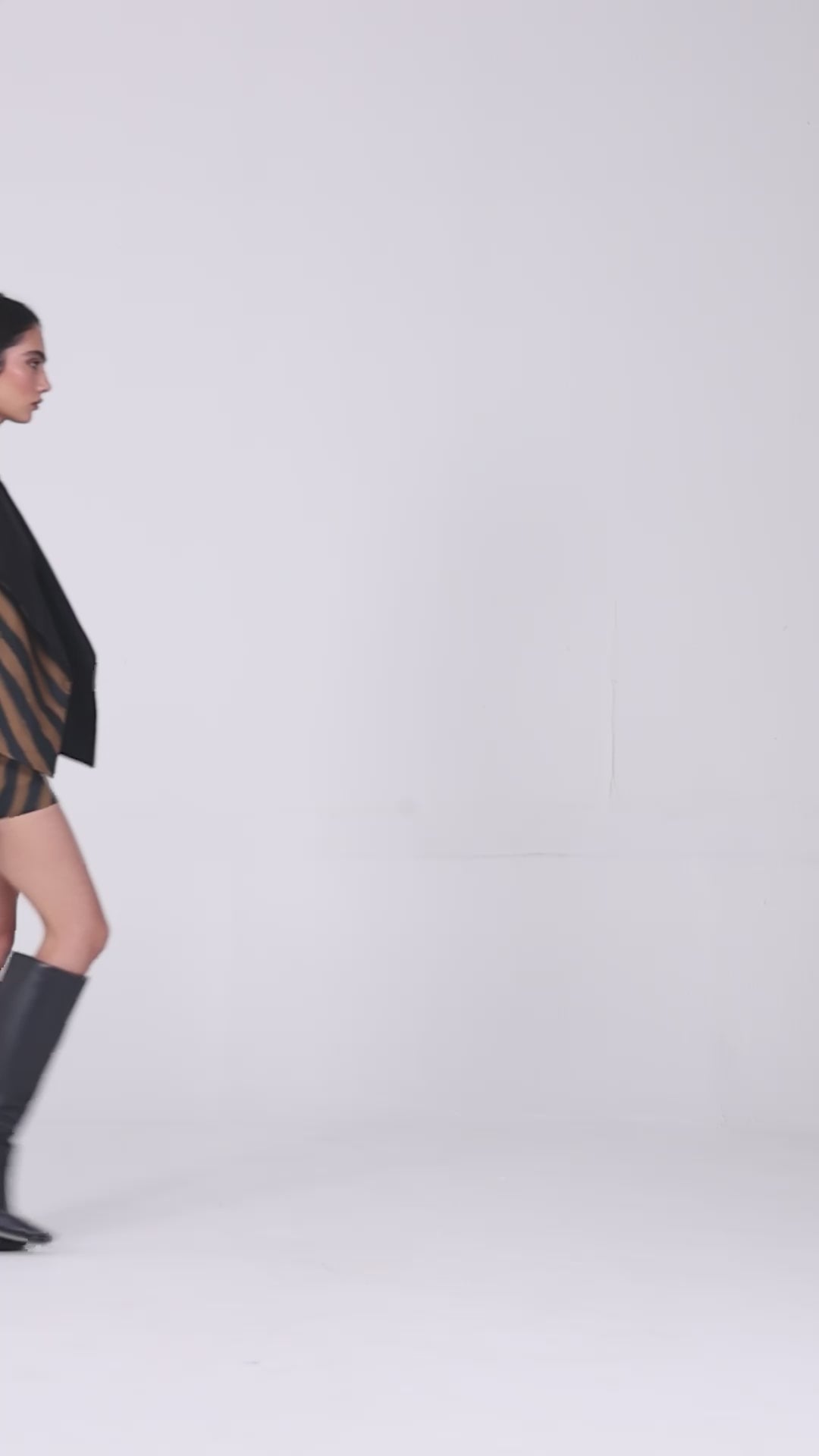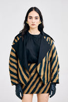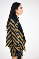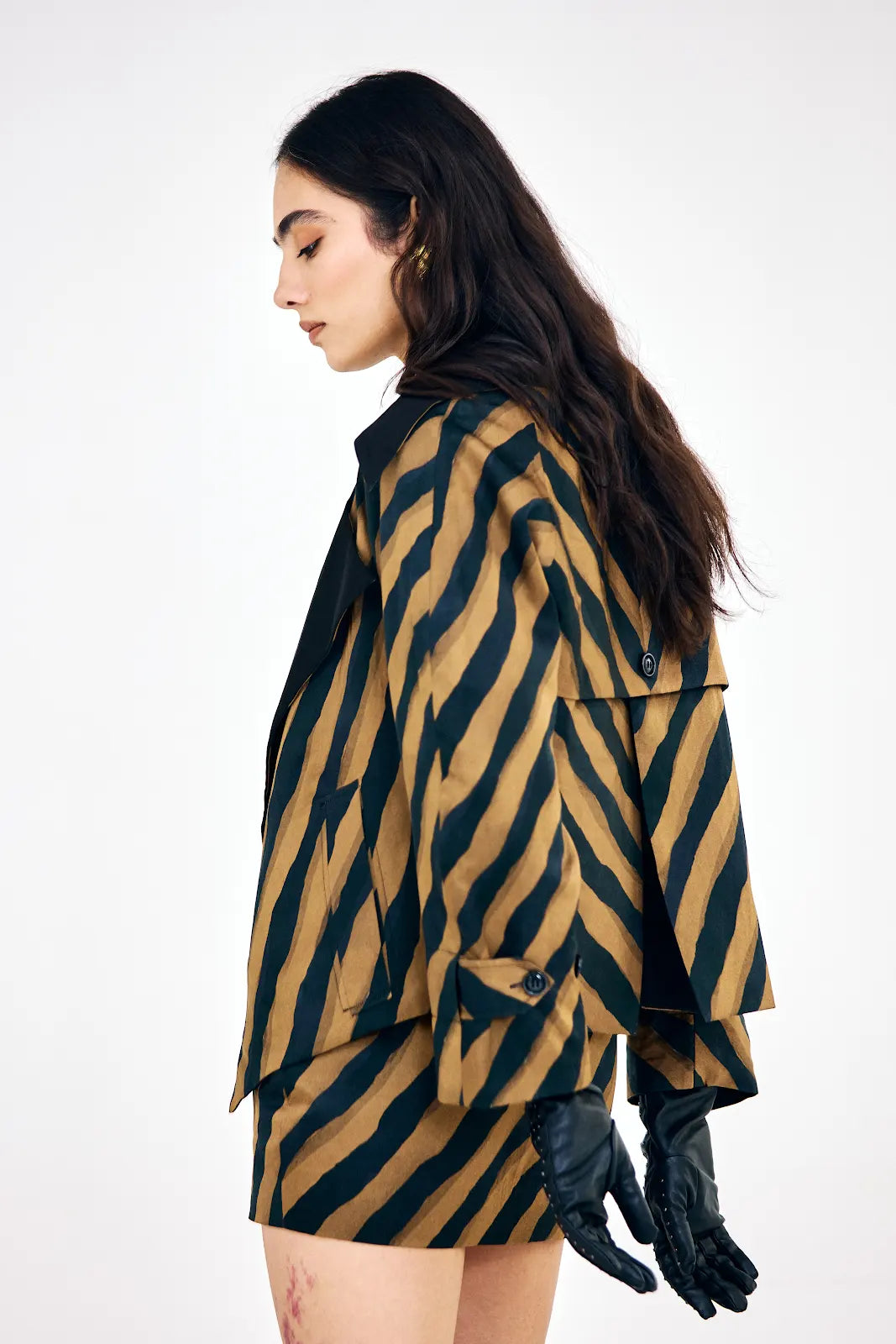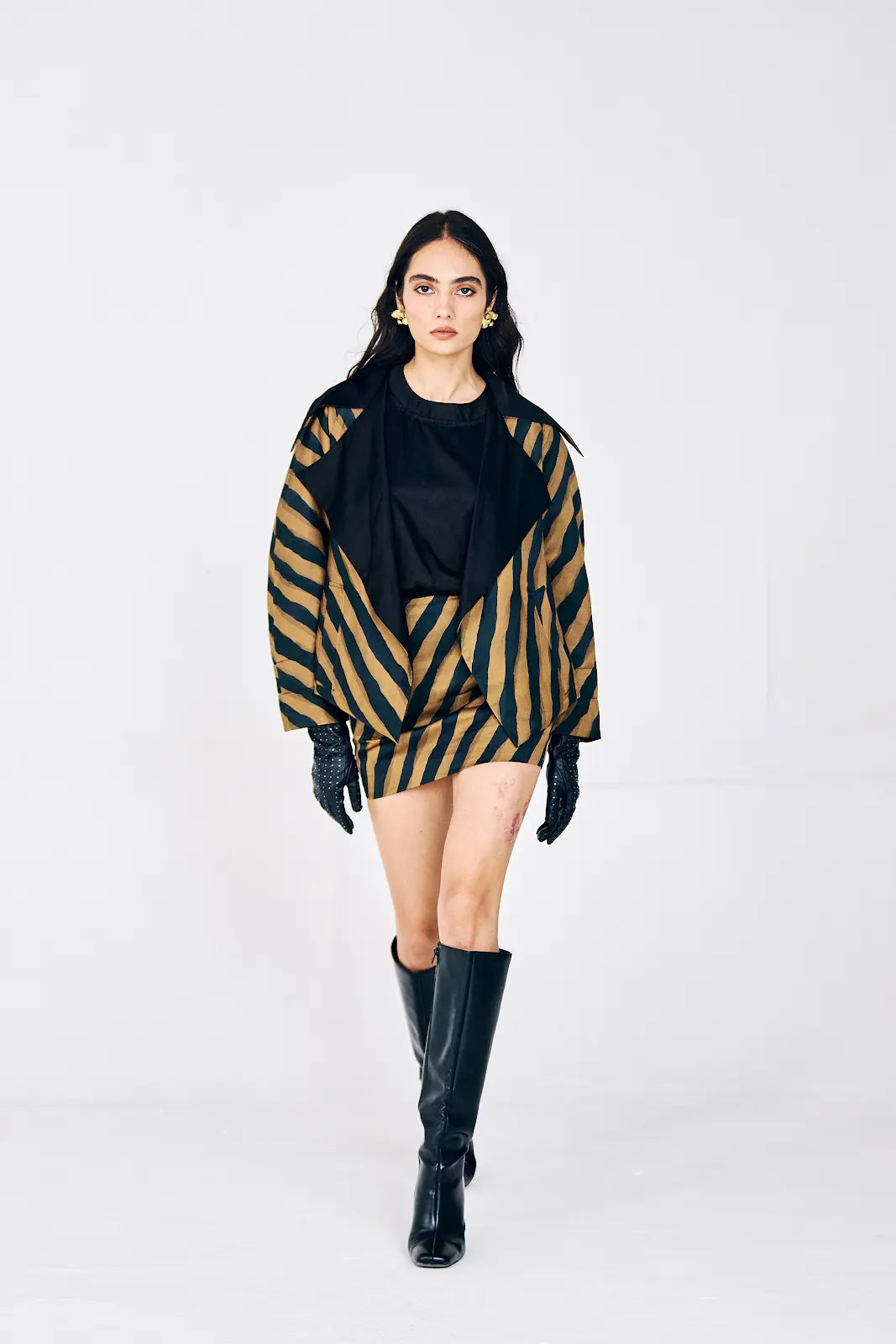 The Relaxed-fit brown and black striped jacket, crafted in cotton satin, features exaggerated lapels and a relaxed silhouette, offer a versatile look that can be worn as a set for a polished appearance or styled separately with everyday pants and skirts.