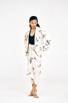 The Relaxed-fit Shibori print jacket, crafted in cotton satin, features exaggerated lapels and a relaxed silhouette, offer a versatile look that can be worn as a set for a polished appearance or styled separately with everyday pants and skirts.