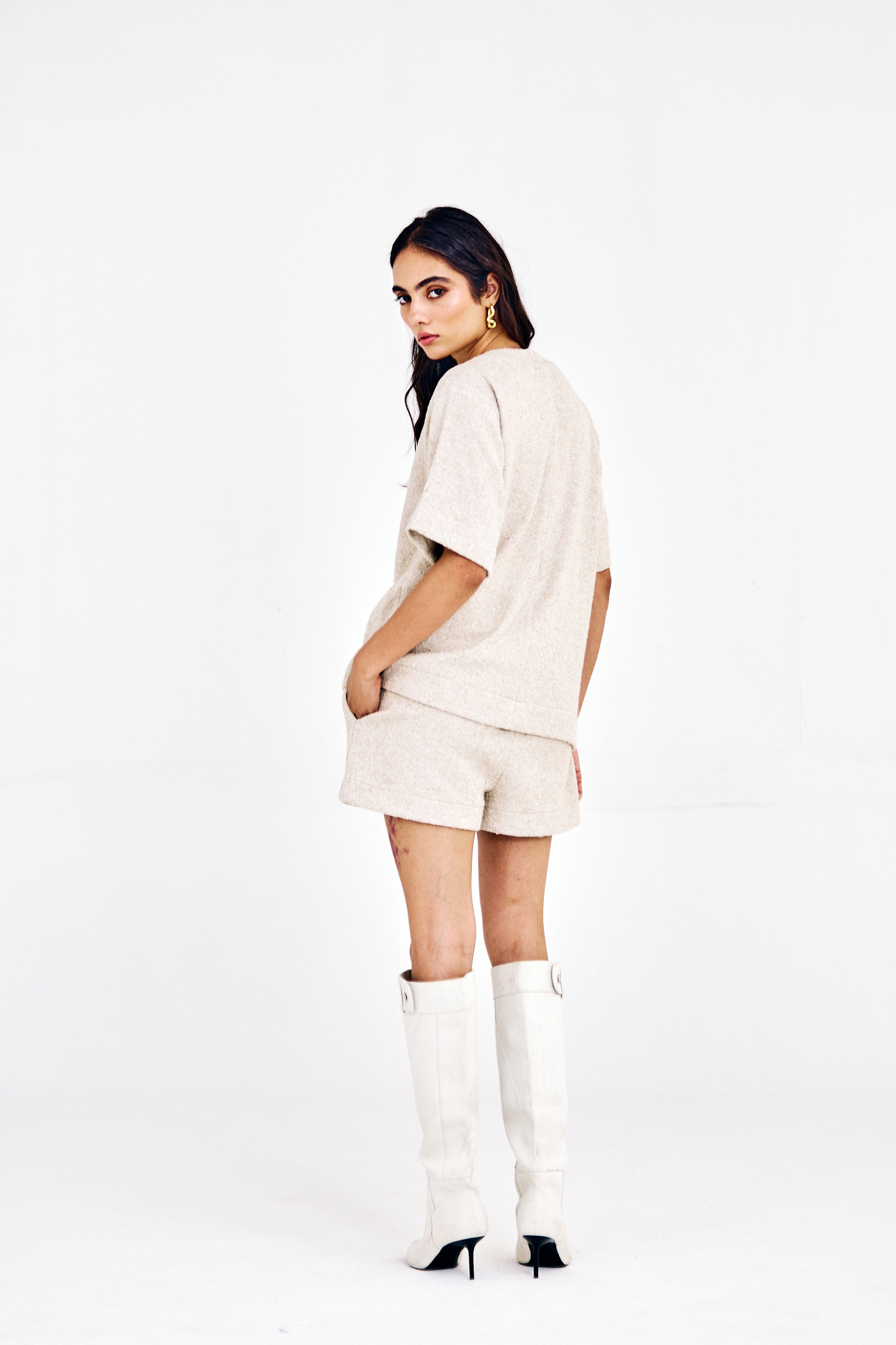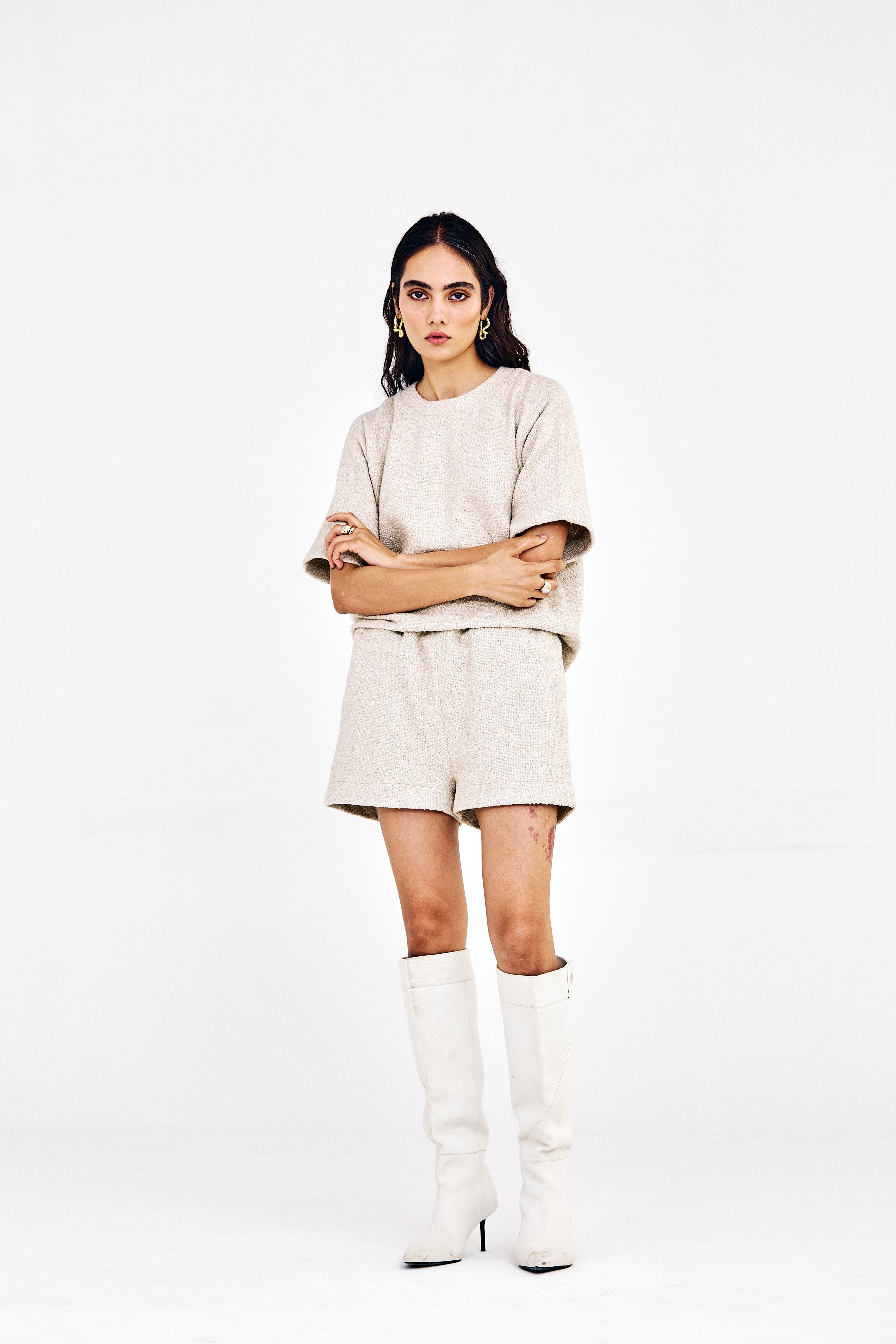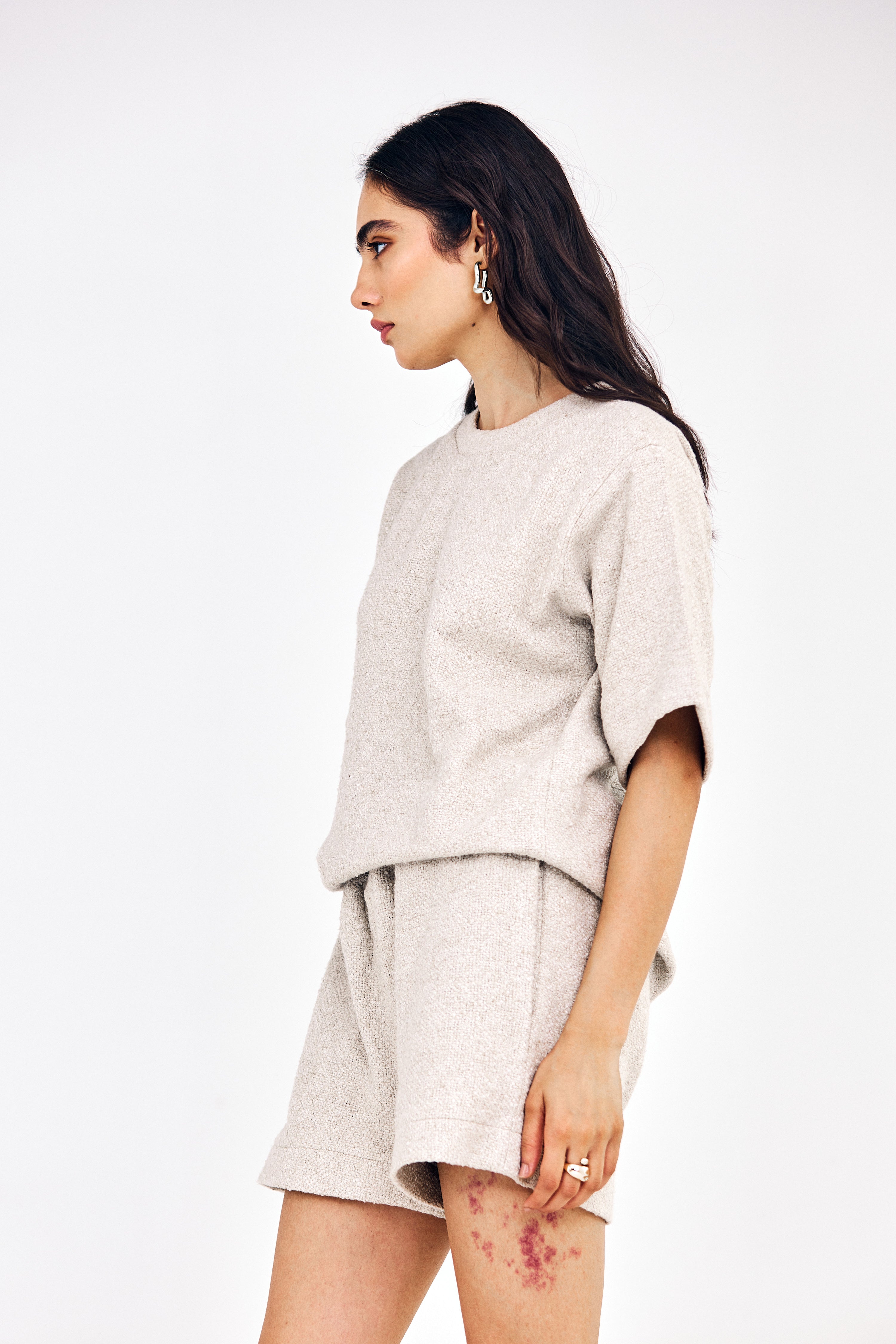 This relaxed loose-fit cotton jacquard t-shirt featuring an effortlessly casual look. Soft, breathable, and comfortable, it’s perfect for laid-back days, weekend outings, or casual dates. A simple yet elevated take on the classic shorts-and-t-shirt combination.