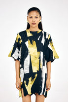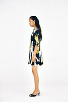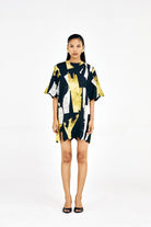 This printed short dress is crafted in satin-finish fabric, featuring scalloped hemlines