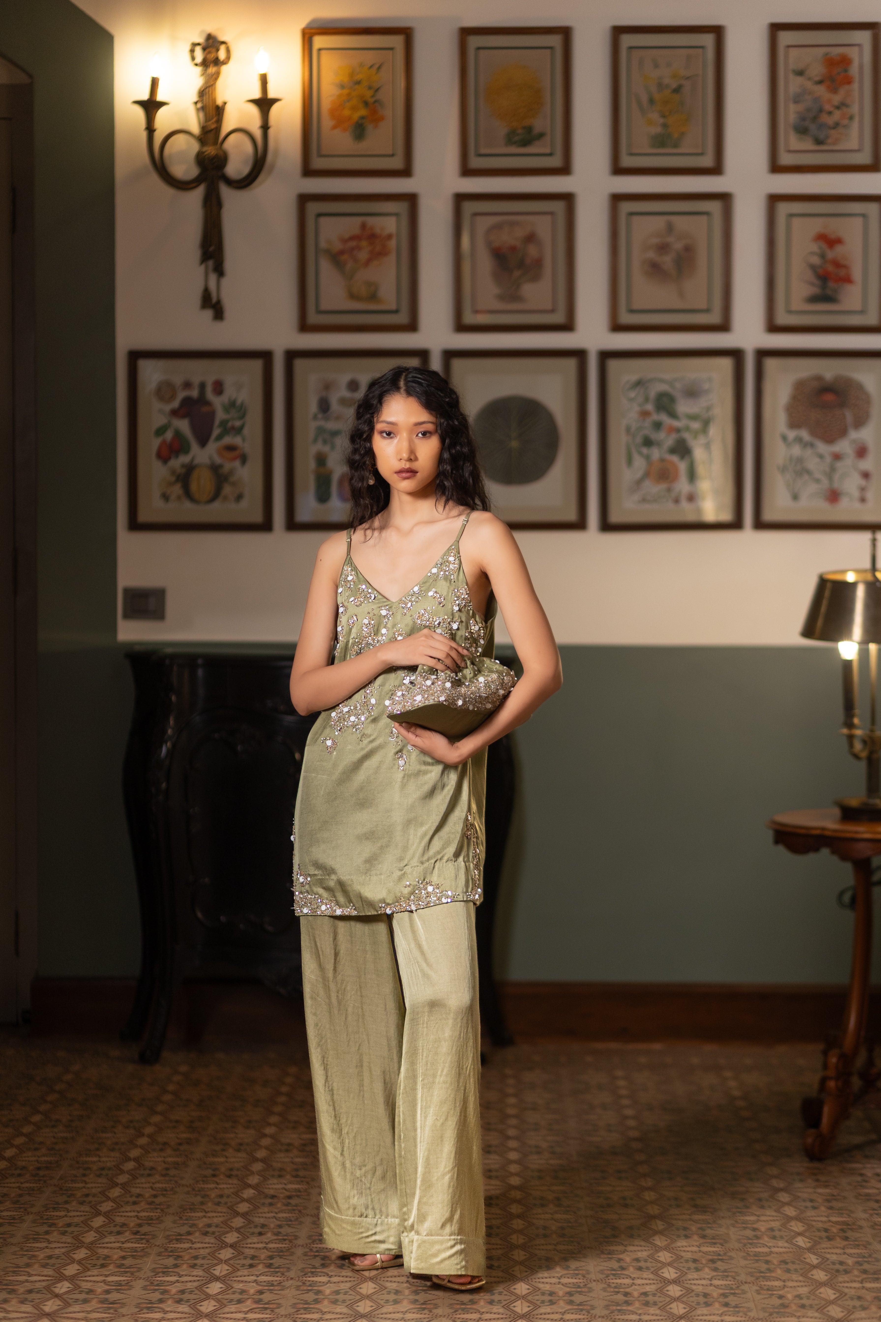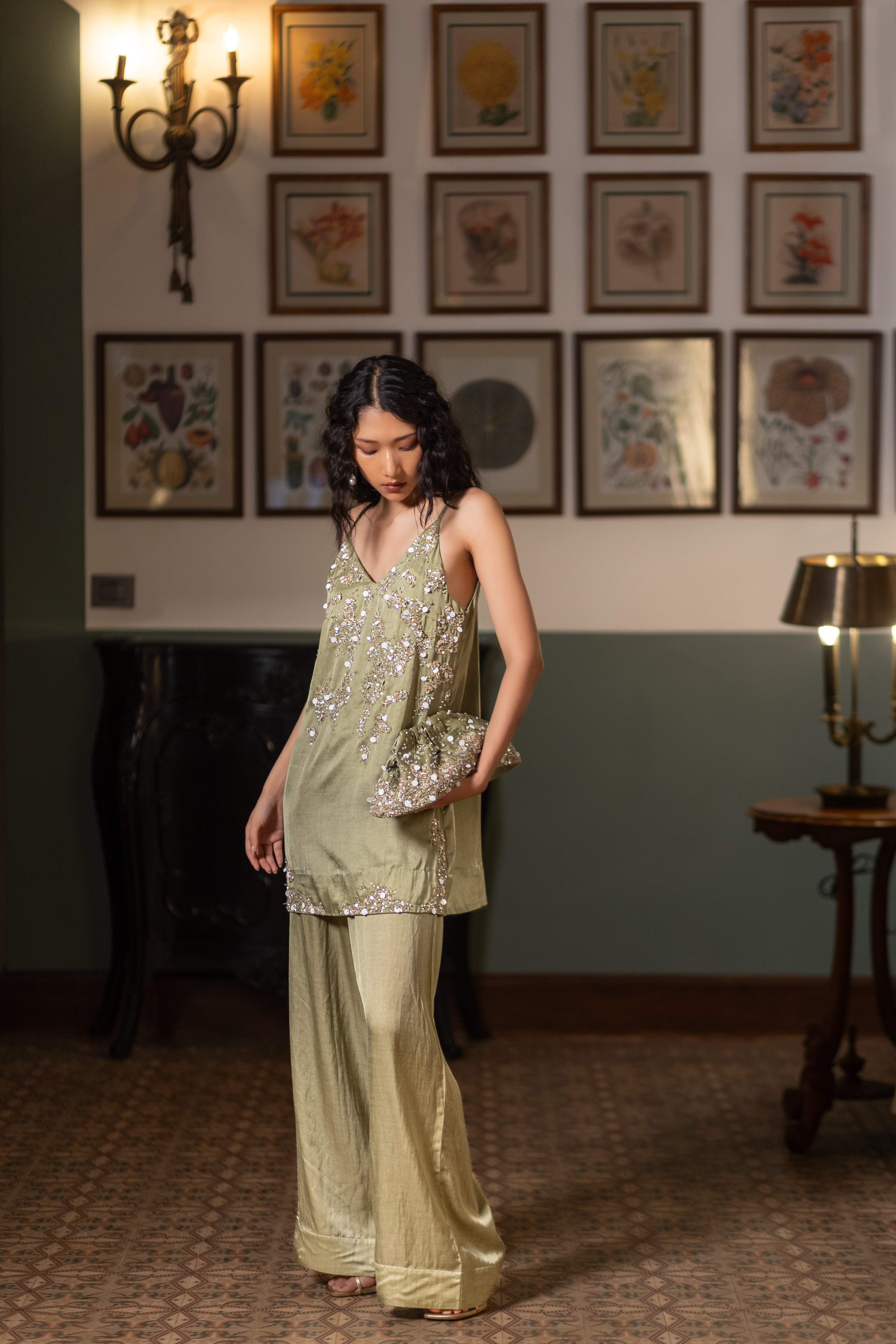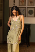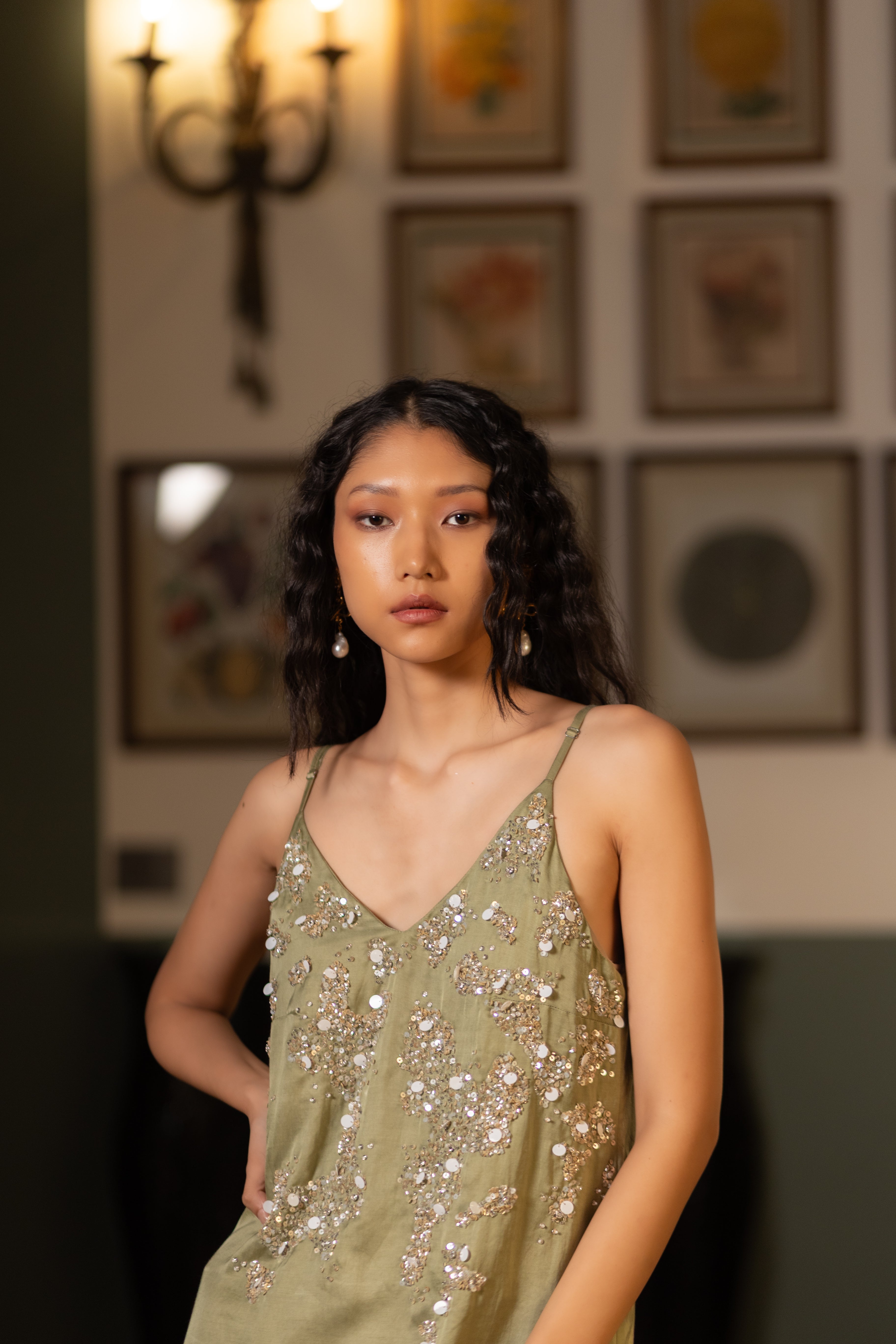 This straight-cut slip dress features delicate shoulder straps and abstract hand-embellished detailing, finished with a subtle sheen for an effortlessly elegant look.