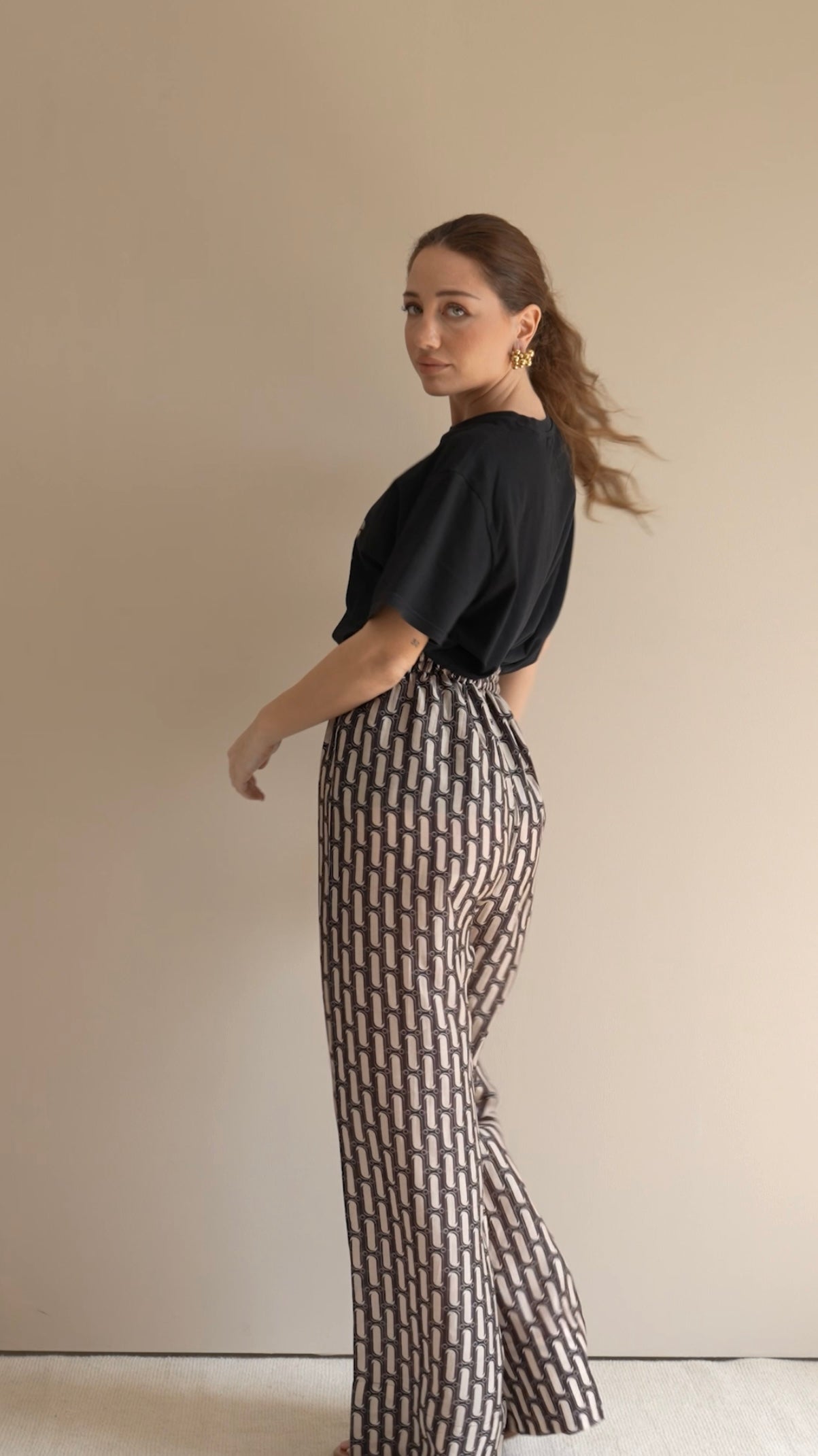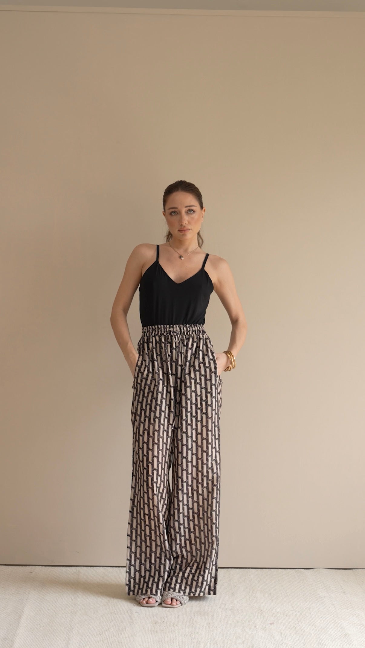 Elevate your summer wardrobe with these effortlessly chic, flowy wide-leg pants. These pants blend comfort and style. The pants have an elasticated waistband, drawstring tie-up in front and side pockets. The geometric print adds a modern touch, perfect for coastal escapes.