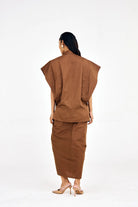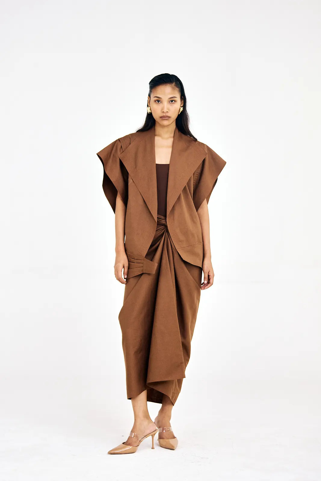 This co-ord set features an asymmetrical jacket with exaggerated lapels and structured shoulders, paired with our best-selling Tina skirt in matching Brown. Wear it together for a coordinated, elevated look, or style the pieces separately for versatile wardrobe options.