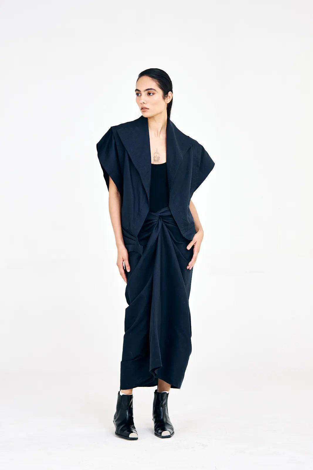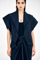 The Asymmetrical Navy blue Jacket, crafted in cotton twill, features an exaggerated lapel, structured shoulders, and unique sleeve detailing. Cut in a short length, it comes in a warm tone and can be easily layered over your everyday tops and pants.