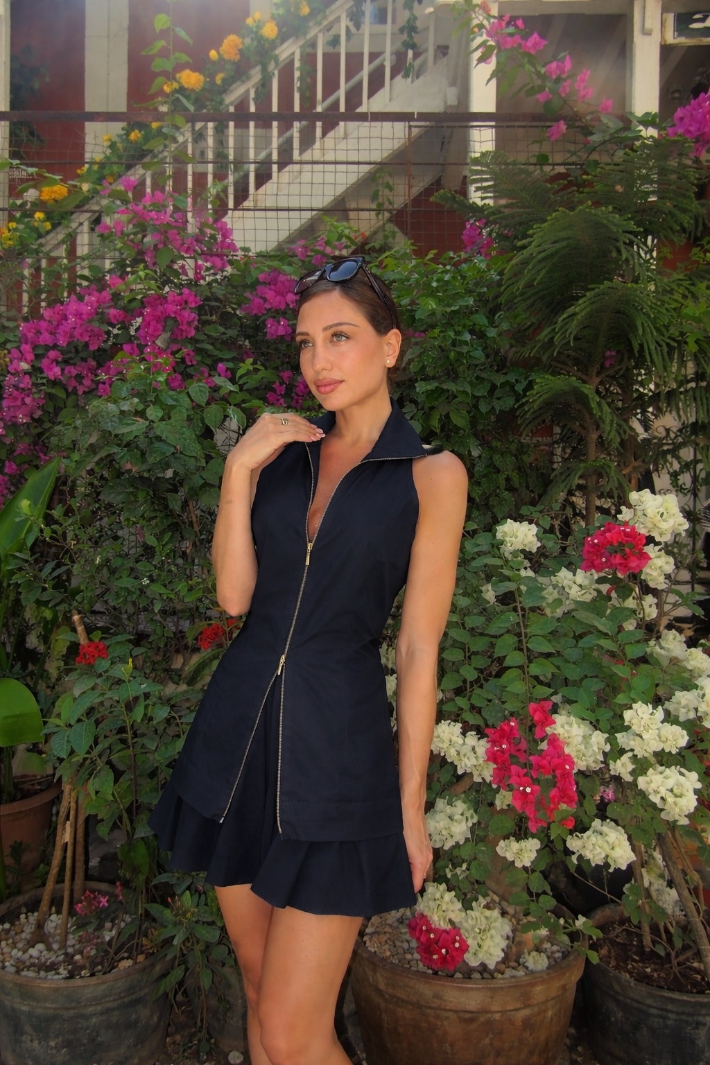 Structured co-ord set featuring a sleeveless, collared zip-front top with a sleek, tailored fit, paired with a flared skort for a sharp, sculpted, and modern silhouette.