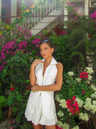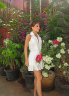 Structured co-ord set featuring a sleeveless, collared zip-front top with a sleek, tailored fit, paired with a flared skort for a sharp, sculpted, and modern silhouette.