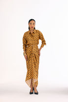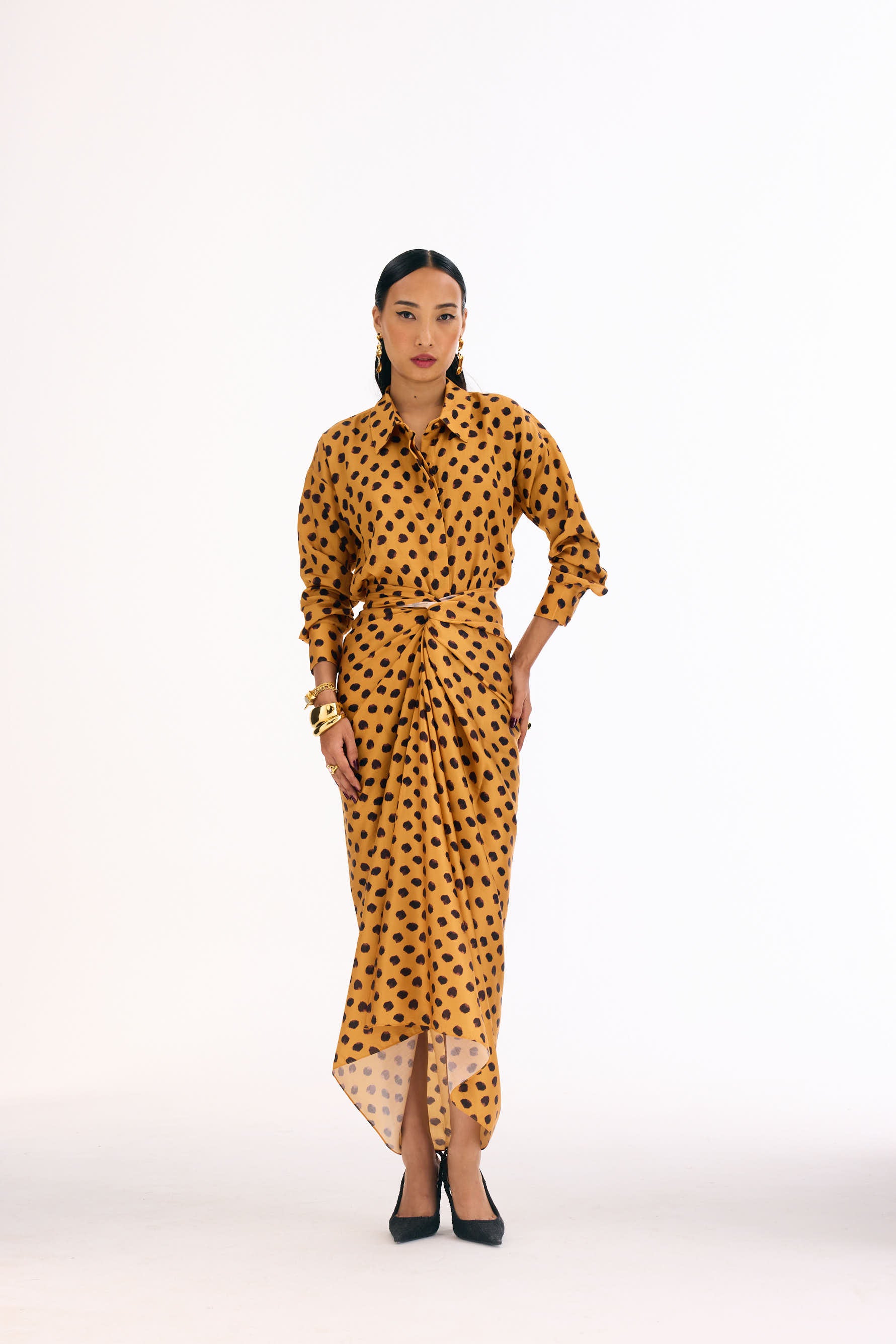 This elegant coord set features a bold abstract print and a tailored silhouette. The button-up shirt is paired with a structured, high-waisted lina skirt, creating a refined yet artistic look. This set is ideal for formal occasions or elevated daywear. Bold, sophisticated, and effortlessly chic.