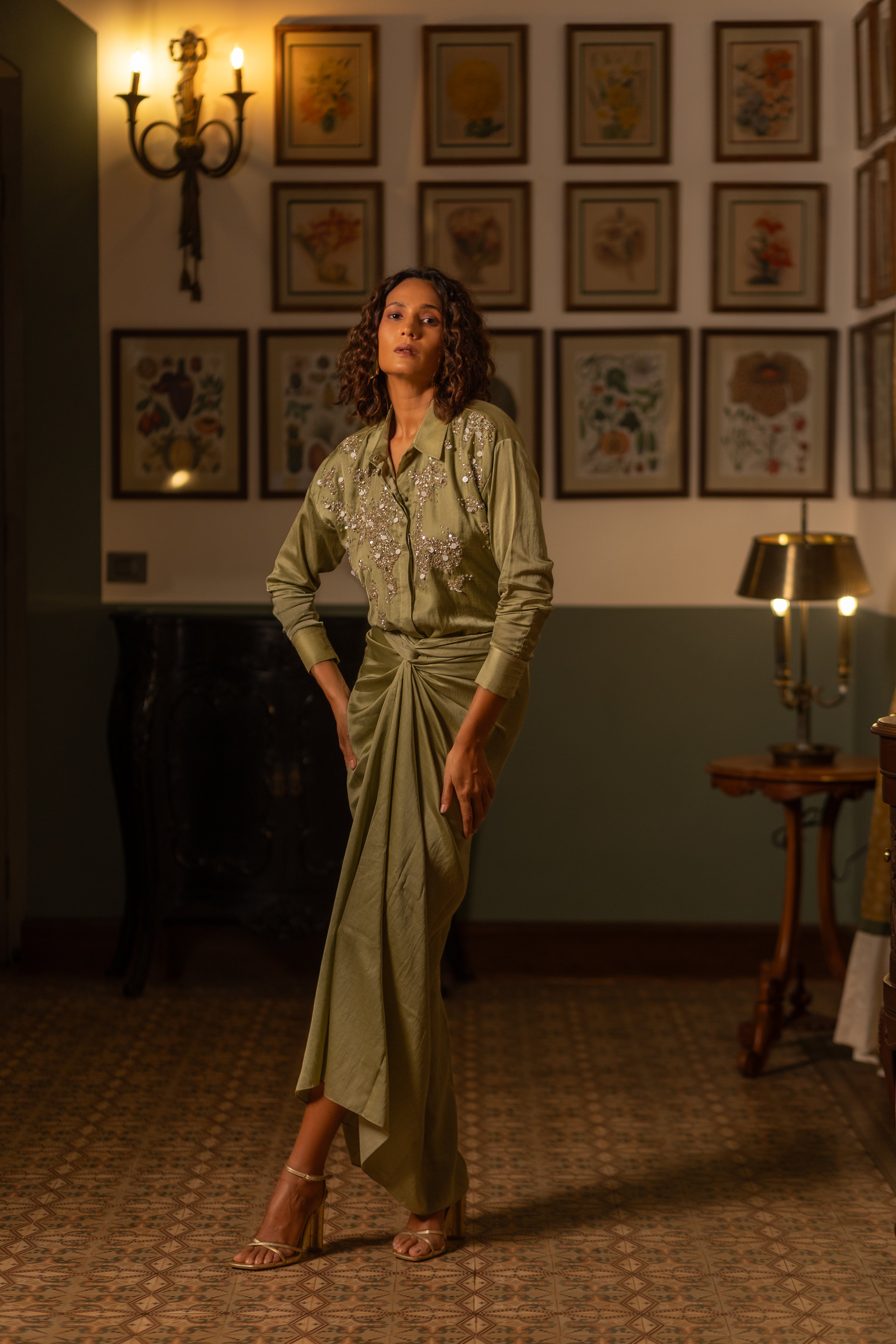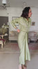 Paired with a draped sage green skirt, the set offers a complete look that’s polished yet easy. Both pieces can be styled separately, adding versatility to your wardrobe.