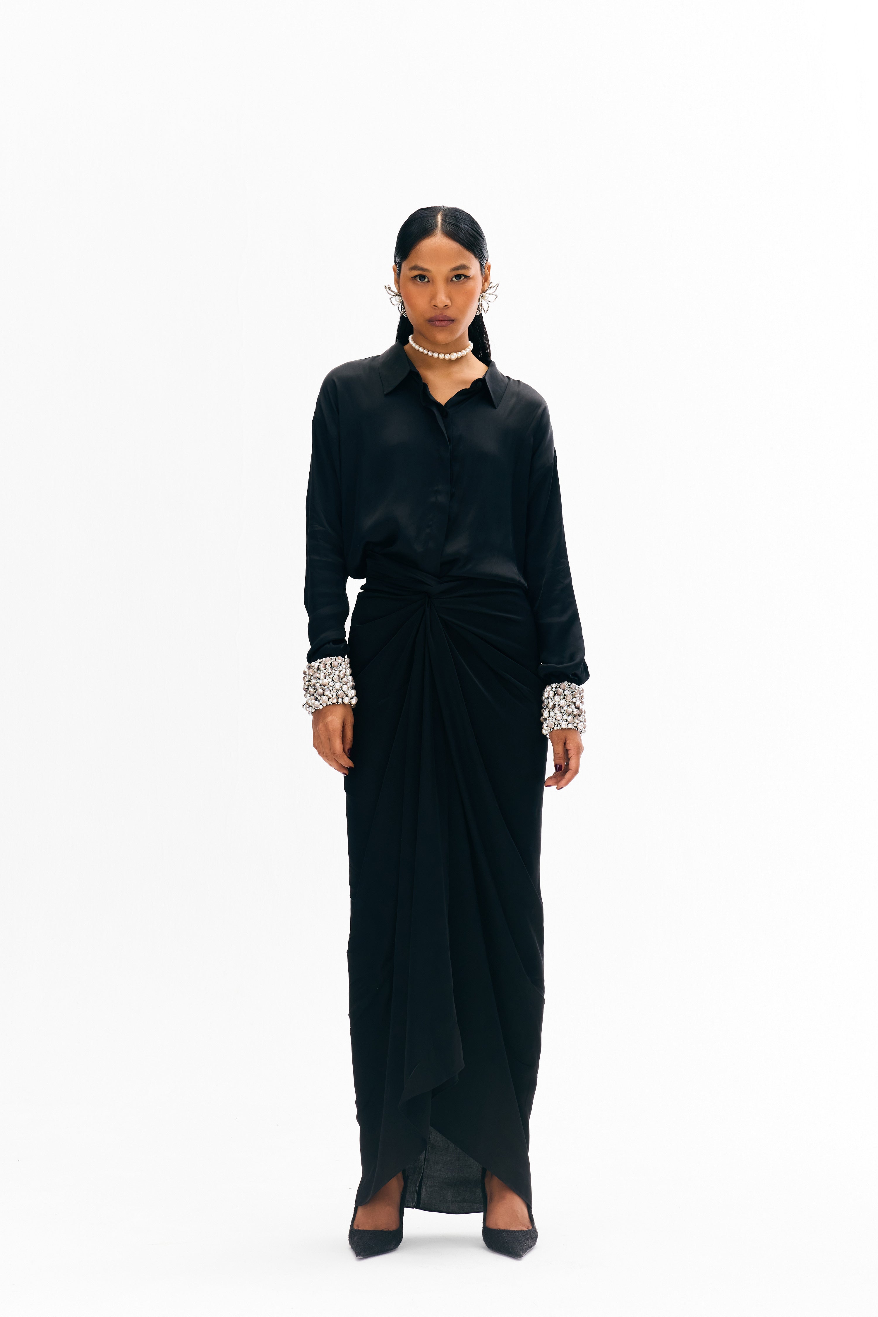 Nouria's must-have coord set, has Jenni shirt with embroidered cuffs and a Tina skirt . The bottom sarong skirt can be tied up in multiple ways that looks stunning on all versatile body.