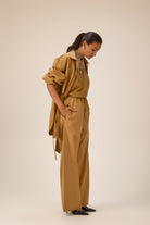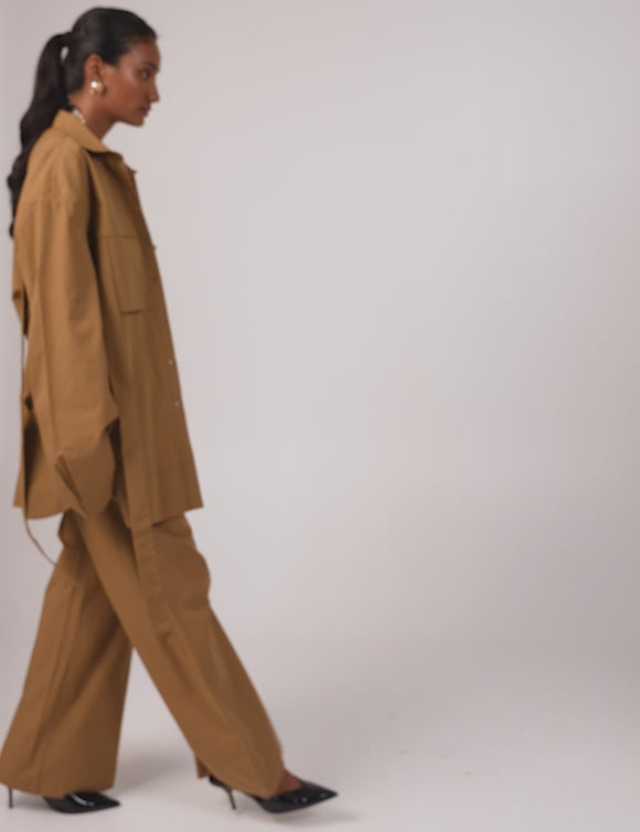This coordinated set features an oversized jacket with a unique zipper detail at the back,paired tailored drawstring pants, it offers a harmonious blend of structure and comfort, making it a standout choice for versatile styling.