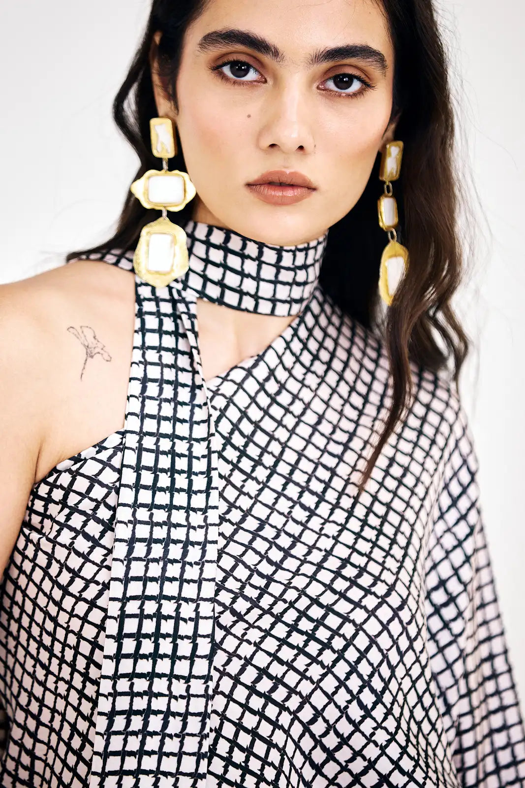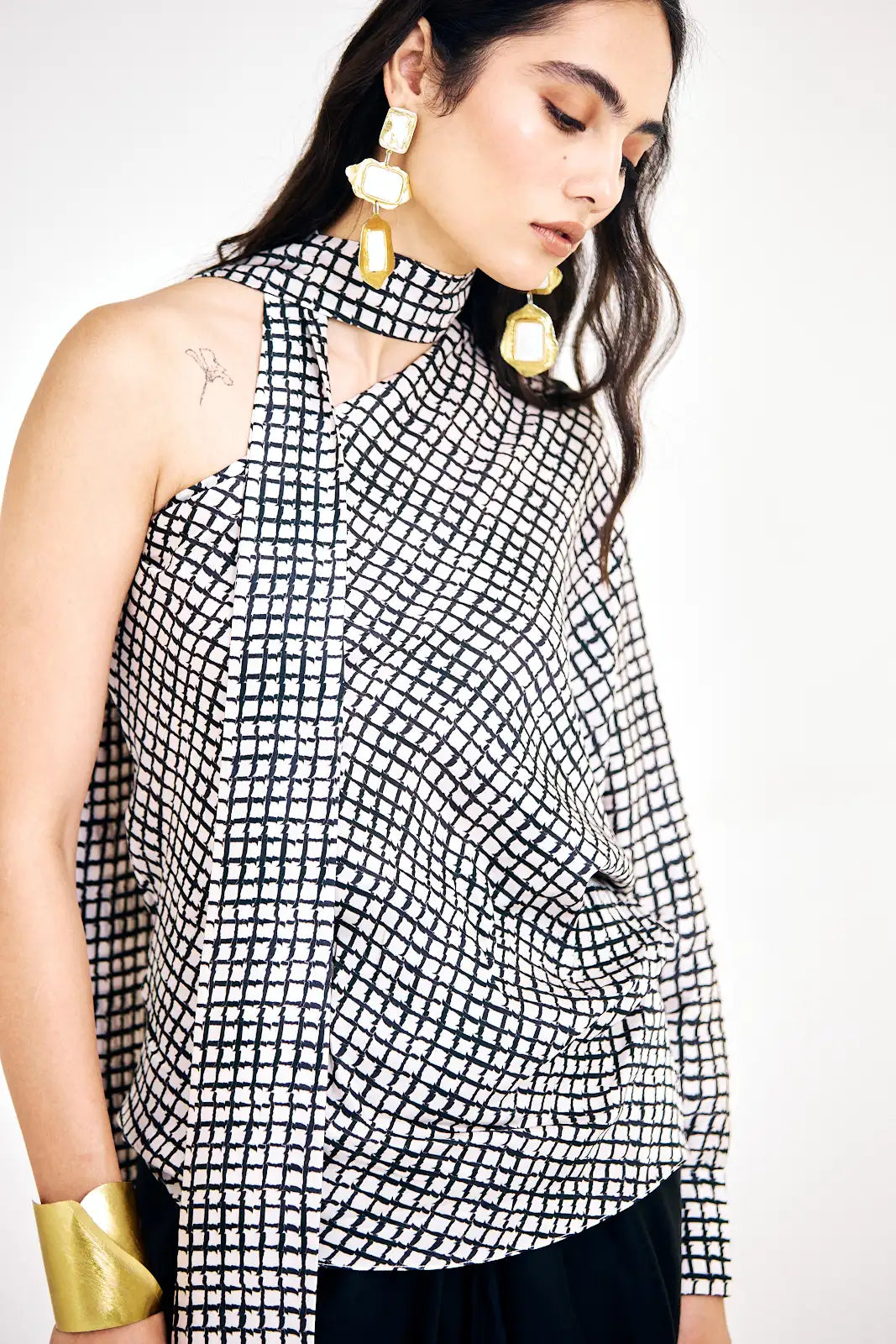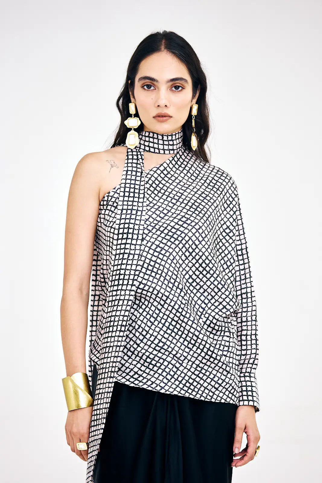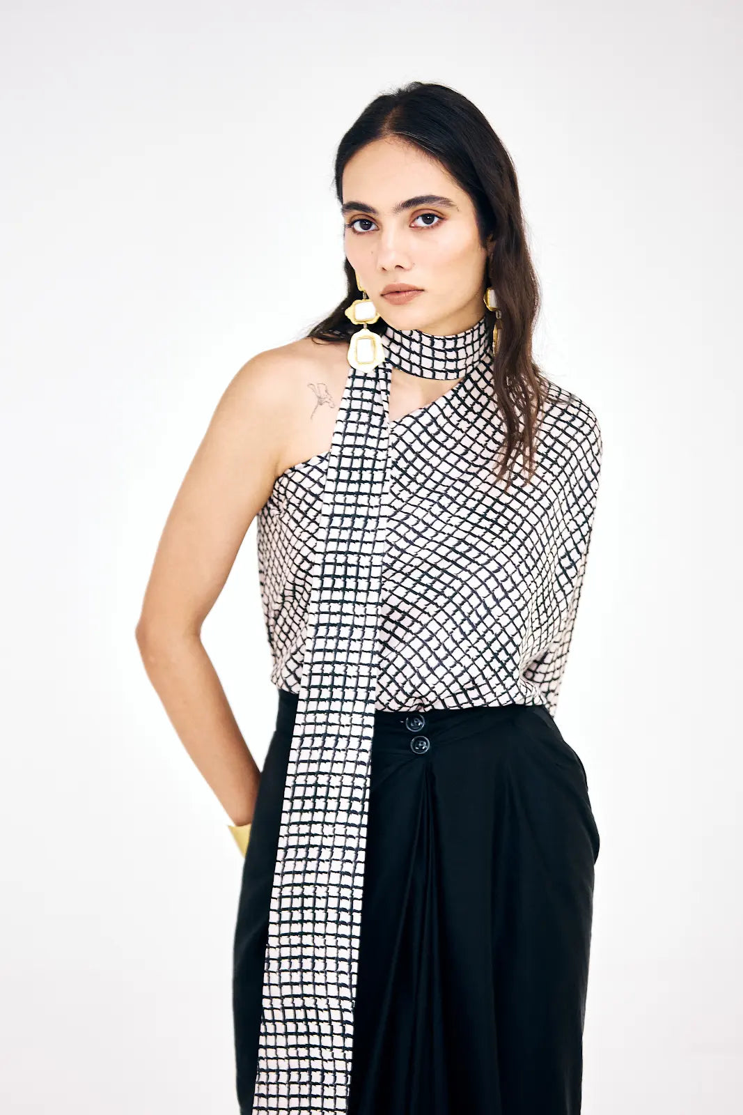 This black-and-white abstract striped one-shoulder top features a chic necktie detailing for a modern, elevated look. With its asymmetrical cut and relaxed fit, it can be styled on its own with jeans, skirts, or trousers, or paired with matching pieces for a coordinated ensemble.