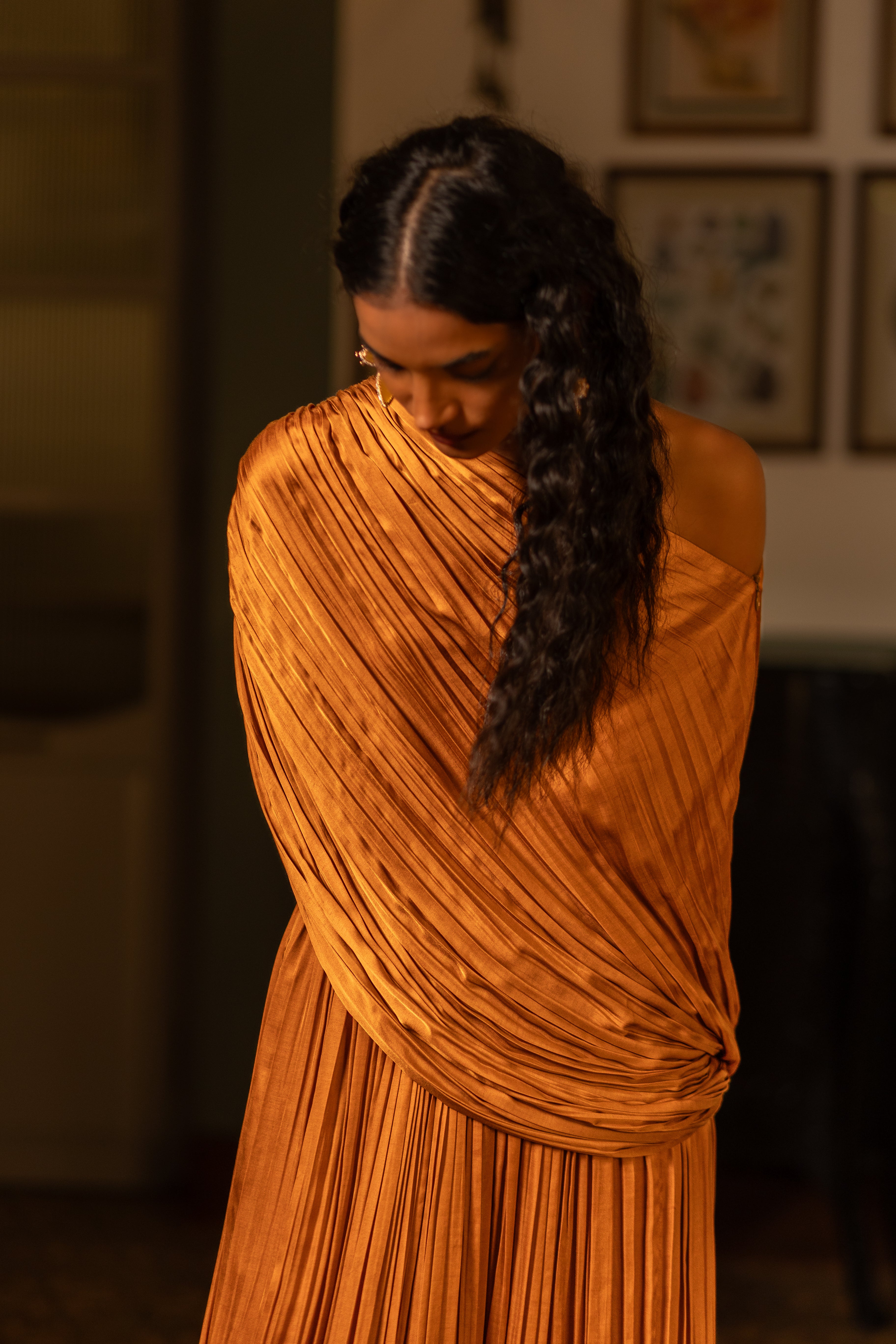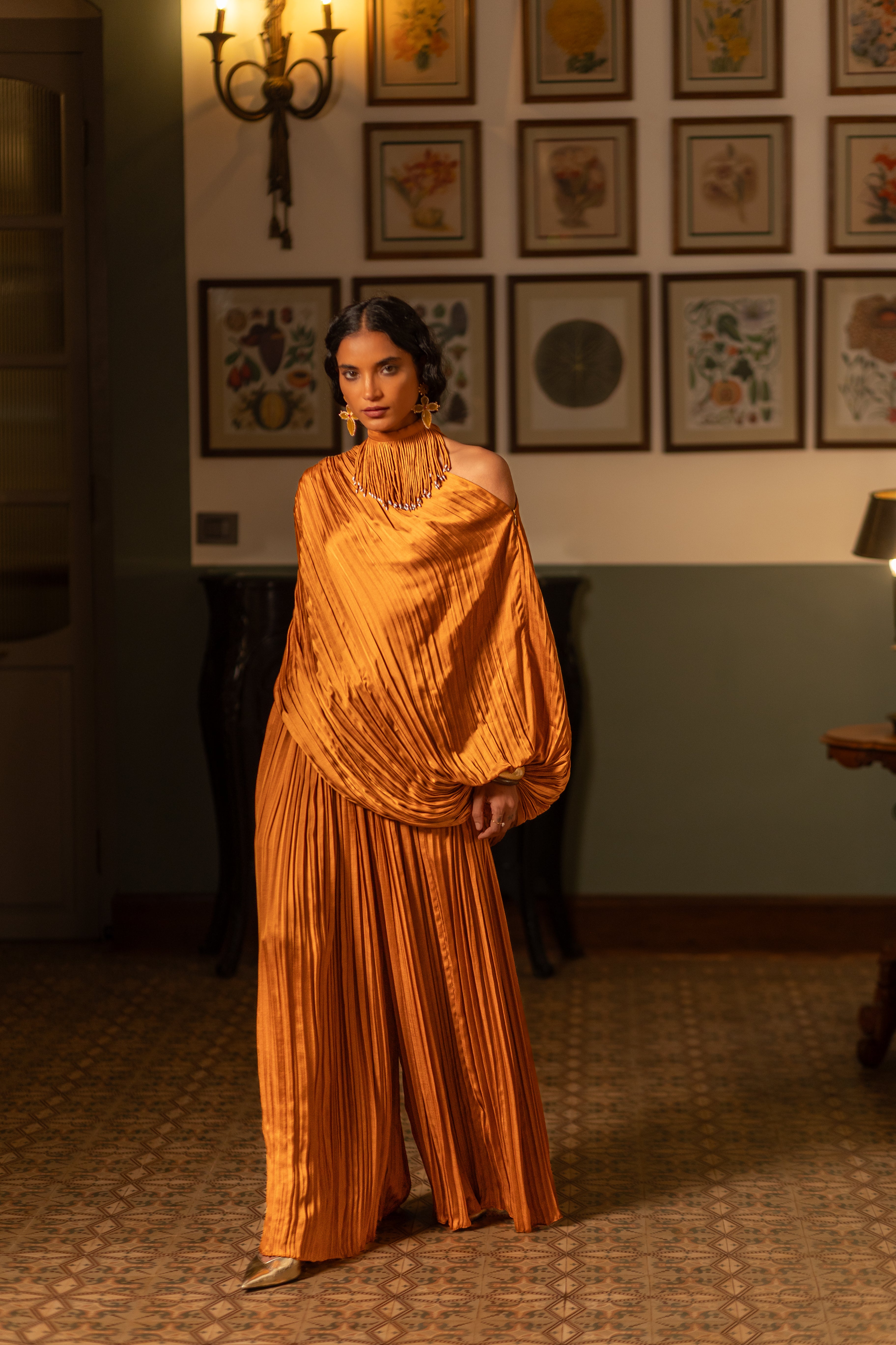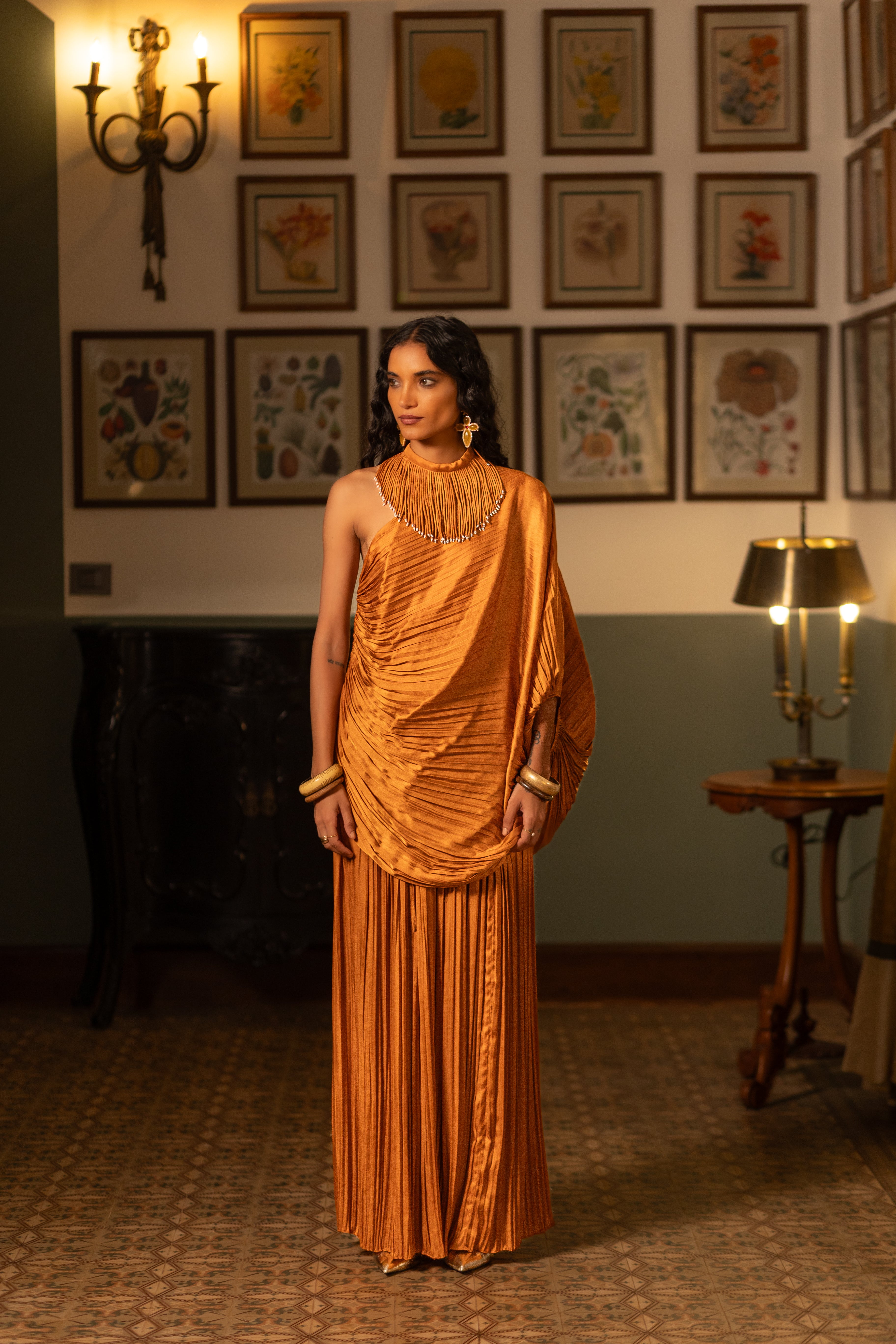 This fluid co-ord set is crafted in pleat-textured fabric, featuring a relaxed draped top & bustier paired with matching pants. It's easy to style with different layers, accessories or separates.