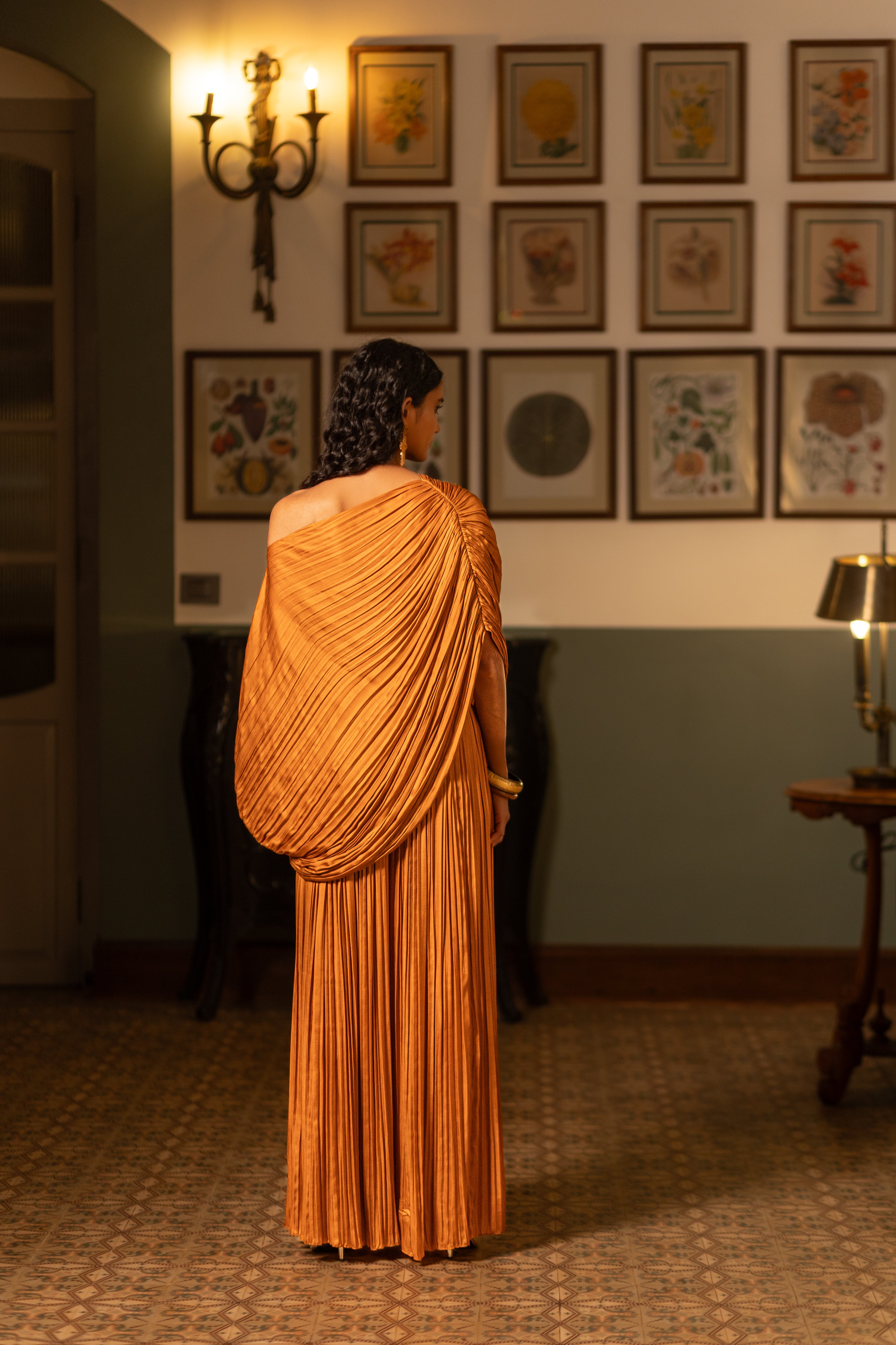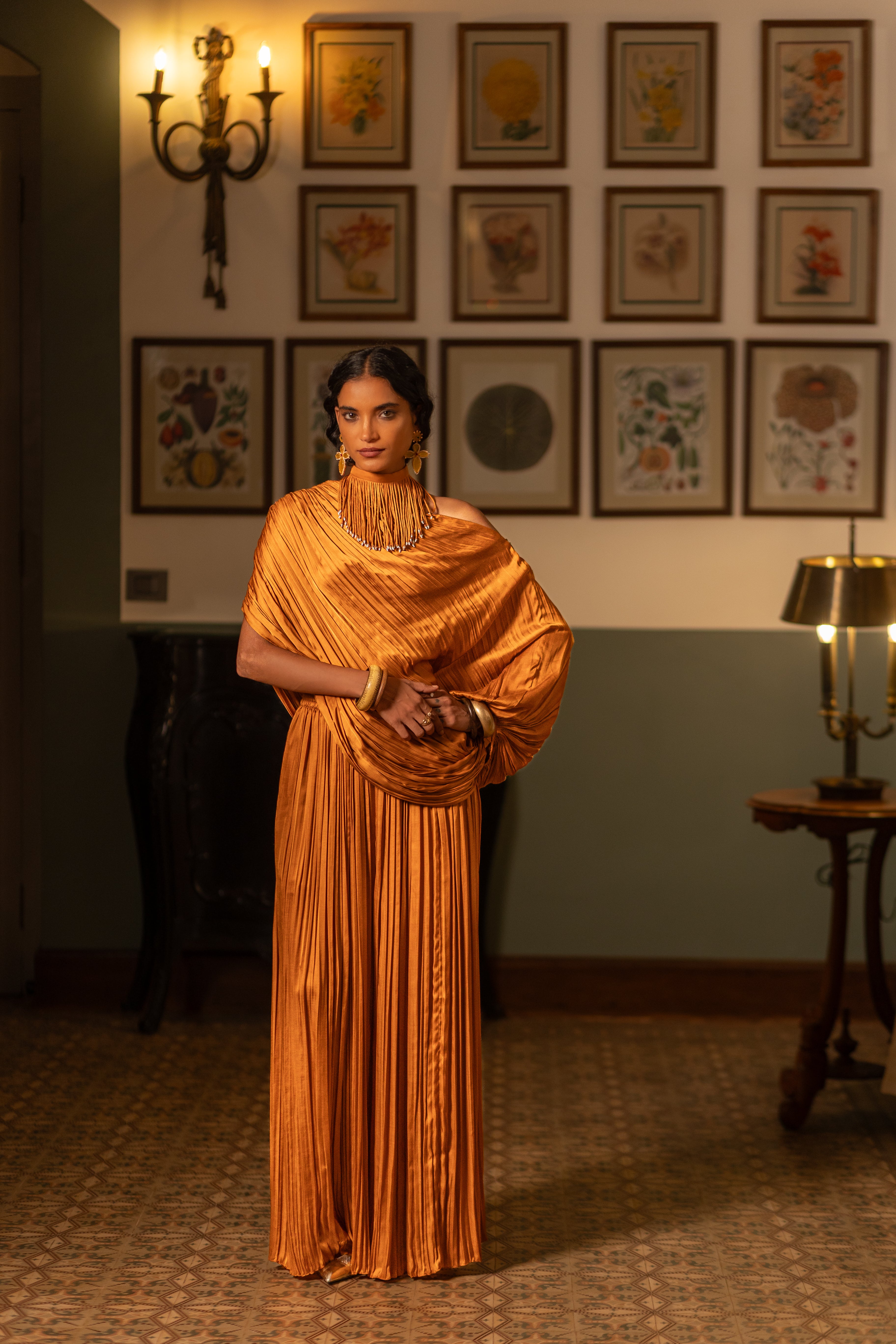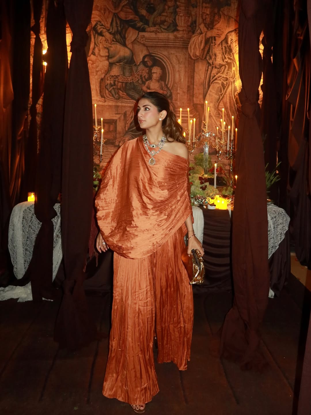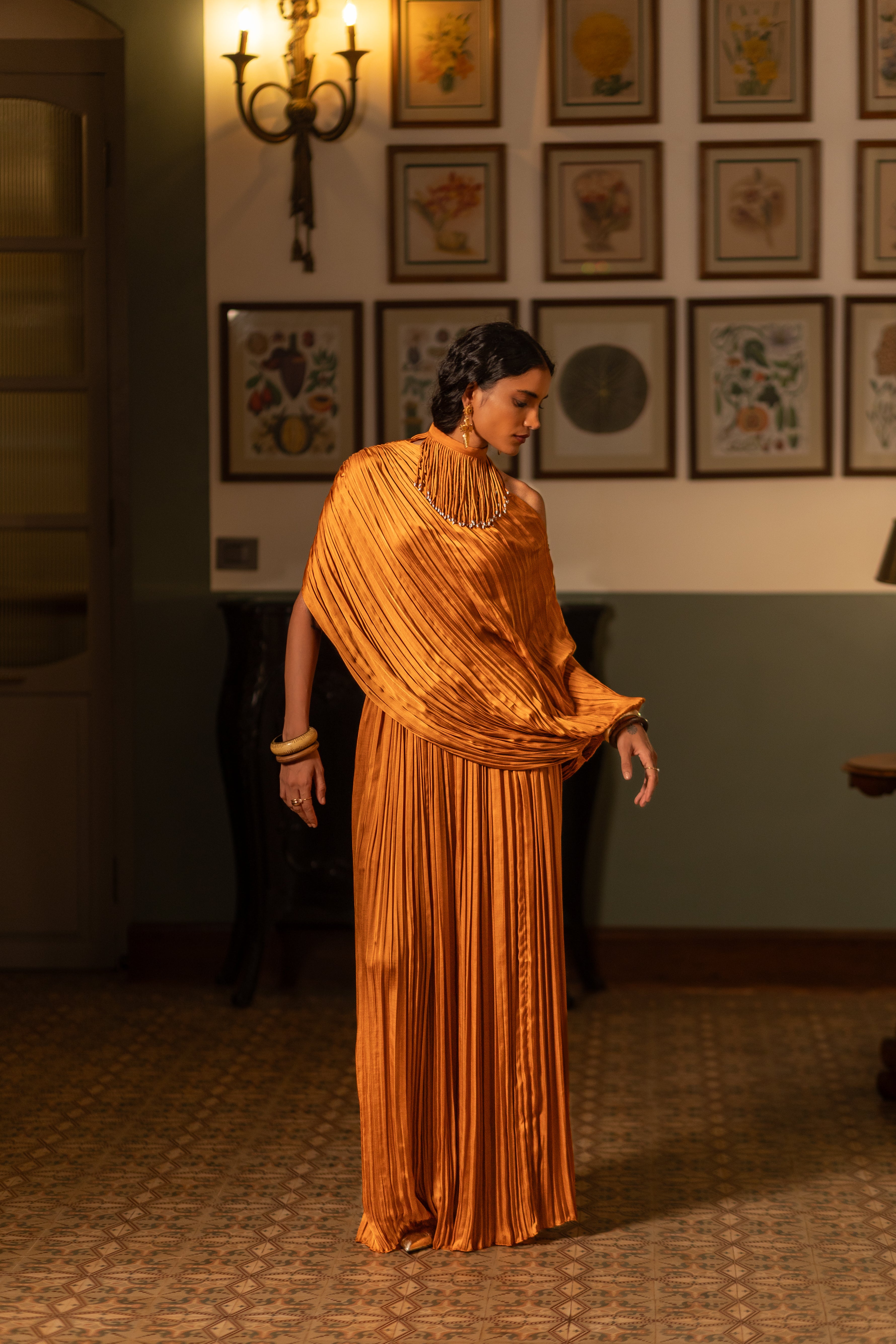 This fluid co-ord set is crafted in pleat-textured fabric, featuring a relaxed draped top & bustier paired with matching pants. It's easy to style with different layers, accessories or separates.