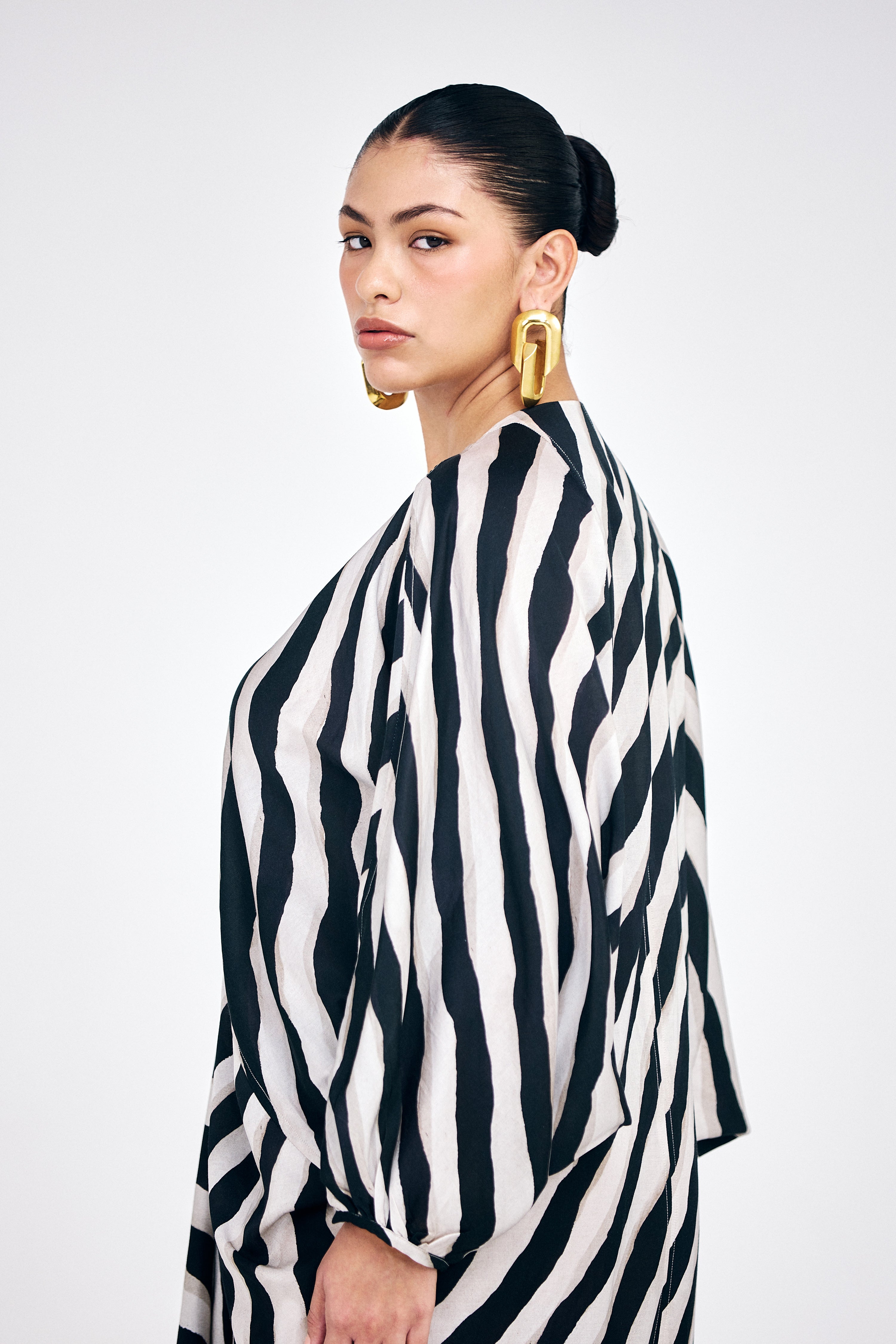 A fluid kaftan-style striped top in cotton-satin, Lightweight, breathable, and easy to wear — perfect for elevated everyday dressing