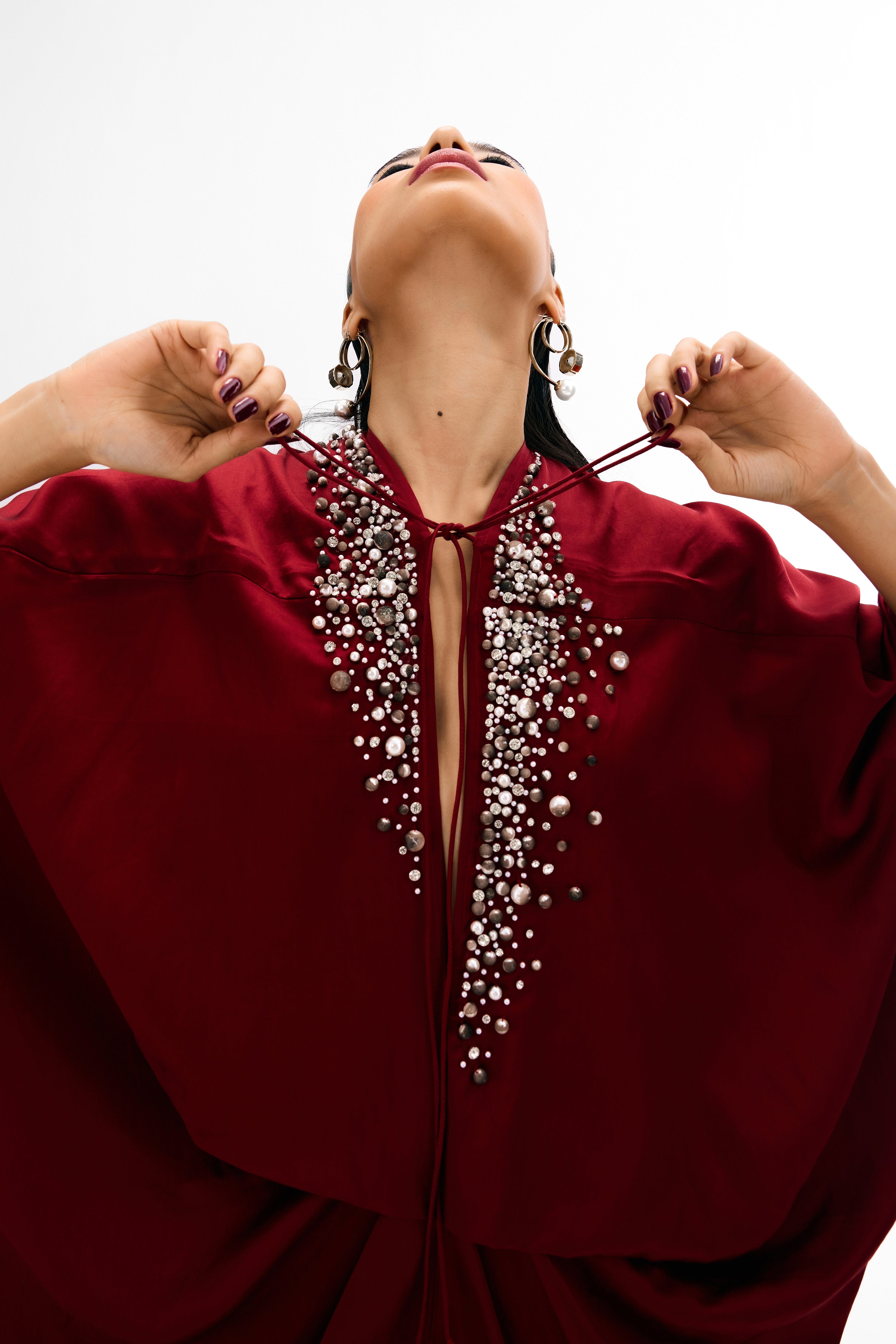This elegant kaftan exudes sophistication with its flowing silhouette and intricate plearl and stone embellishments around the neckline. The loose, billowy sleeves and graceful drape make it a perfect statement piece for evening wear or a luxurious look.