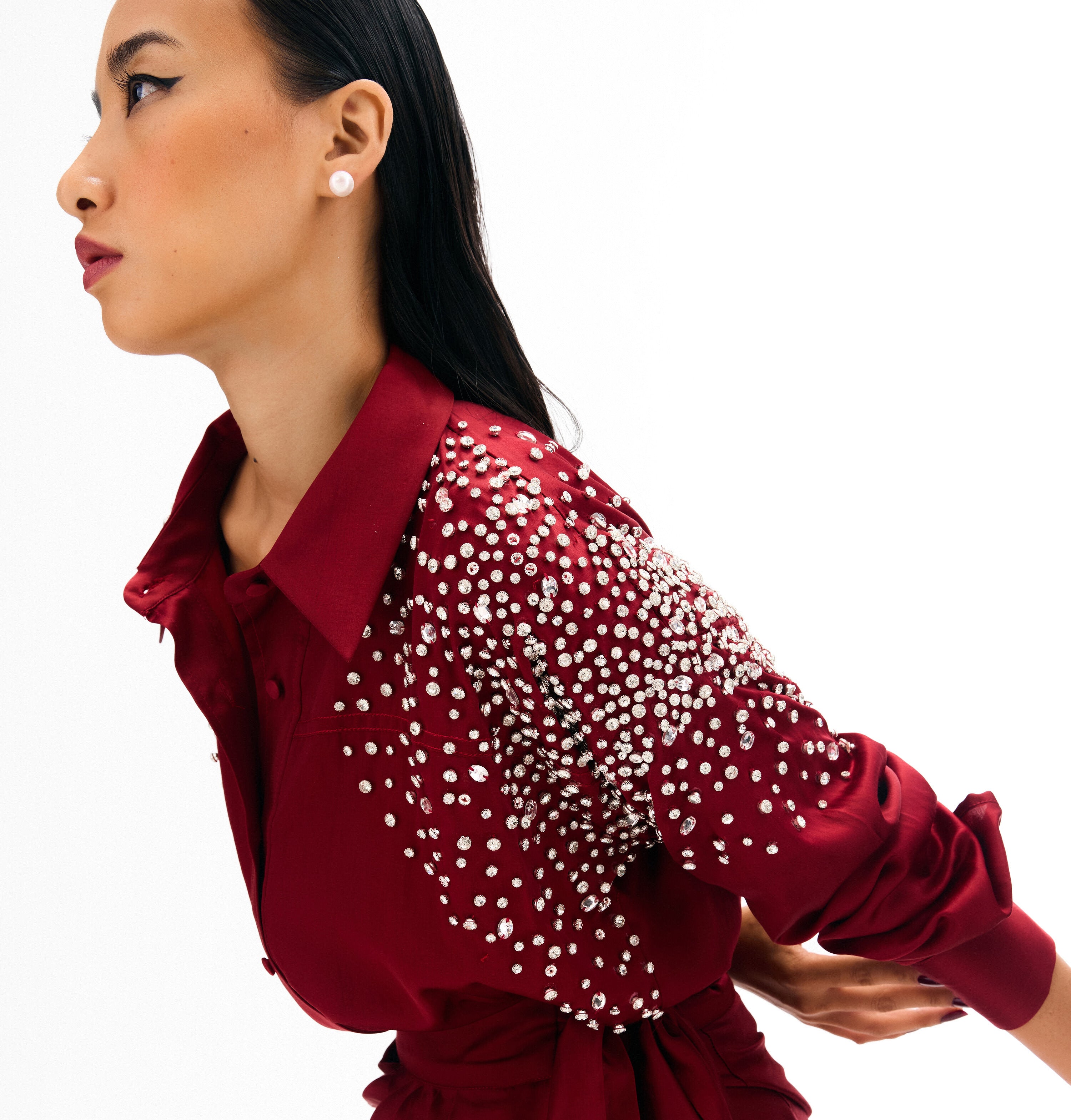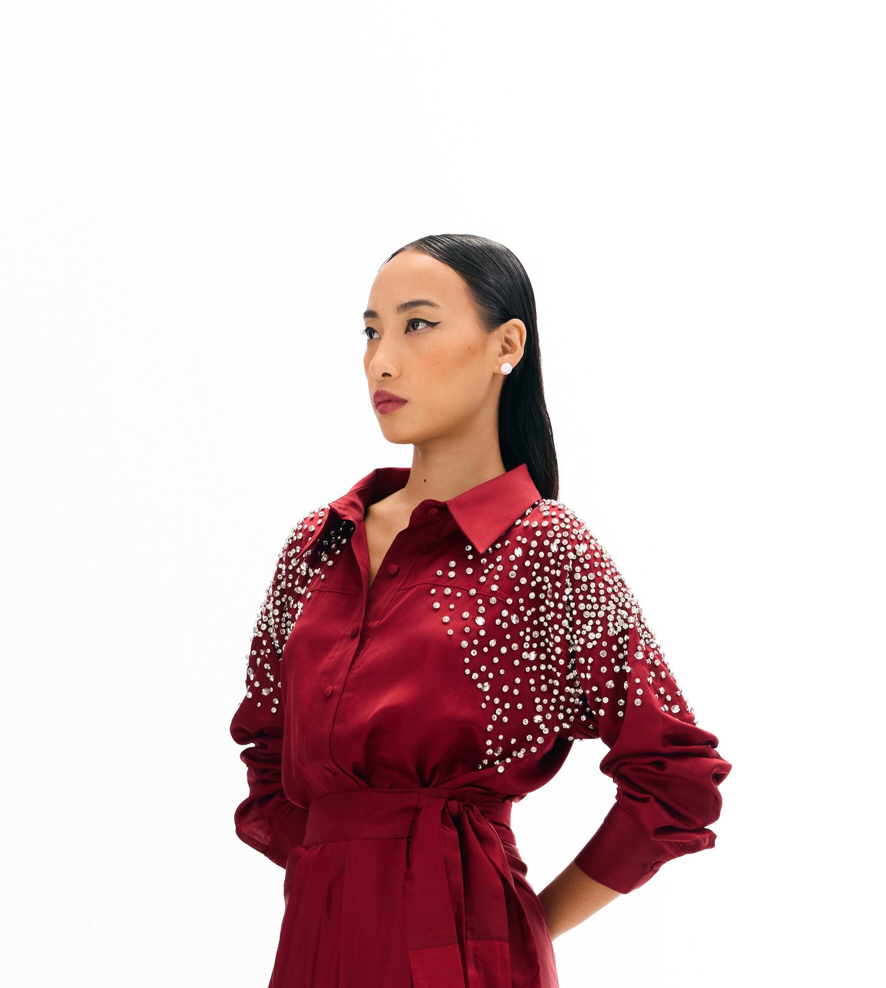 This elegant shirt is crafted from luxurious fabric and features intricate stone embroidery on the shoulders and sleevesl. With a classic button-down front and a tailored fit, it's a perfect blend of timeless sophistication and modern elegance, ideal for both formal occasions and stylish daywear.