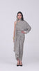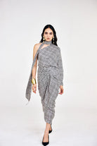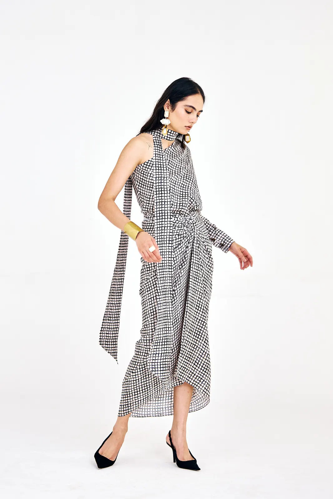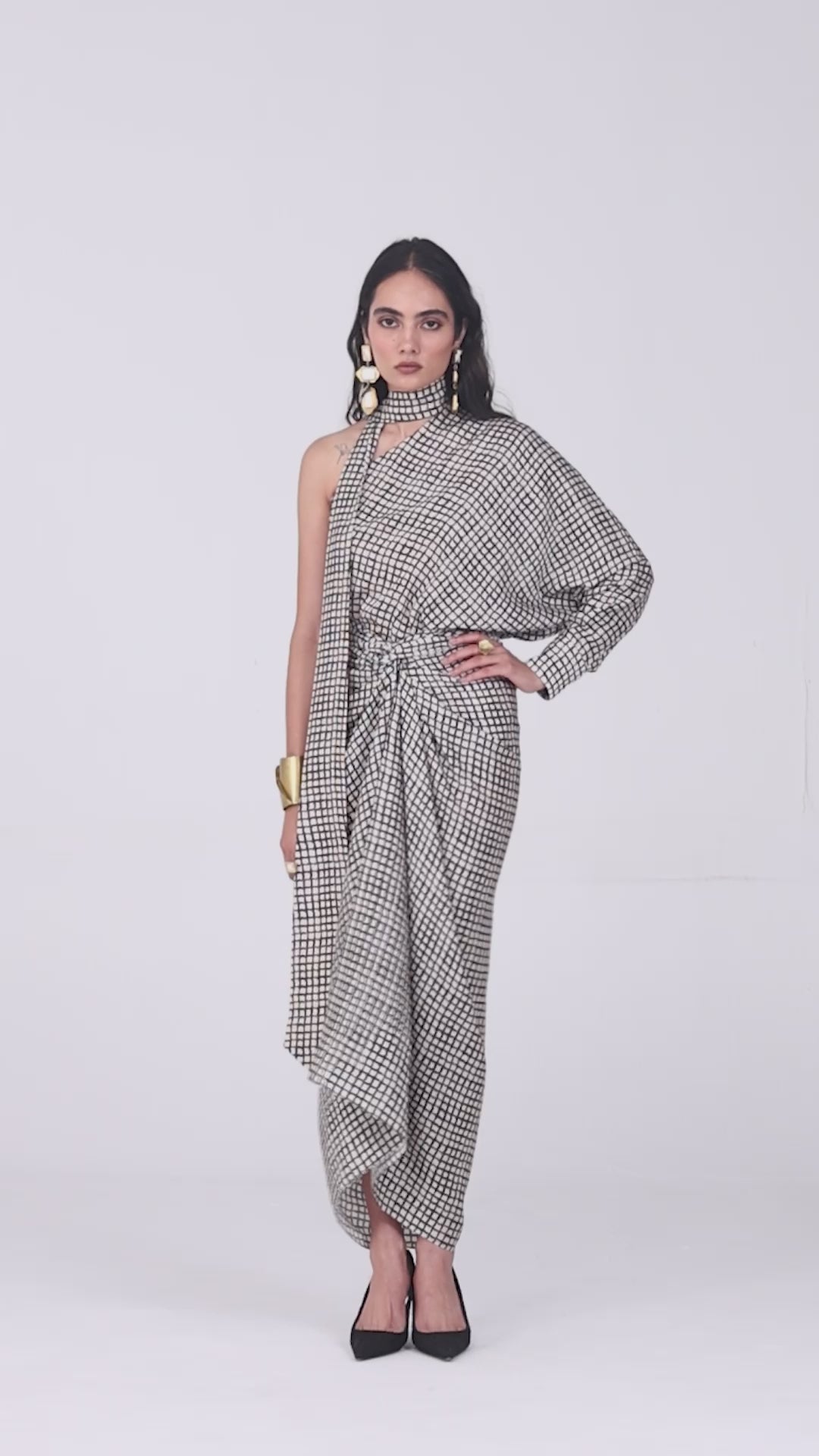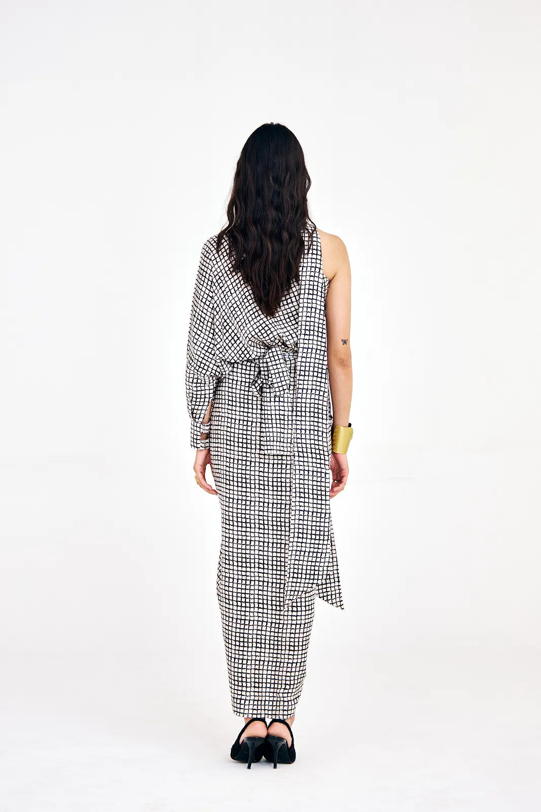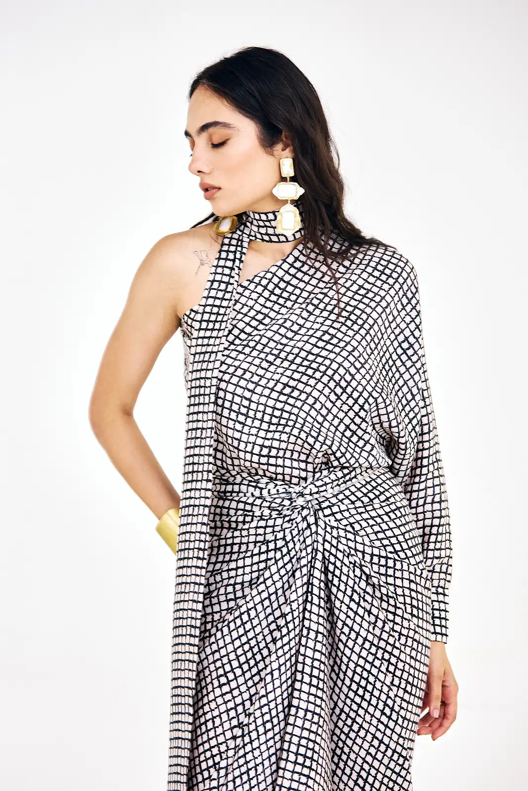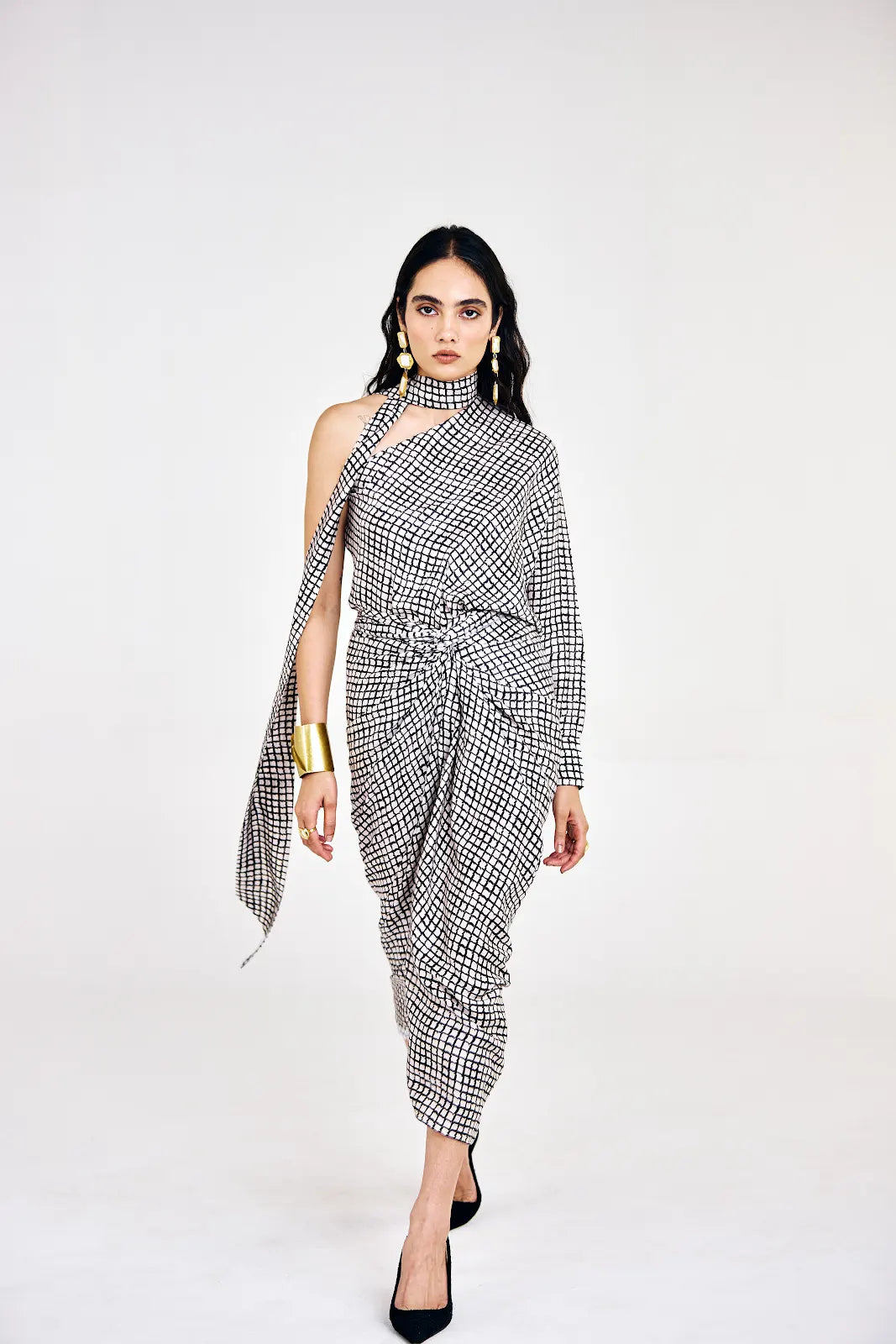 This coordinated set features a black-and-white abstract striped one-shoulder top with necktie detailing, paired with a matching cotton satin draped long skirt.Wear them together or style them separately, depending on your mood and ocassion.