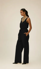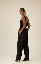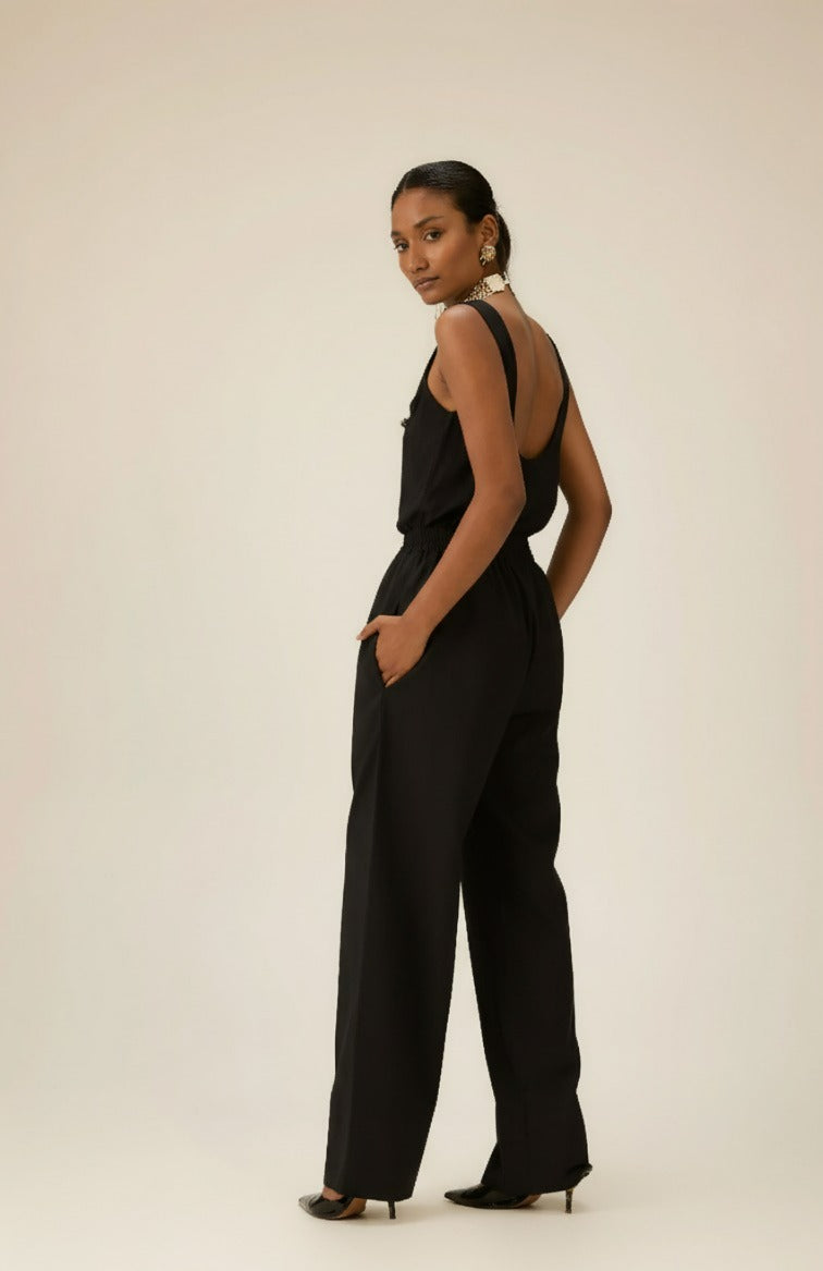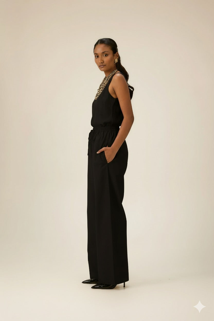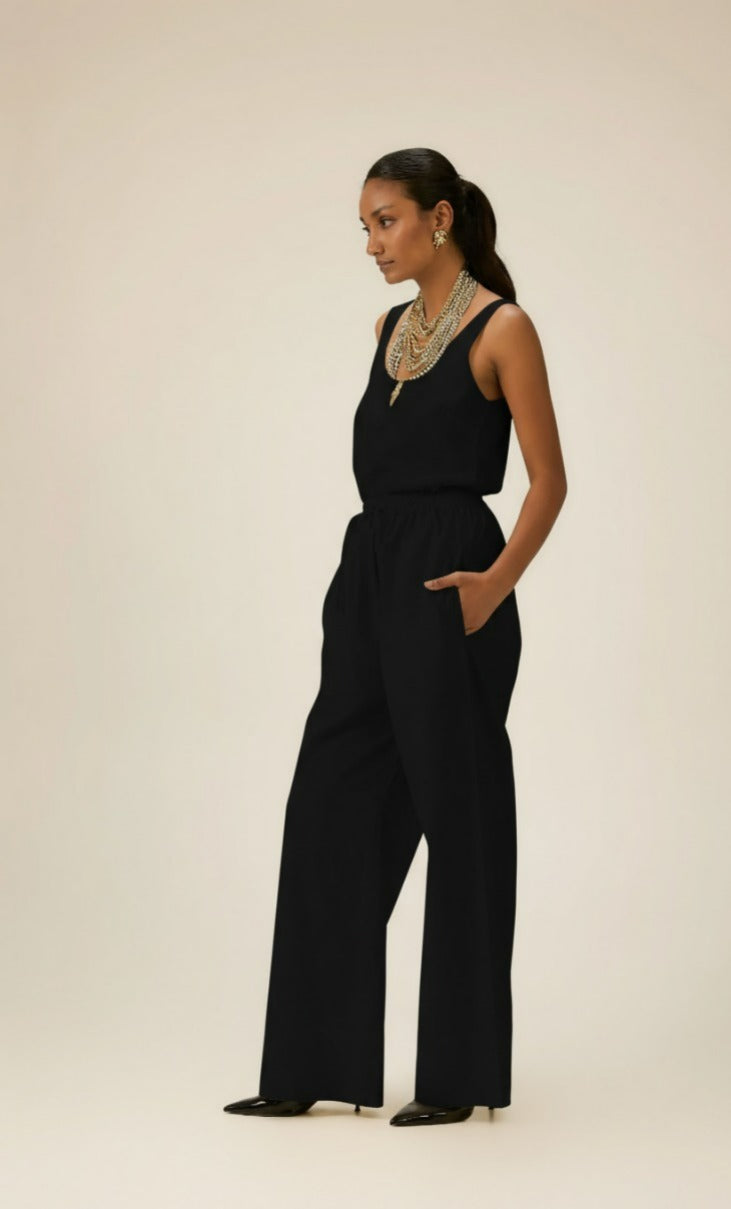 This garment features a relaxed, fluid silhouette with a sleeveless, softly draped top and wide-leg, high-waisted pants gathered at the waist for effortless, modern elegance and movement.