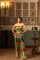 This structured underbust corset features contoured paneling and front bust closures, designed to sculpt the waist and create a dramatic hourglass silhouette. Paired with a Amma pant that falls effortlessly on the body, the set brings together form and fluidity