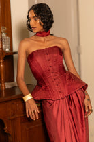 This structured underbust corset features contoured paneling and front bust closures, designed to sculpt the waist and create a dramatic hourglass silhouette..