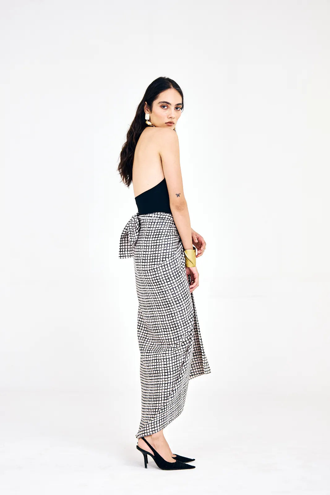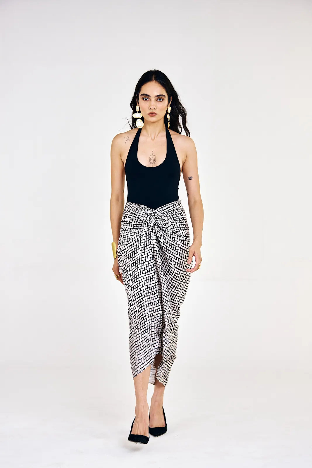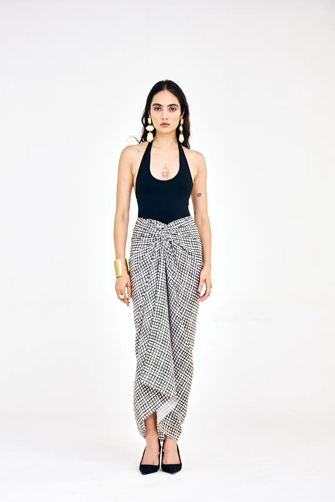 This draped skirt in black-and-white abstract stripes is crafted in cotton satin and shaped in the classic Nouria silhouette. Its relaxed fit and elegant draping make it a versatile piece, style it with matching tops for a coordinated look or mix and match with other wardrobe staples for elevated everyday styling.