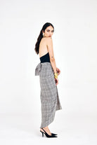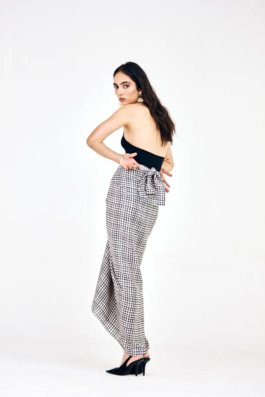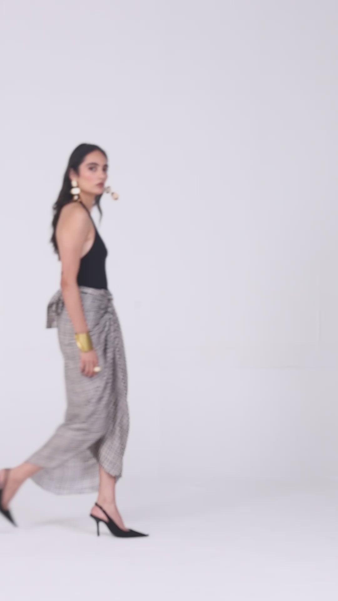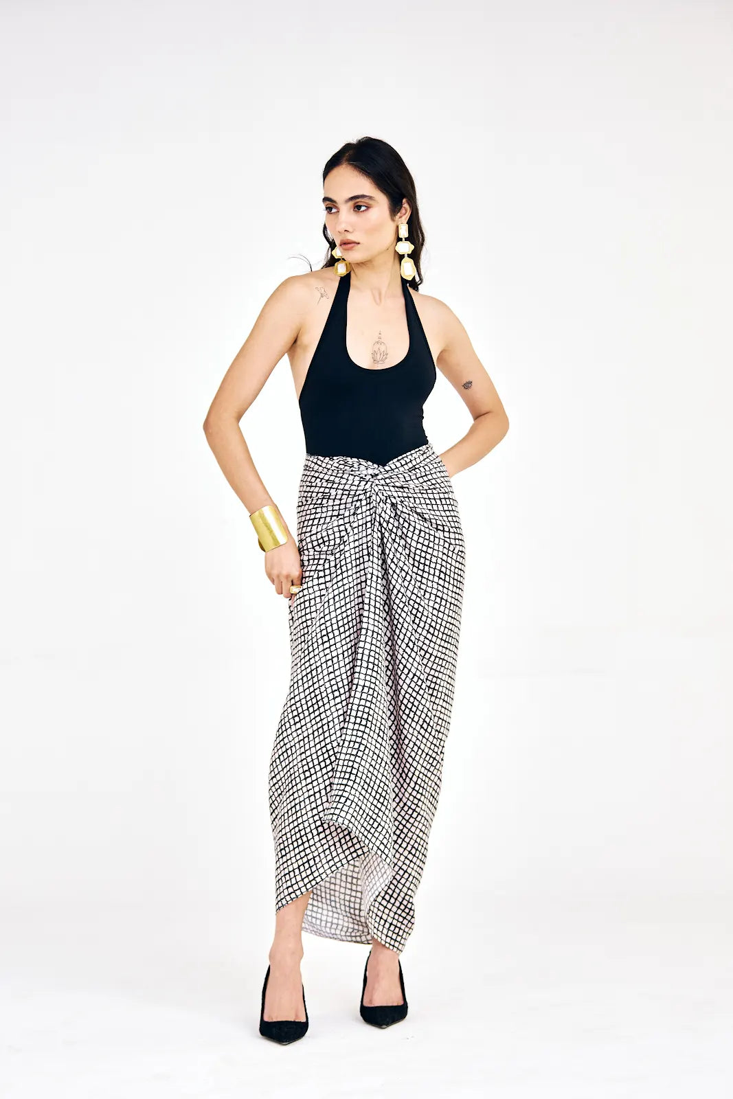 This draped skirt in black-and-white abstract stripes is crafted in cotton satin and shaped in the classic Nouria silhouette. Its relaxed fit and elegant draping make it a versatile piece, style it with matching tops for a coordinated look or mix and match with other wardrobe staples for elevated everyday styling.